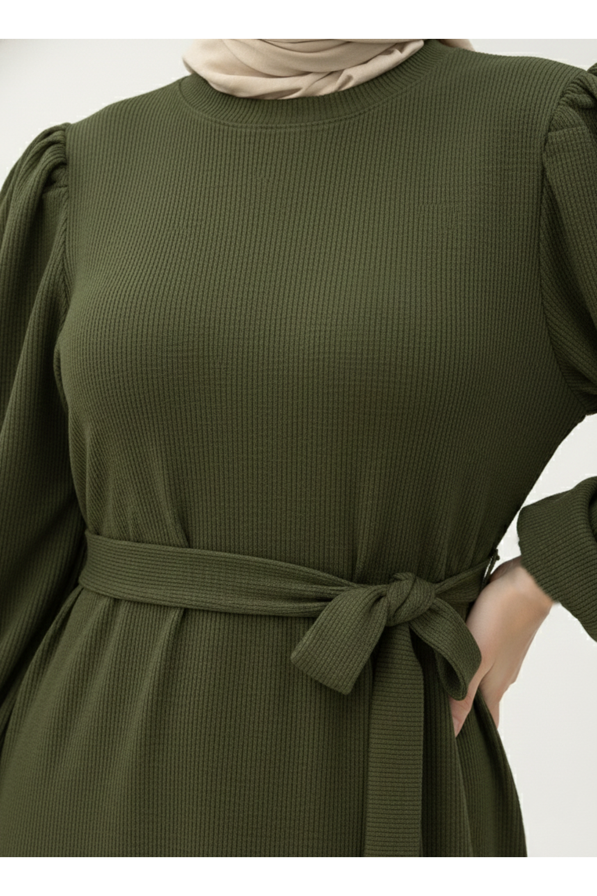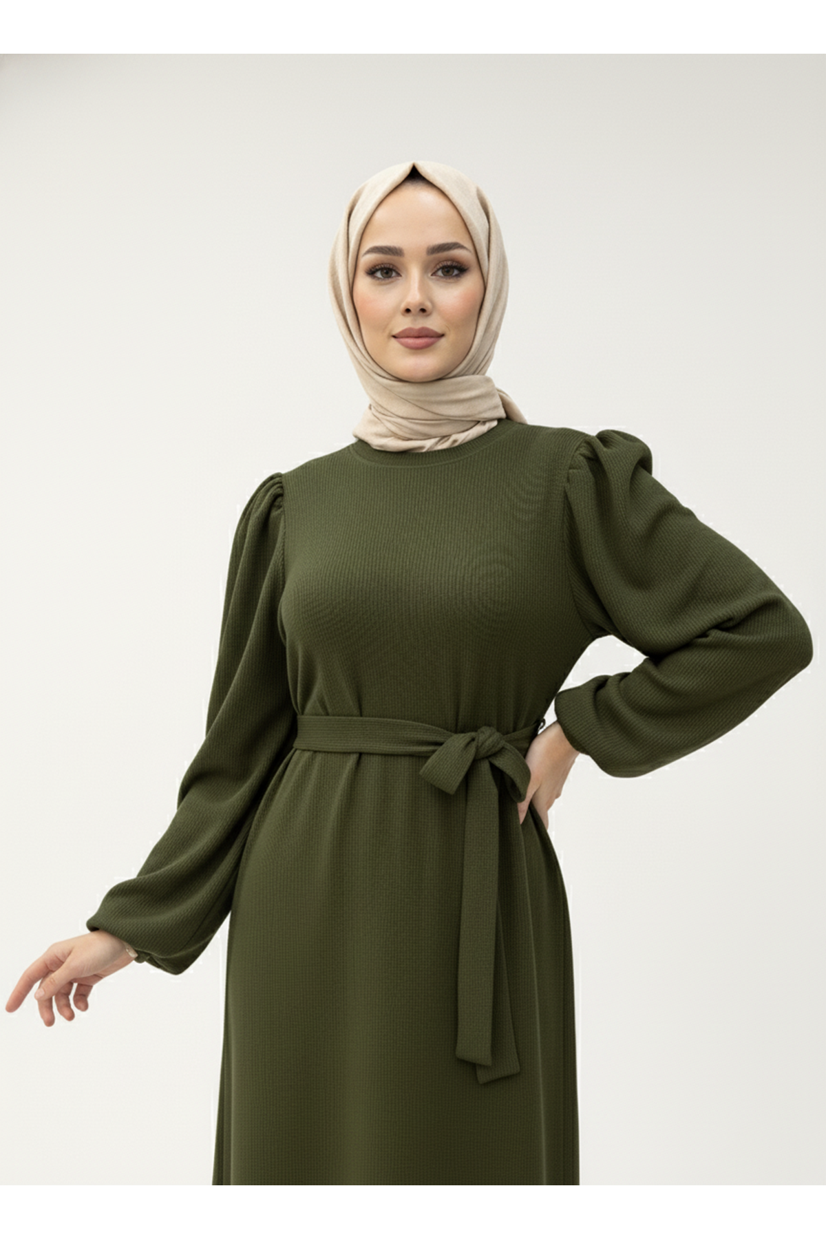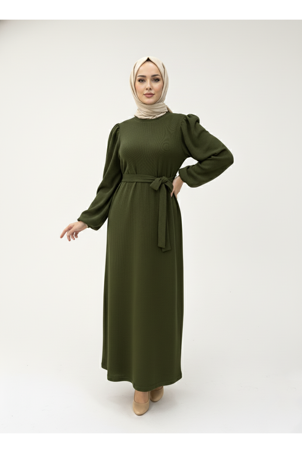 Balon Kol Örme Triko Elbise-Haki