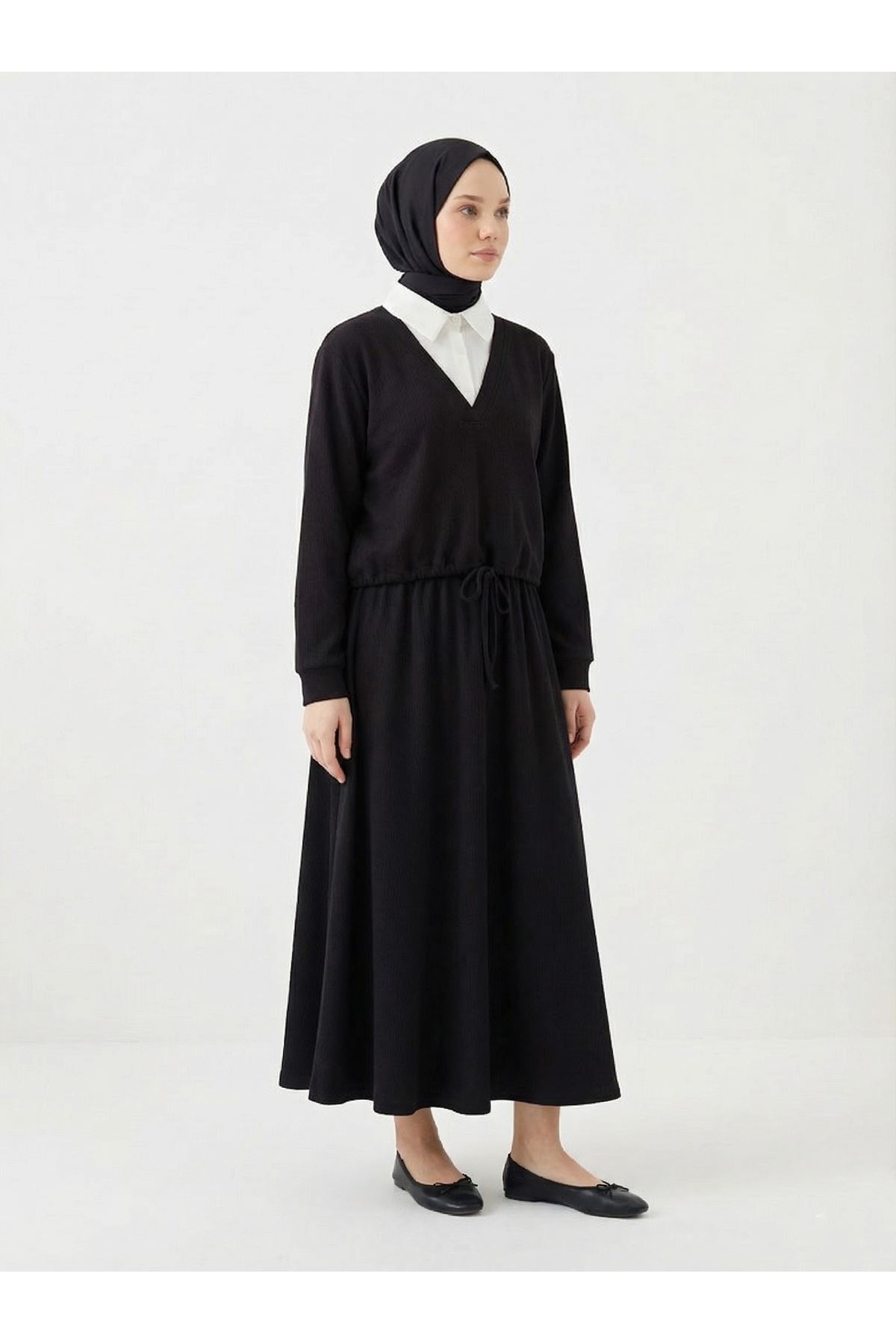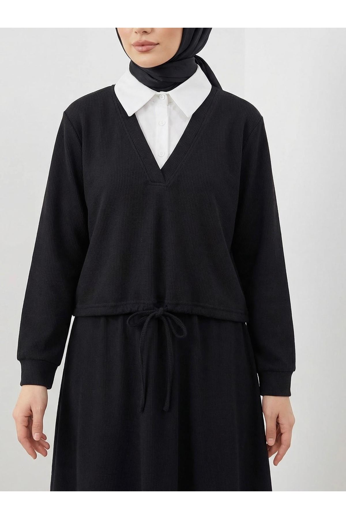Beyaz Yaka Detaylı Örme Triko Takım-Siyah
