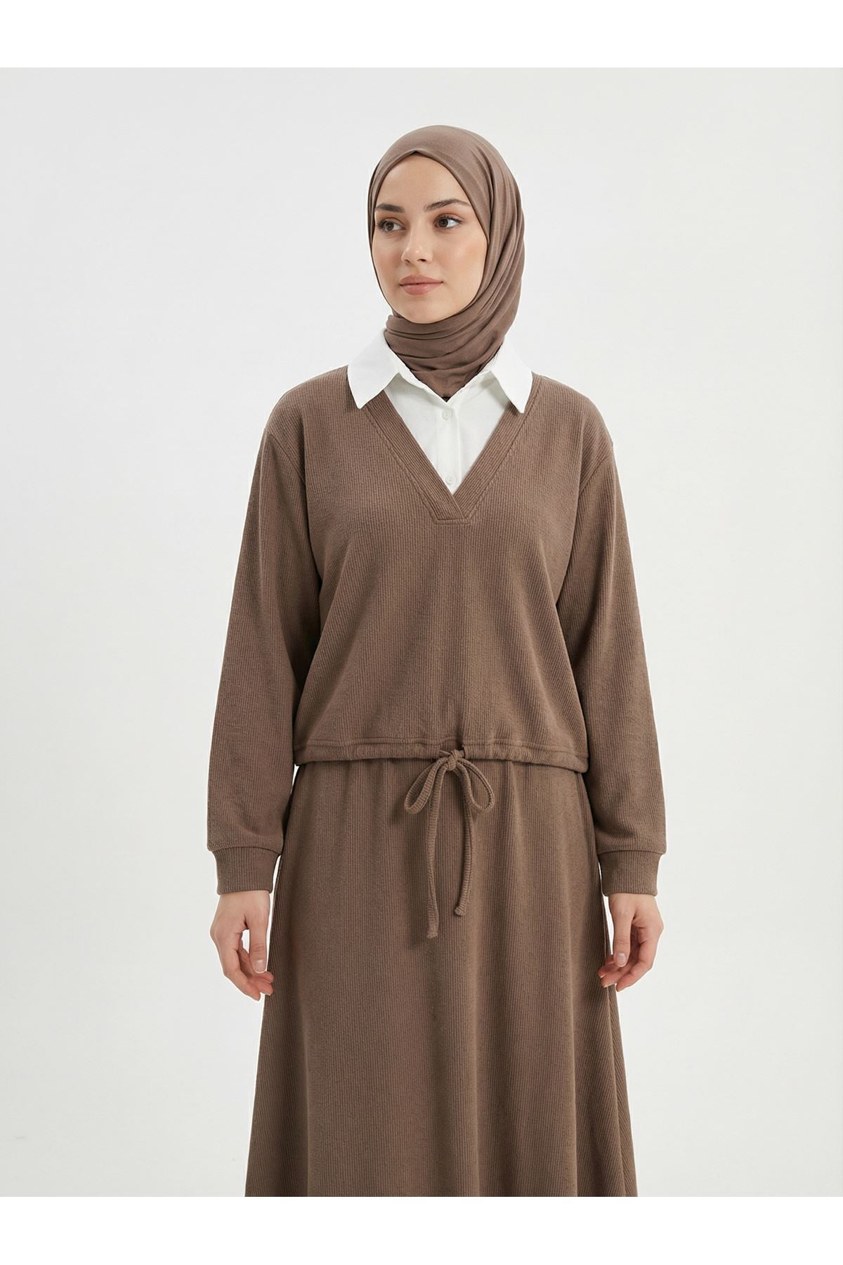 Beyaz Yaka Detaylı Örme Triko Takım-Vizon