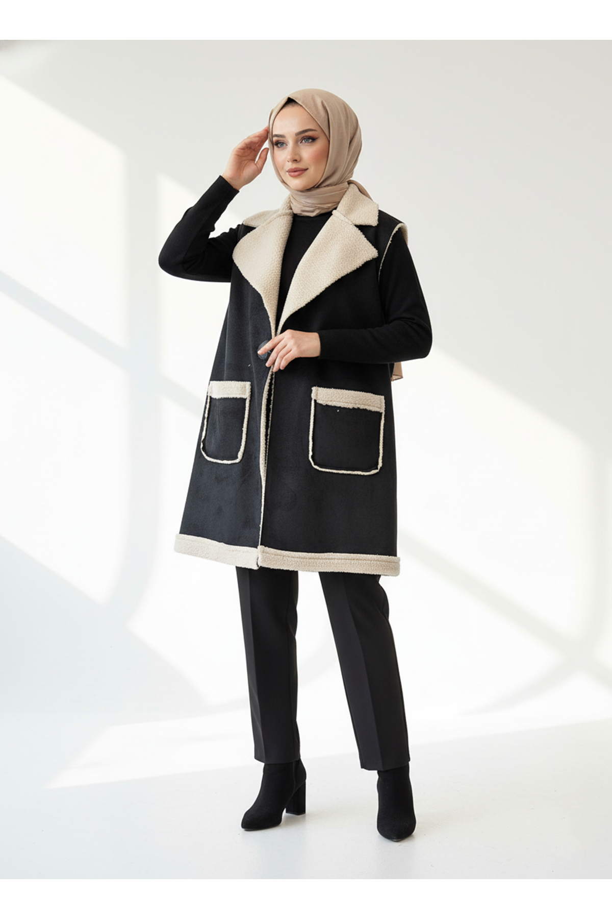 Deri Düğme Aksesuarlı Uzun Yelek-Siyah