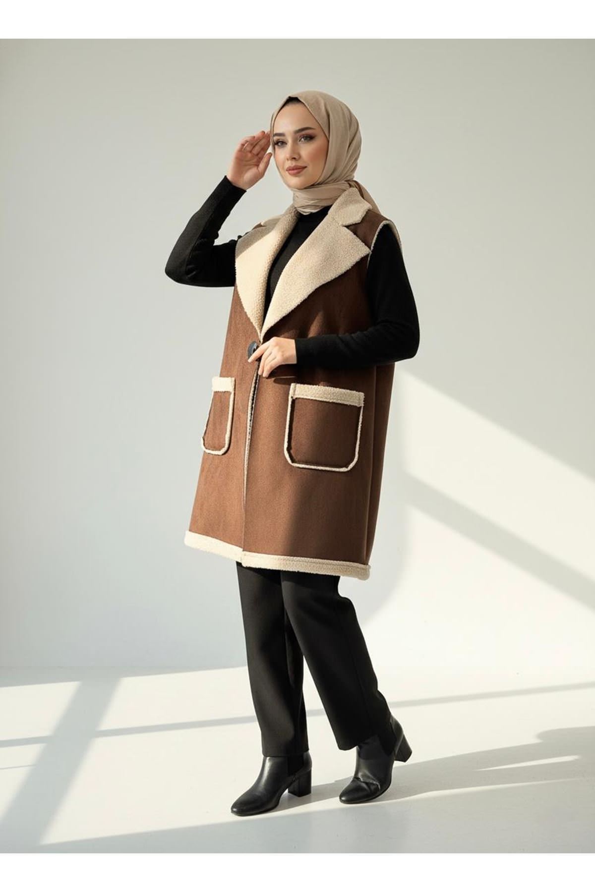Deri Düğme Aksesuarlı Uzun Yelek-Taba