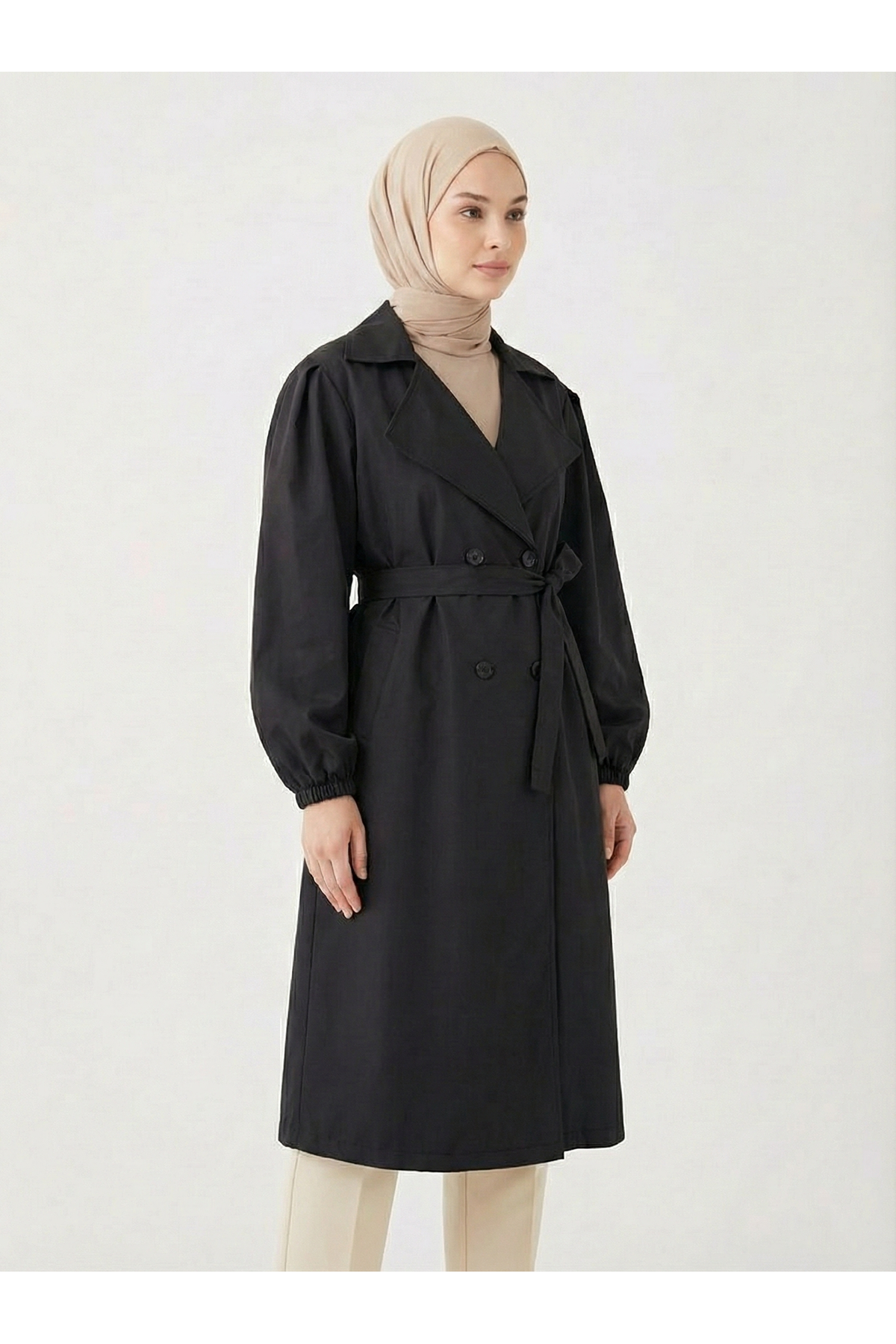 Düğmeli Kruveze Uzun Trenç-Siyah