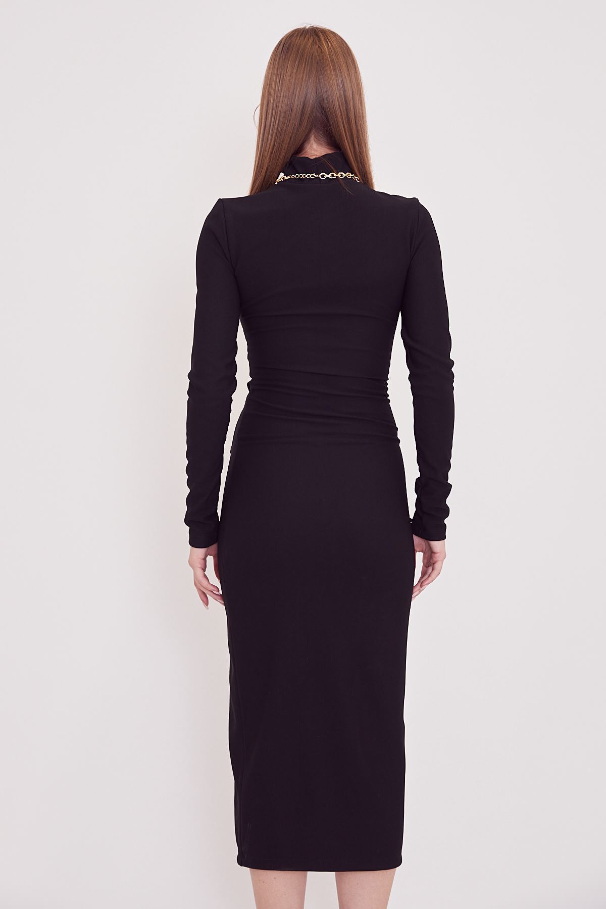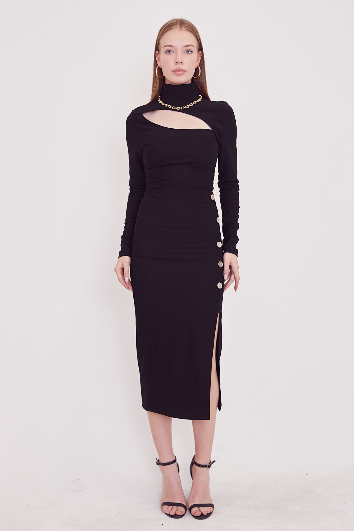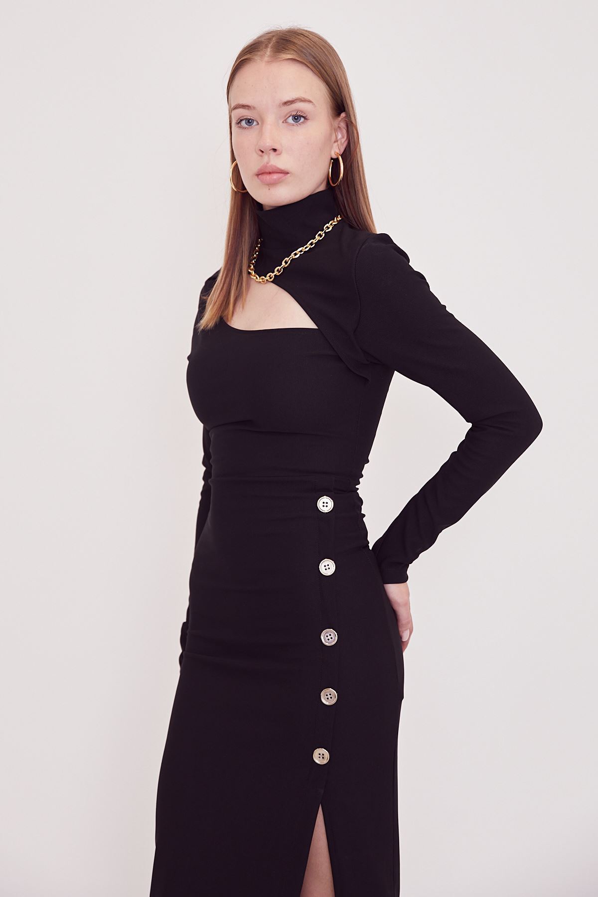 Düğmeli Yırtmaçlı Elbise-Siyah