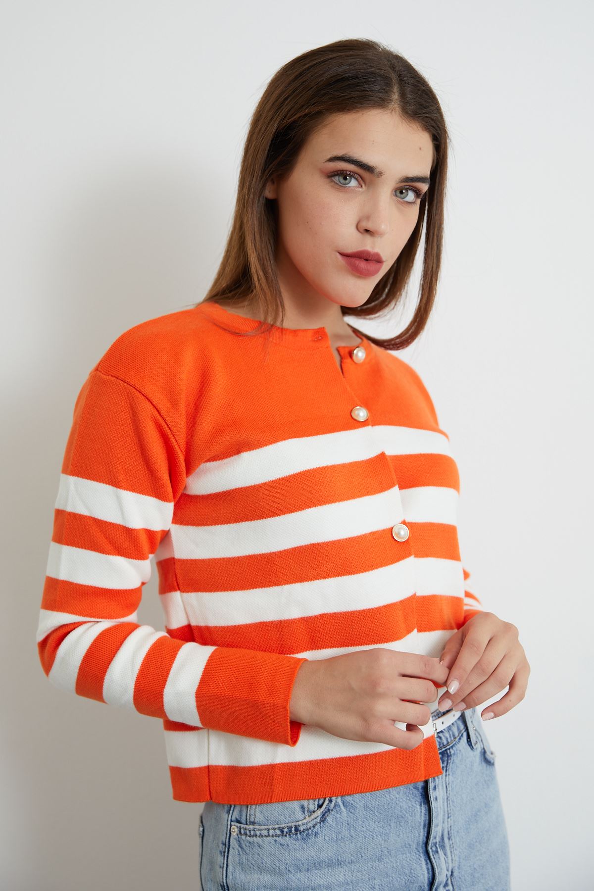 İnce Çizgi Gold Düğmeli Hırka-Oranj