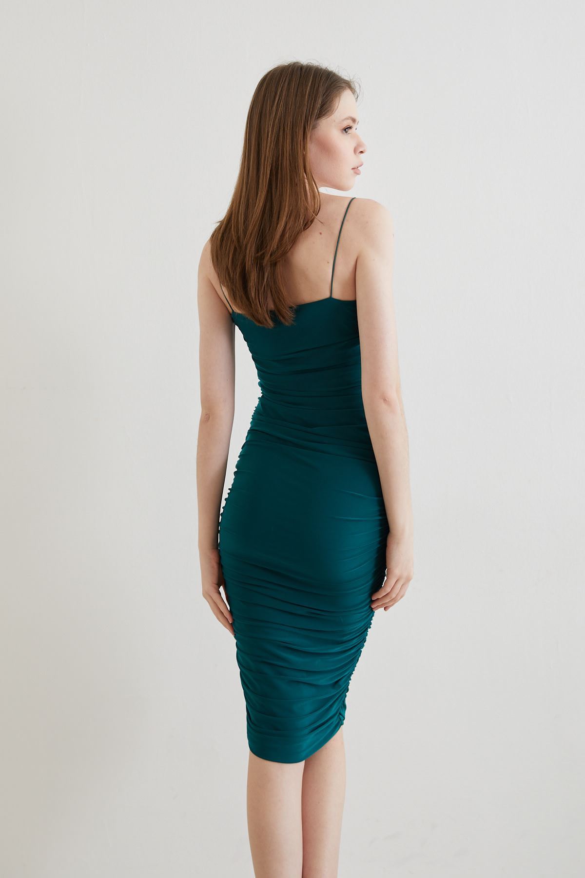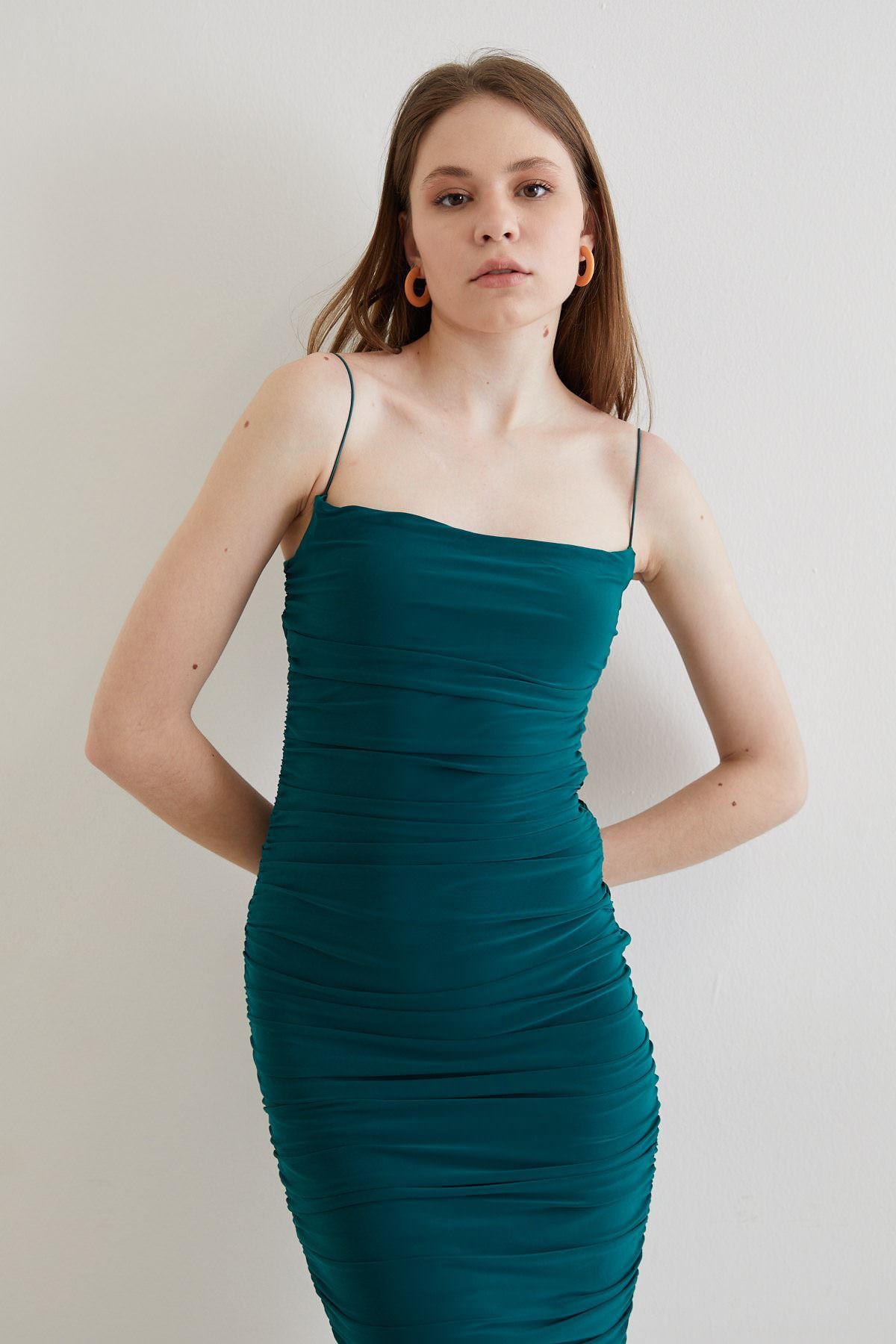 İp Askılı Büzgülü Elbise-Zümrüt Yeşili