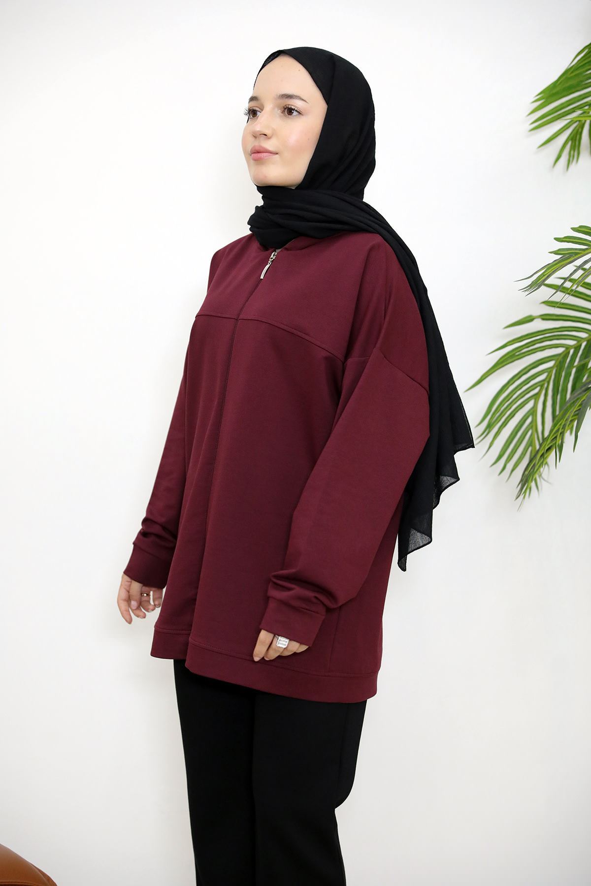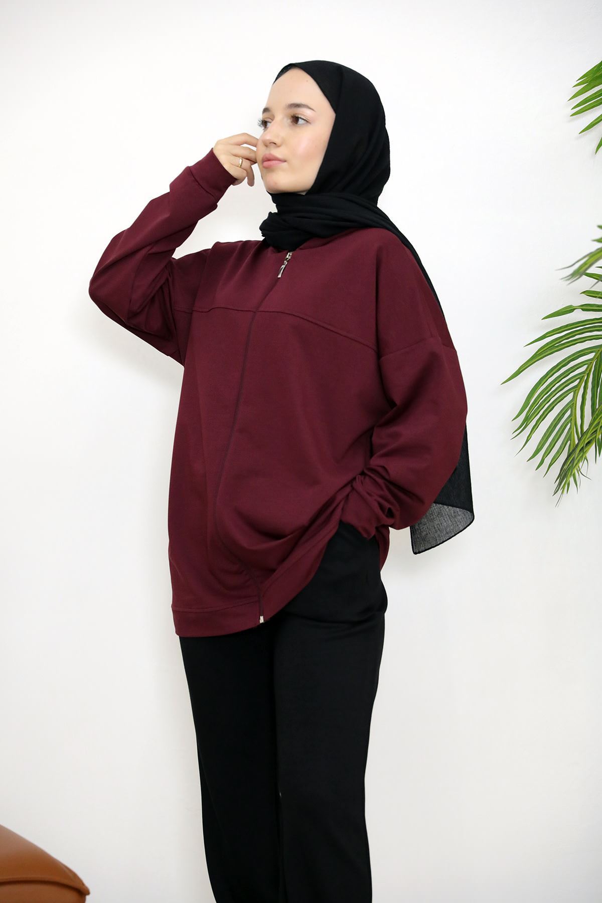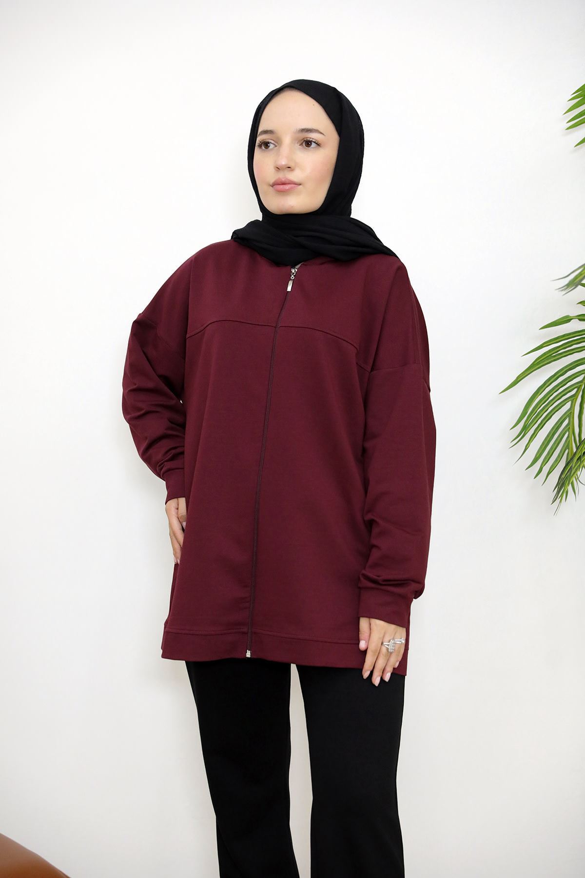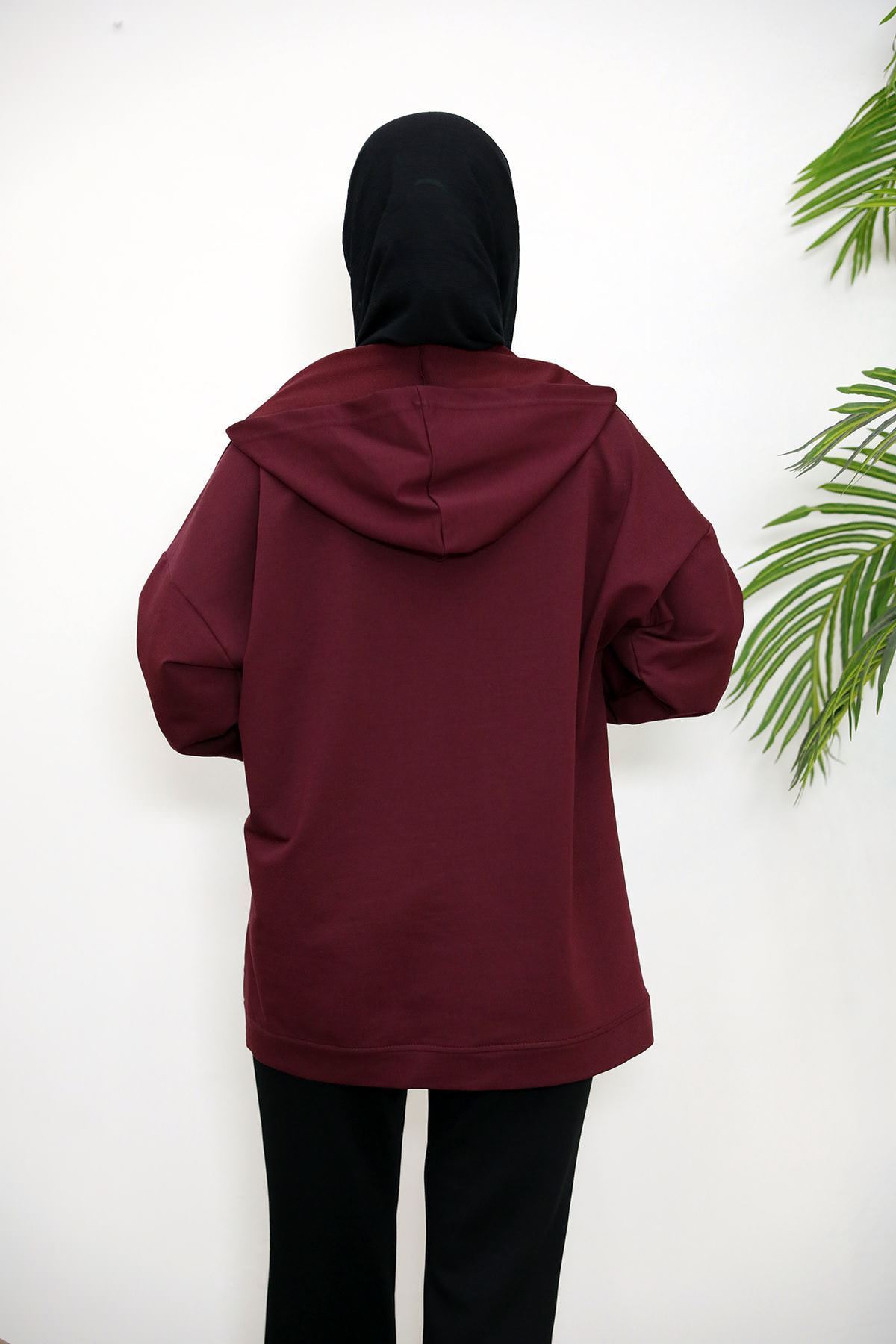 Kapşonlu Fermuar Detay Hırka-Bordo