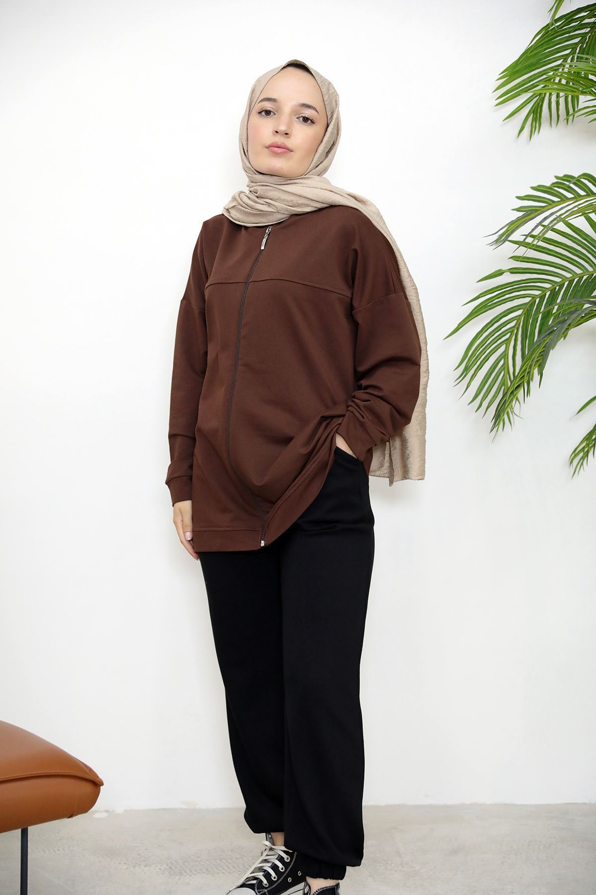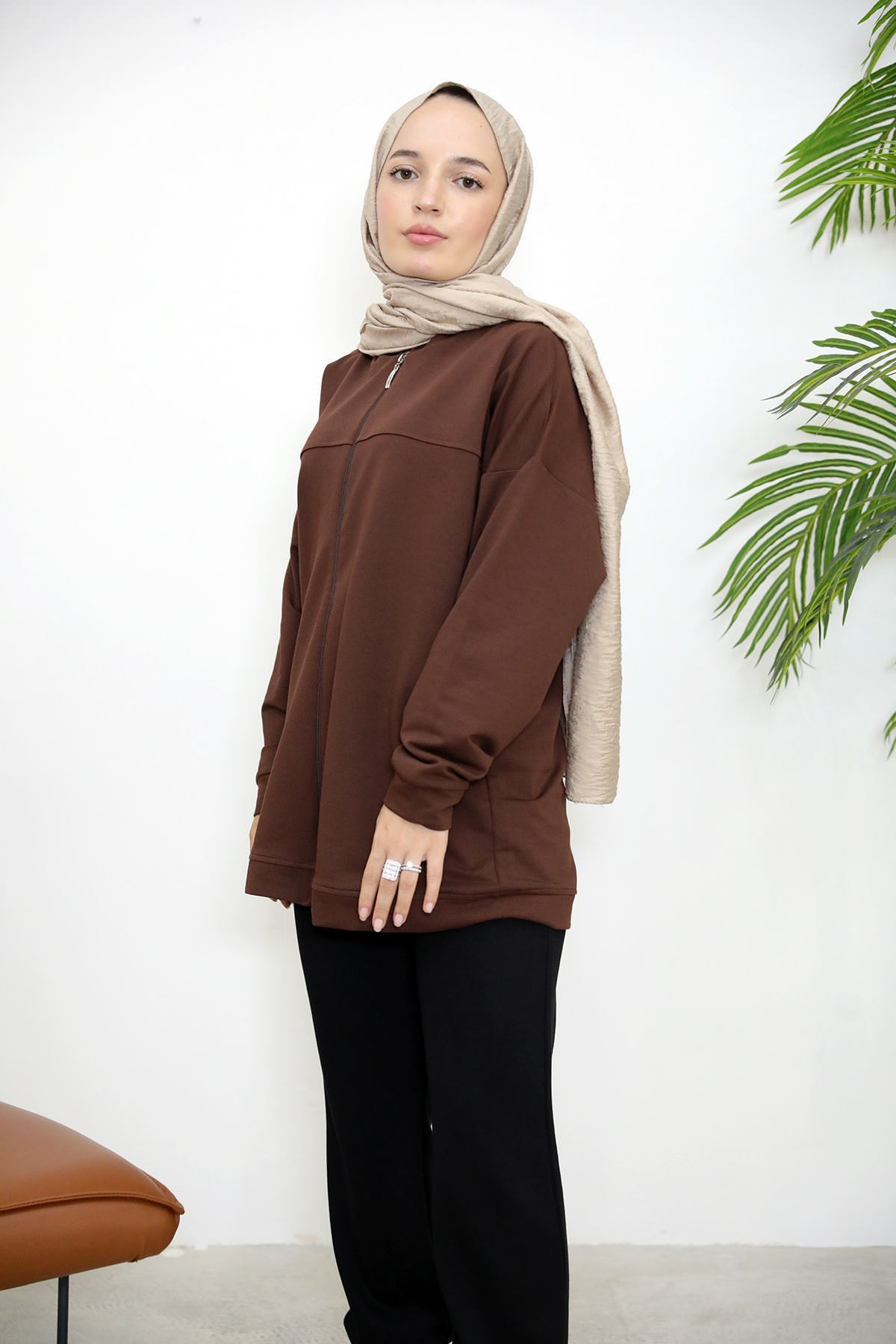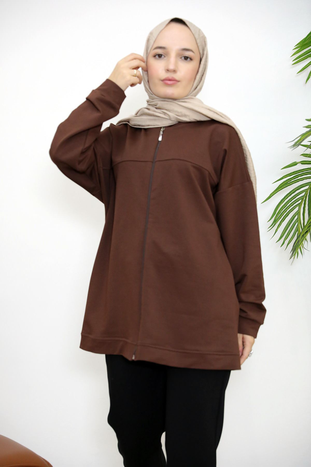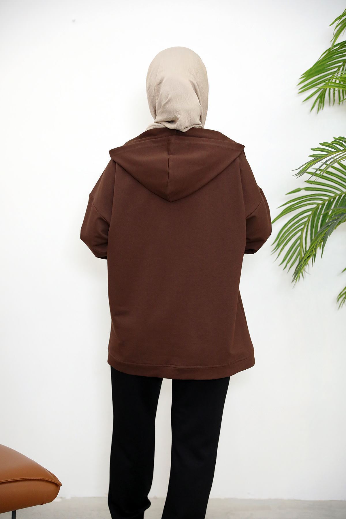Kapşonlu Fermuar Detay Hırka-Kahve