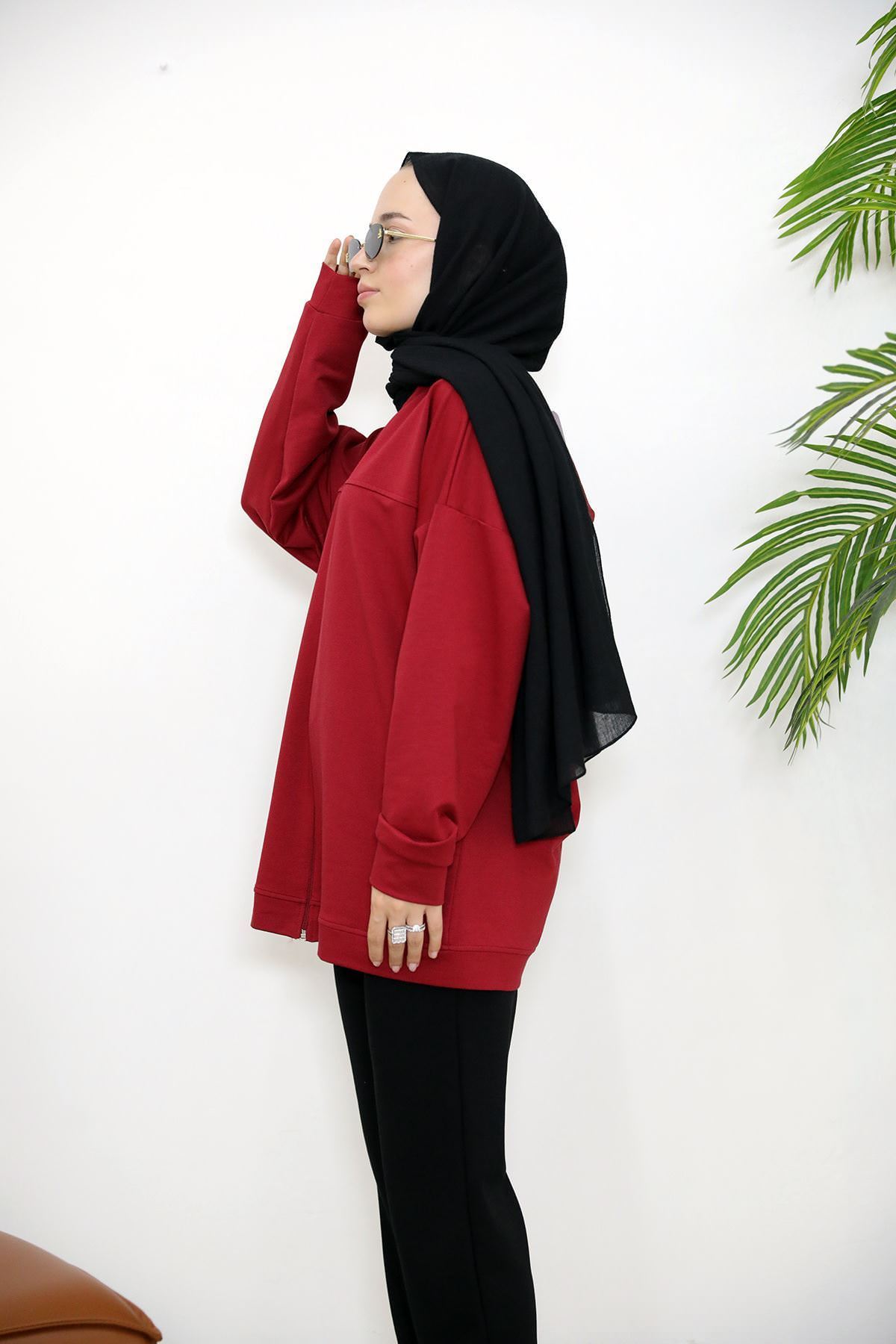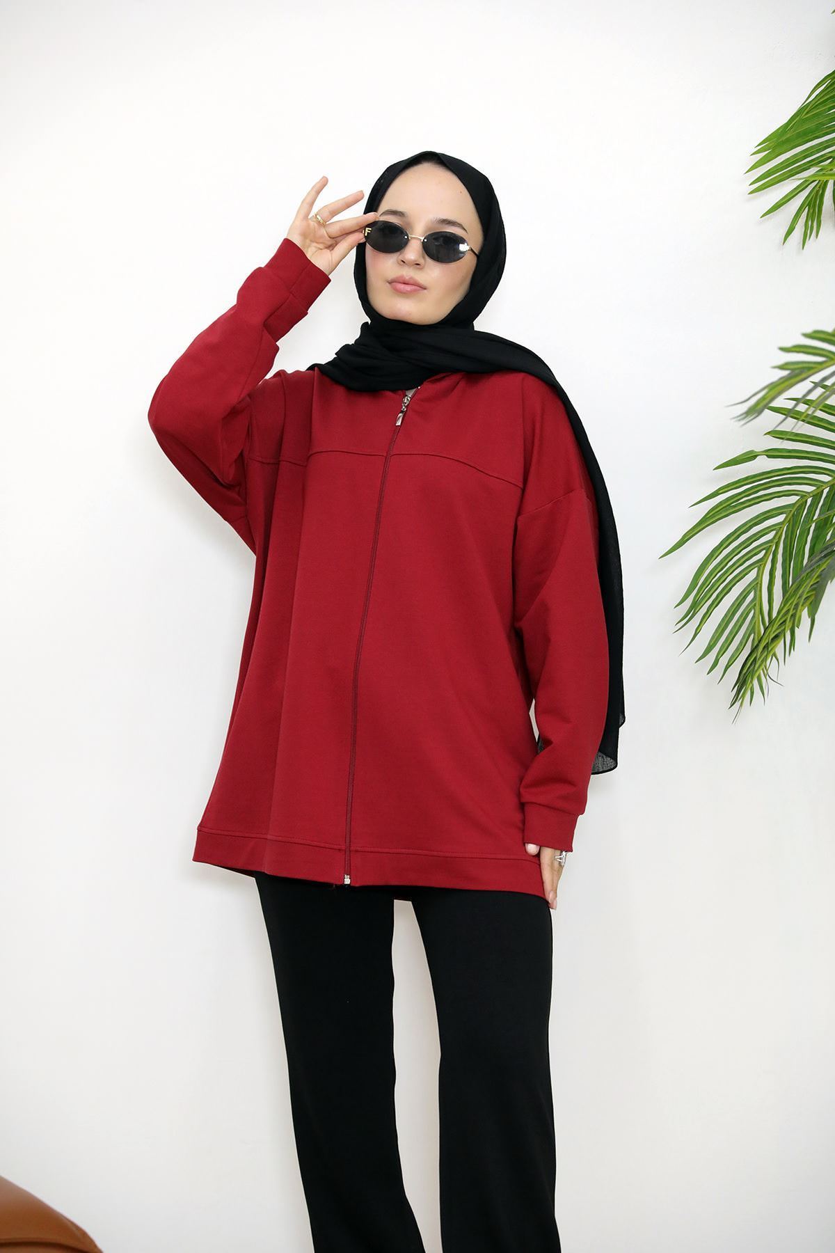 Kapşonlu Fermuar Detay Hırka-Kırmızı
