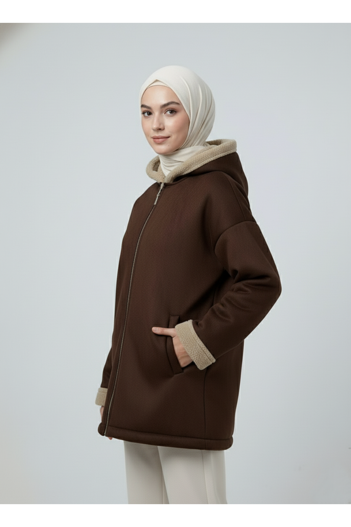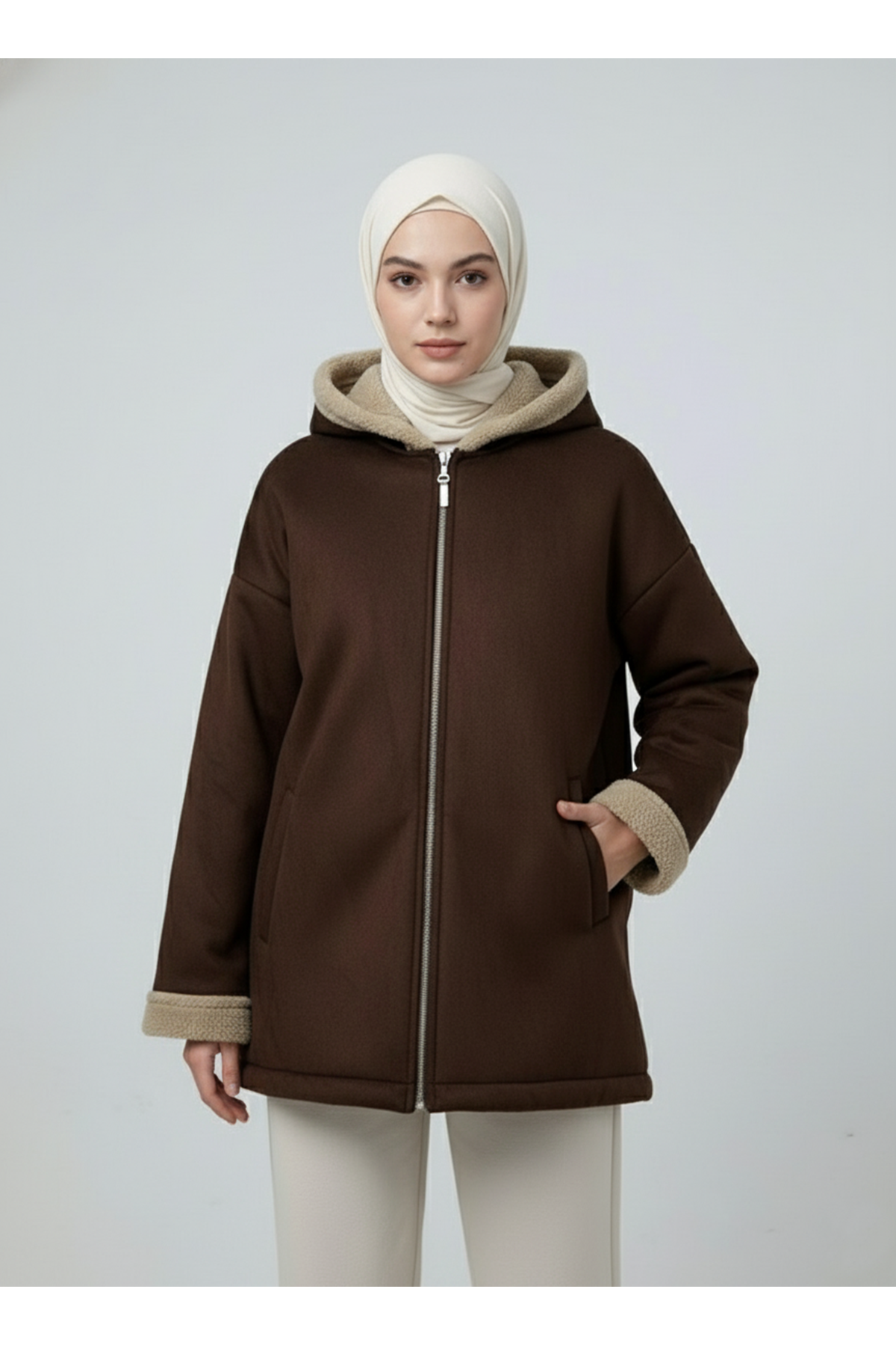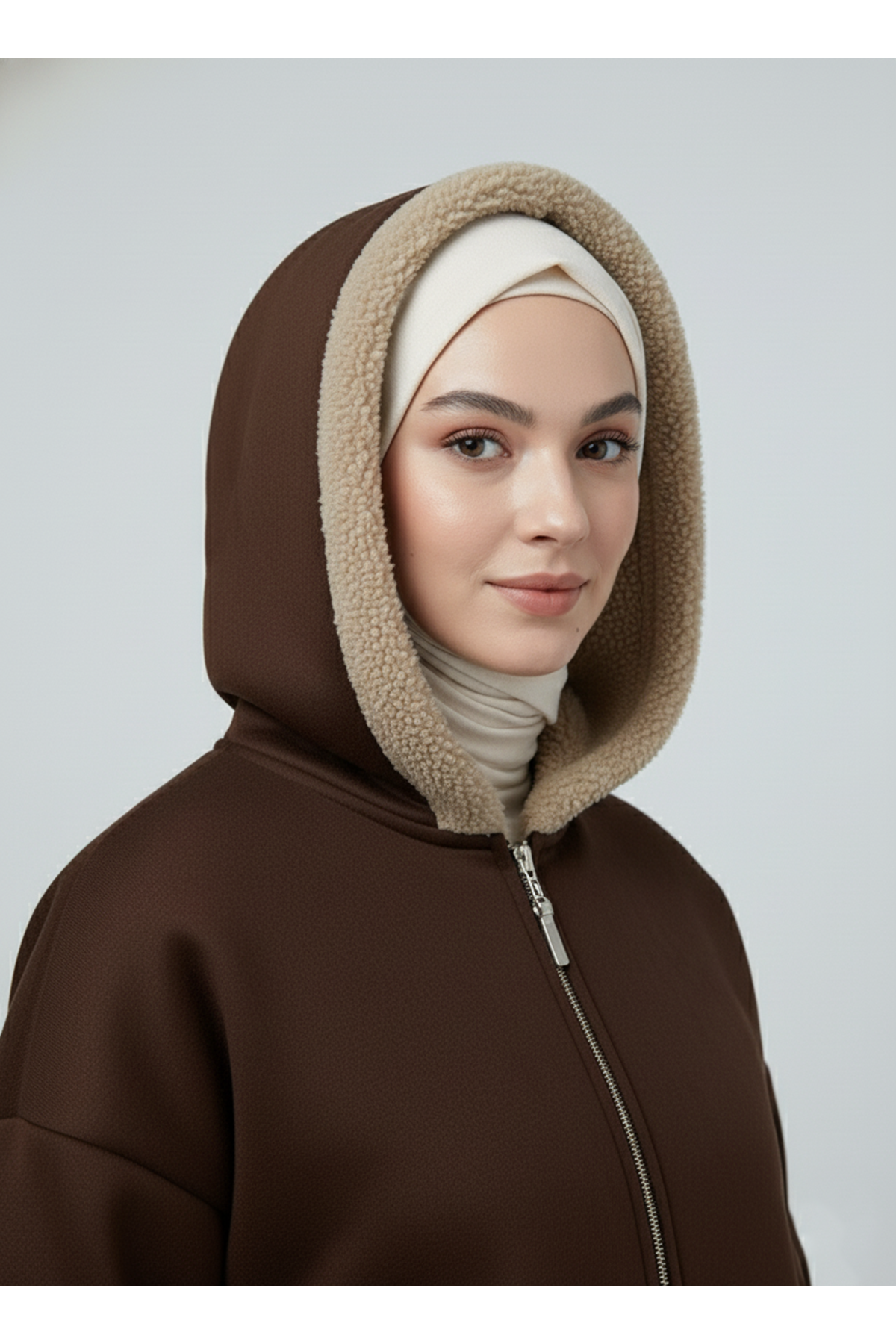 Kapşonlu Metal Fermuarlı Ceket-Kahve