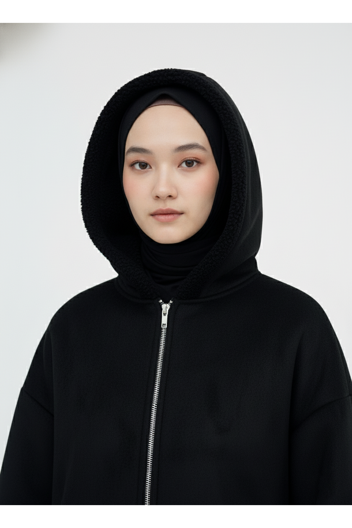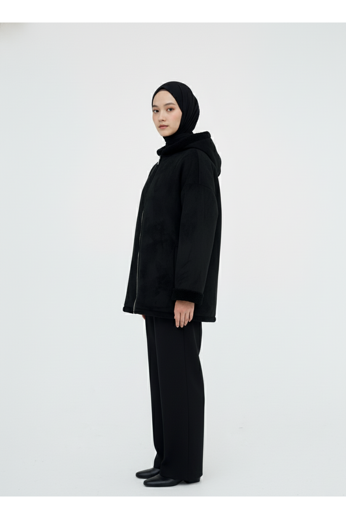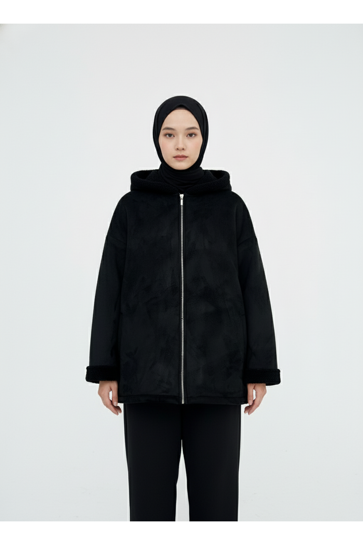 Kapşonlu Metal Fermuarlı Ceket-Siyah