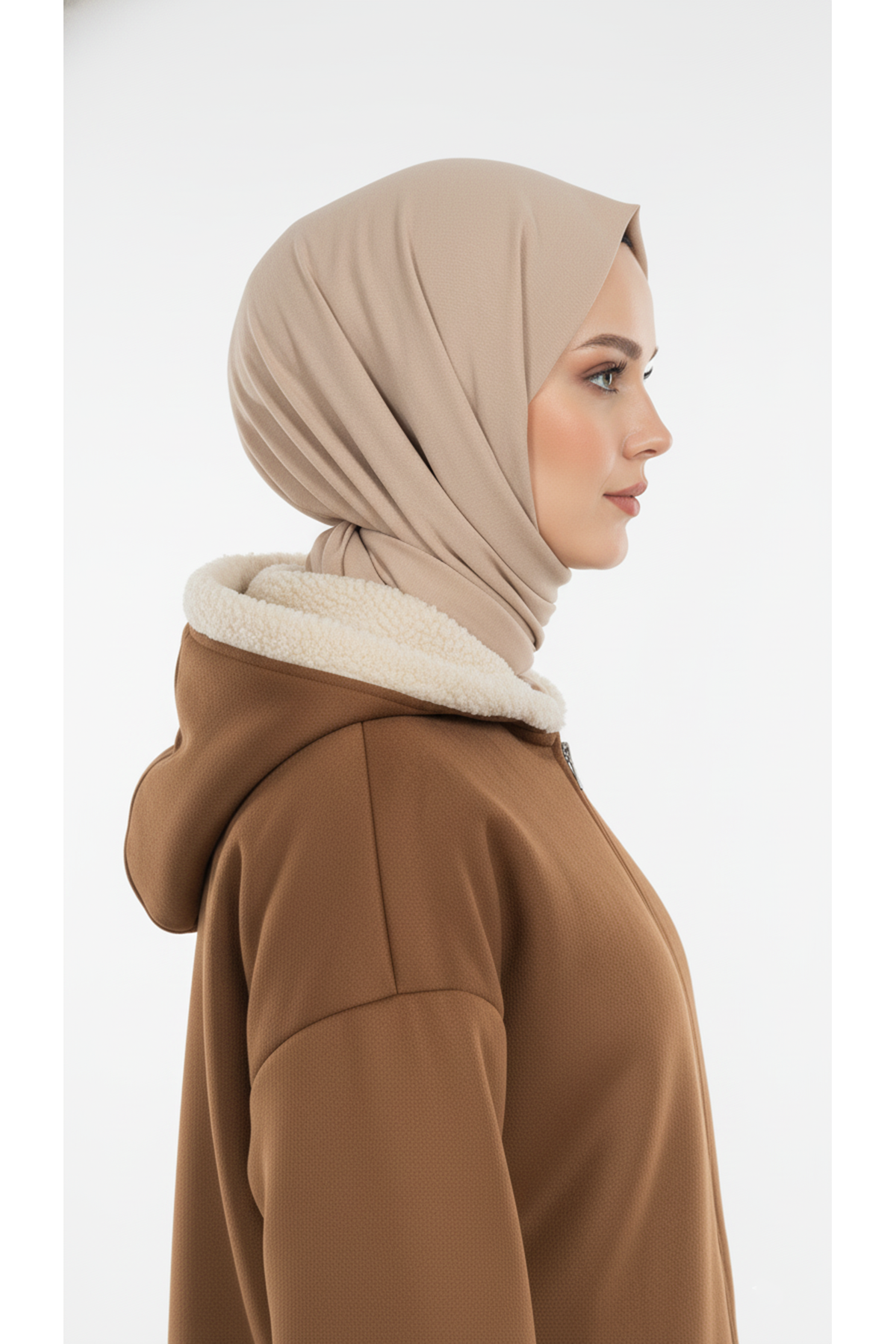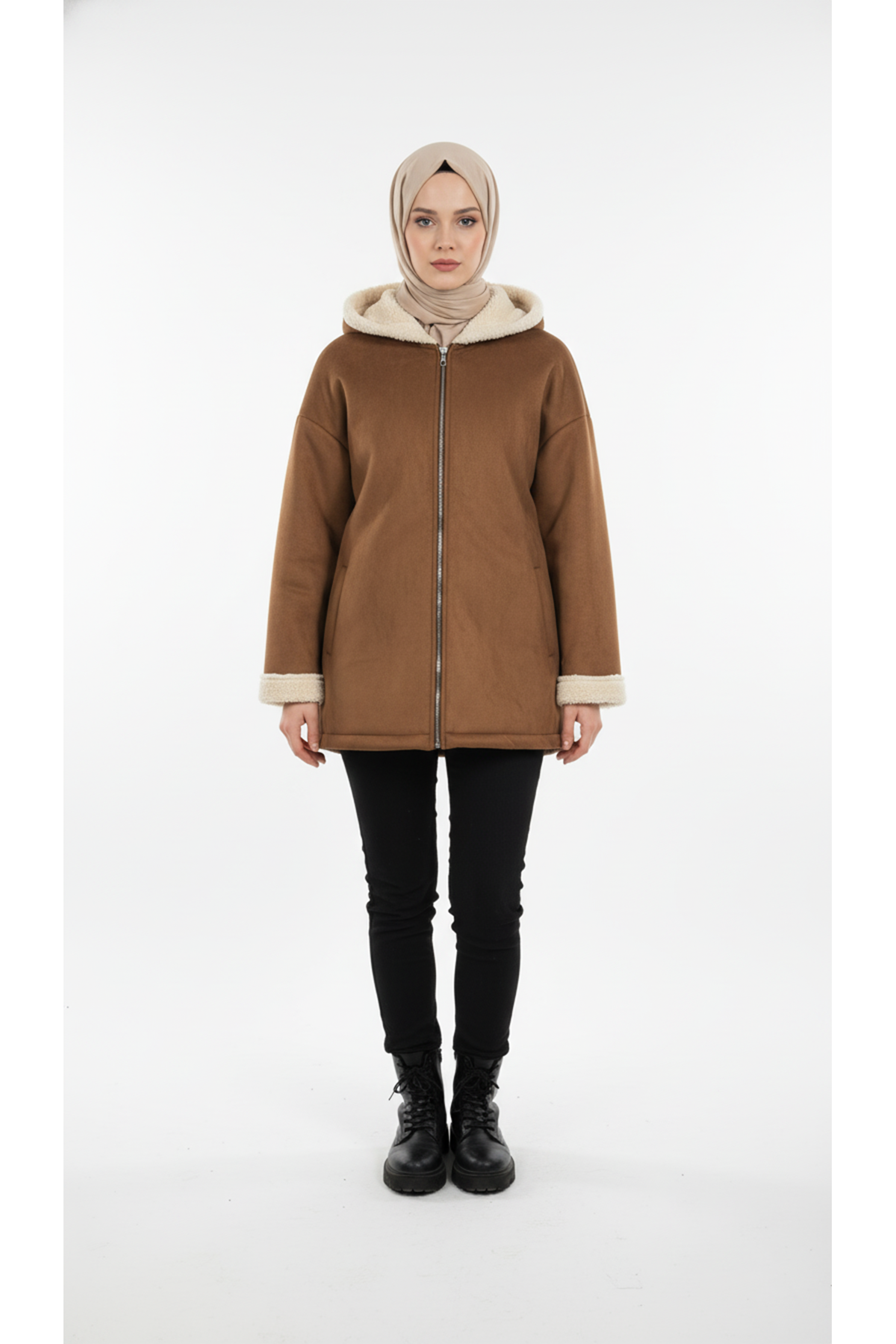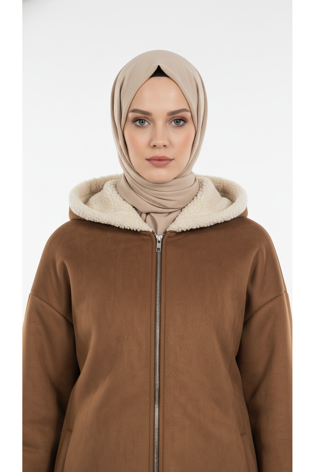 Kapşonlu Metal Fermuarlı Ceket-Taba