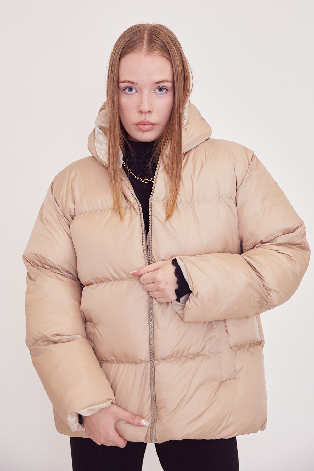 Kapüşonlu Şişme Mont-Bej