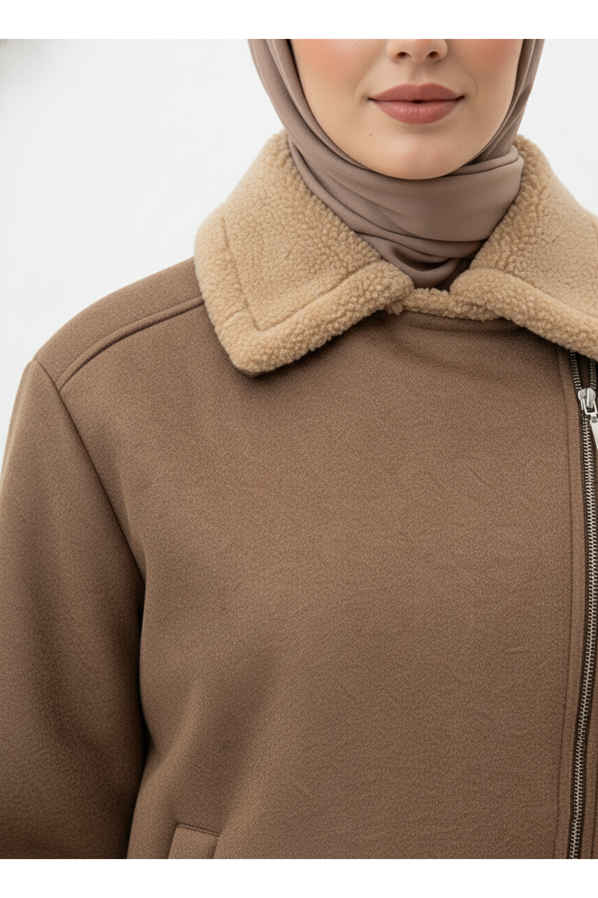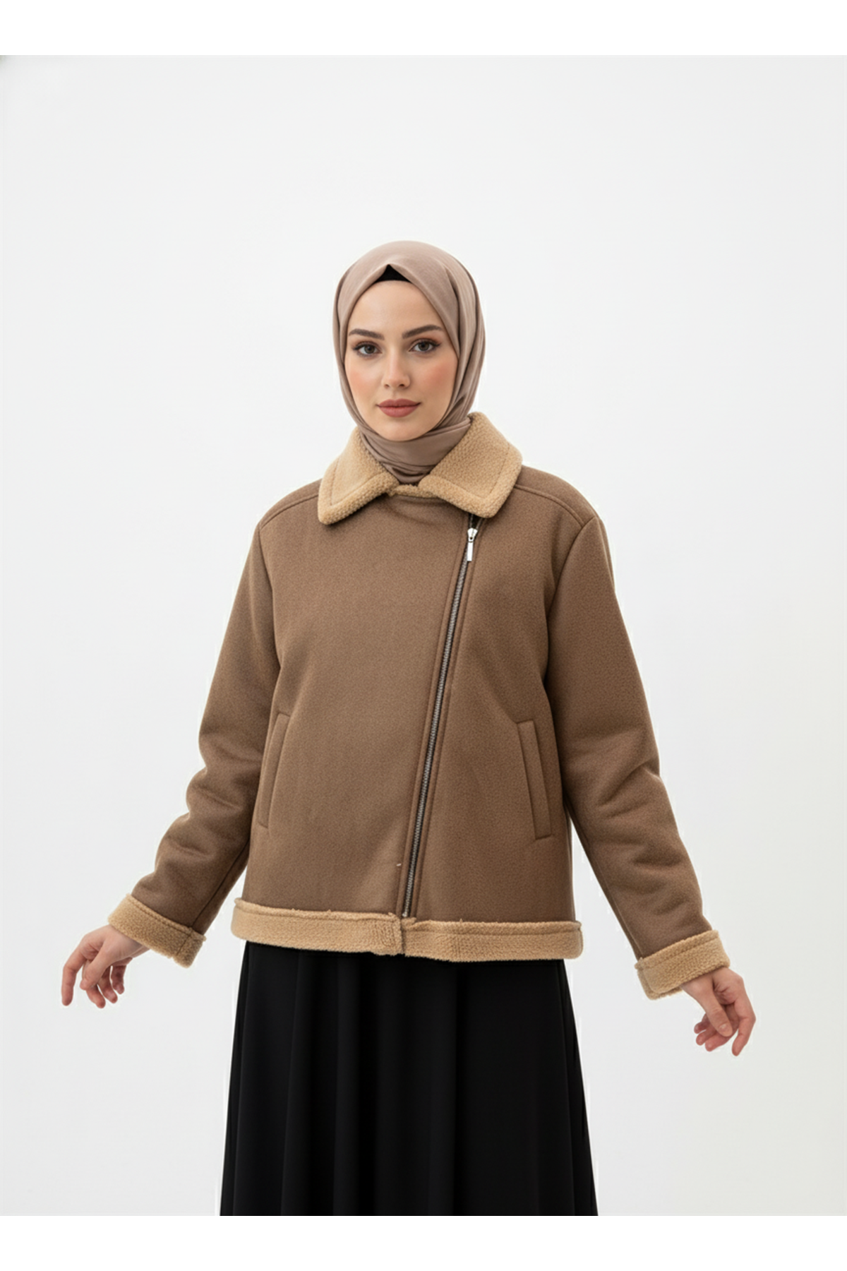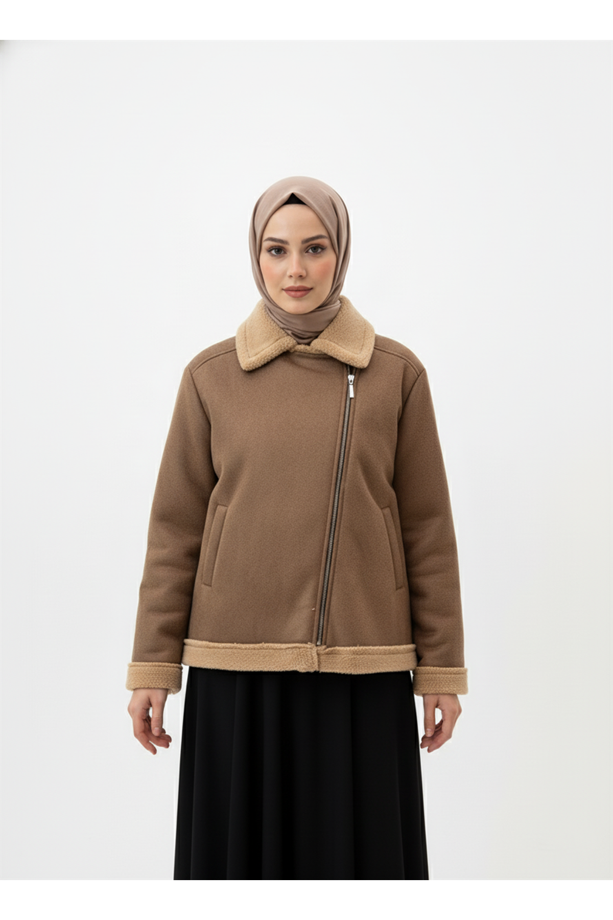Kruvaze Metal Fermuarlı Ceket-Bej