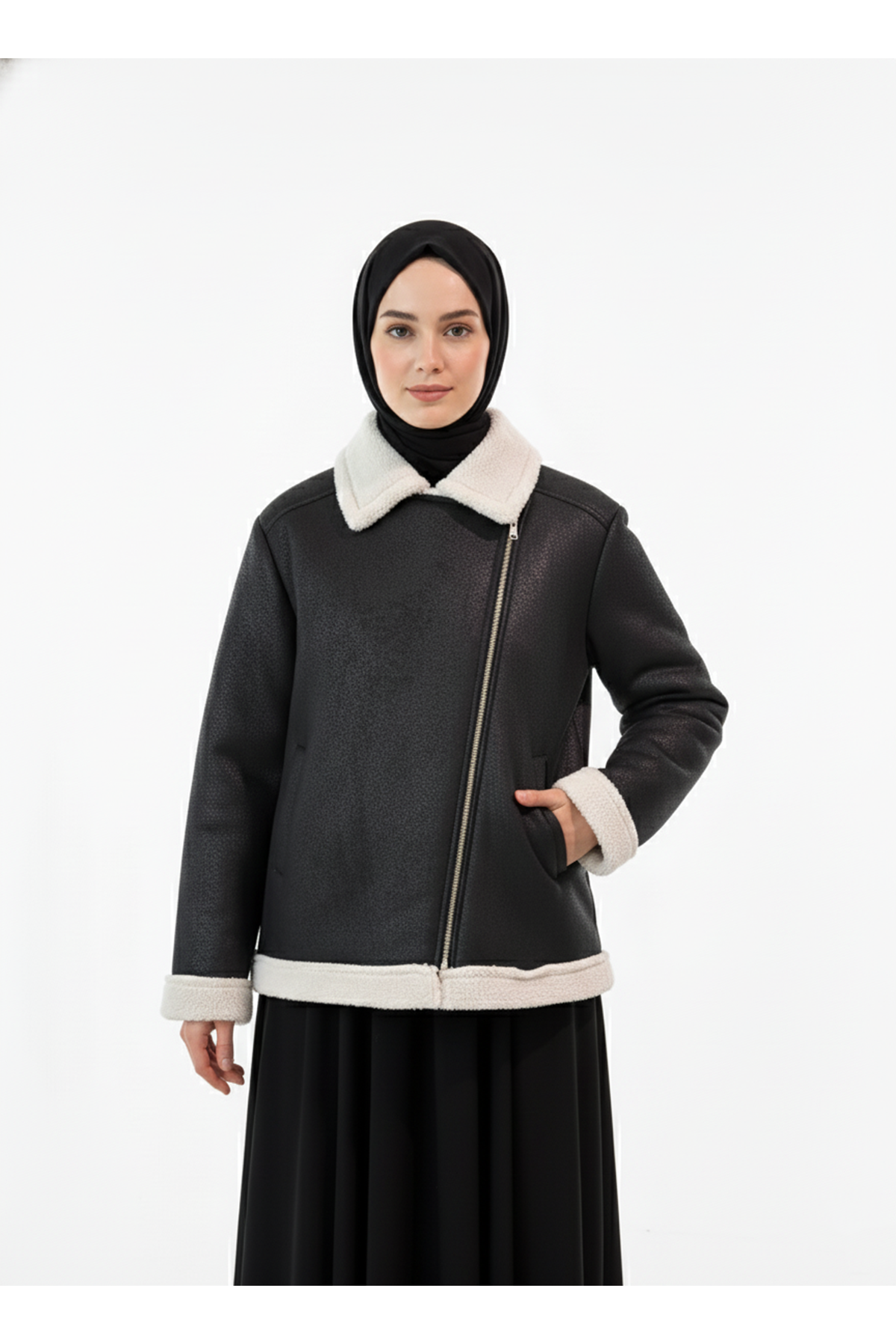 Kruvaze Metal Fermuarlı Ceket-Siyah