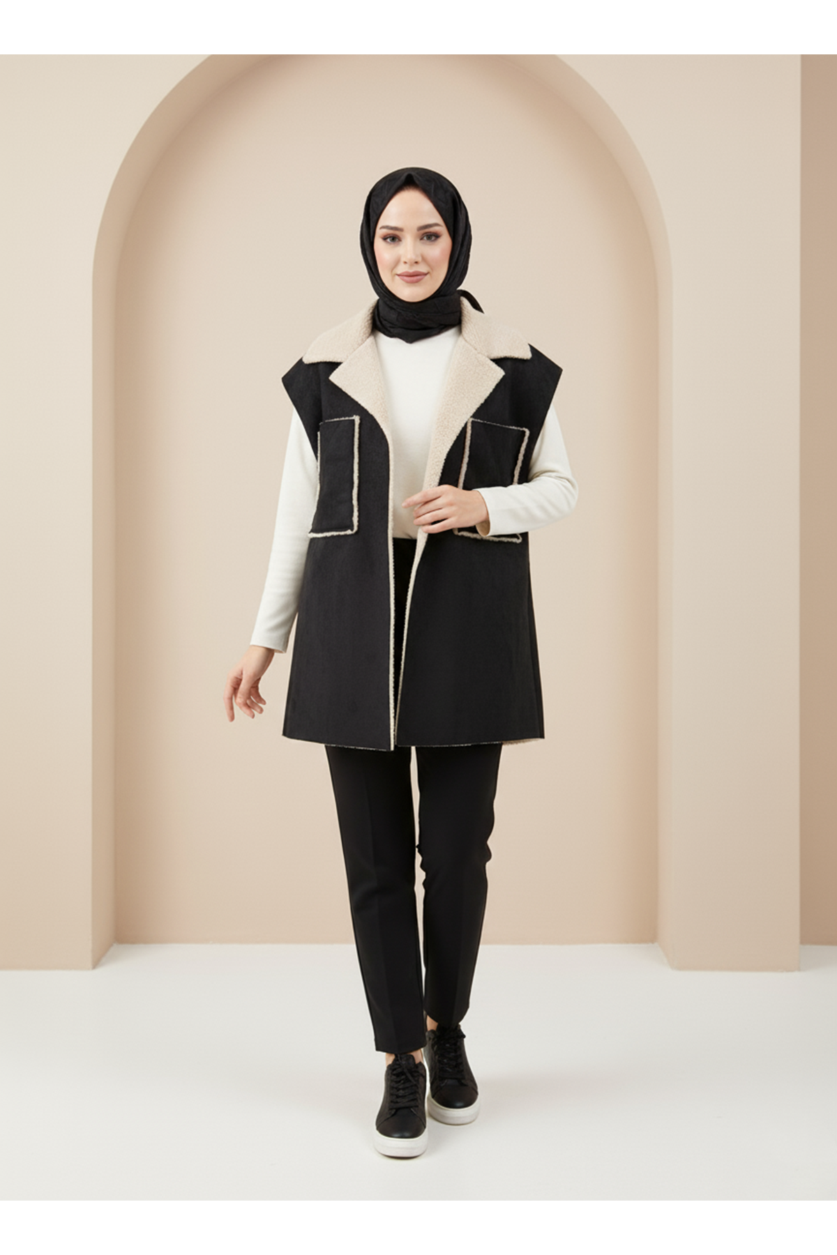 Kürklü Süet Üstten Çift Cepli Ceket-Siyah