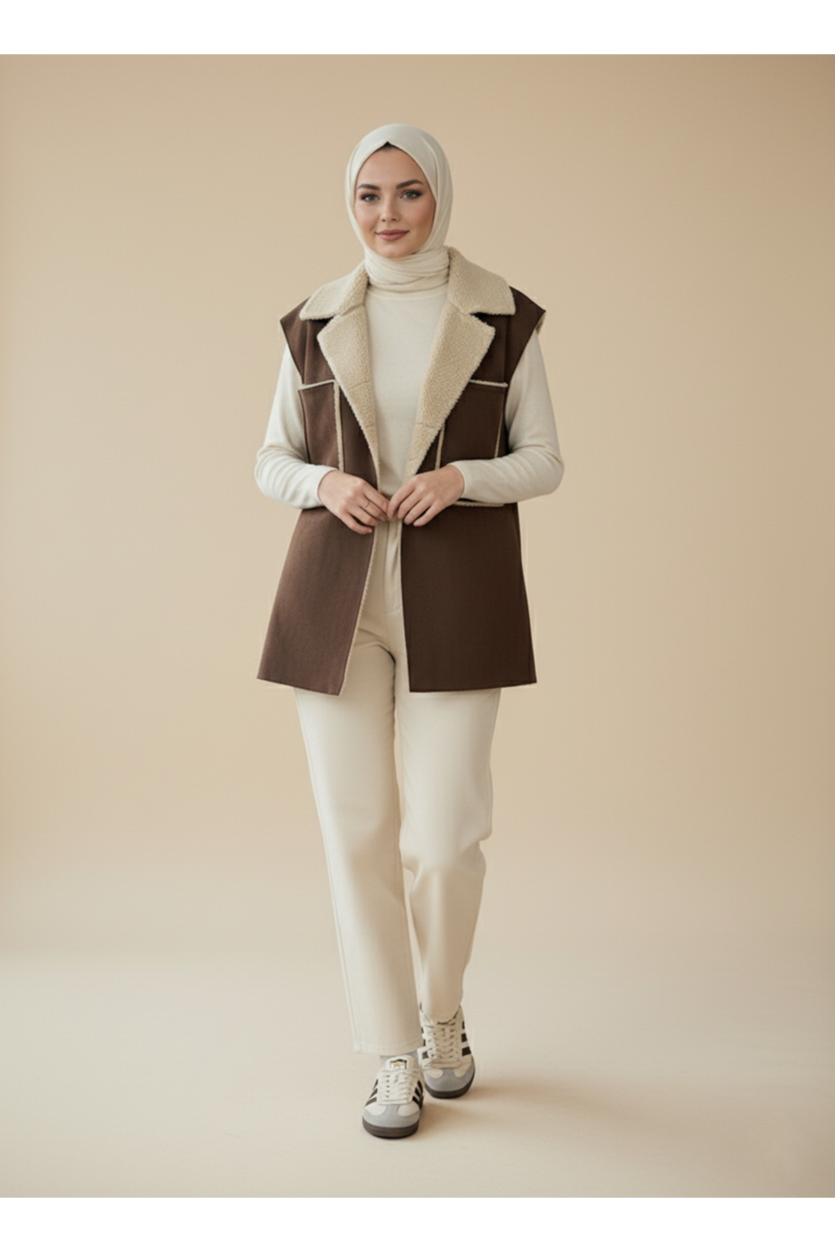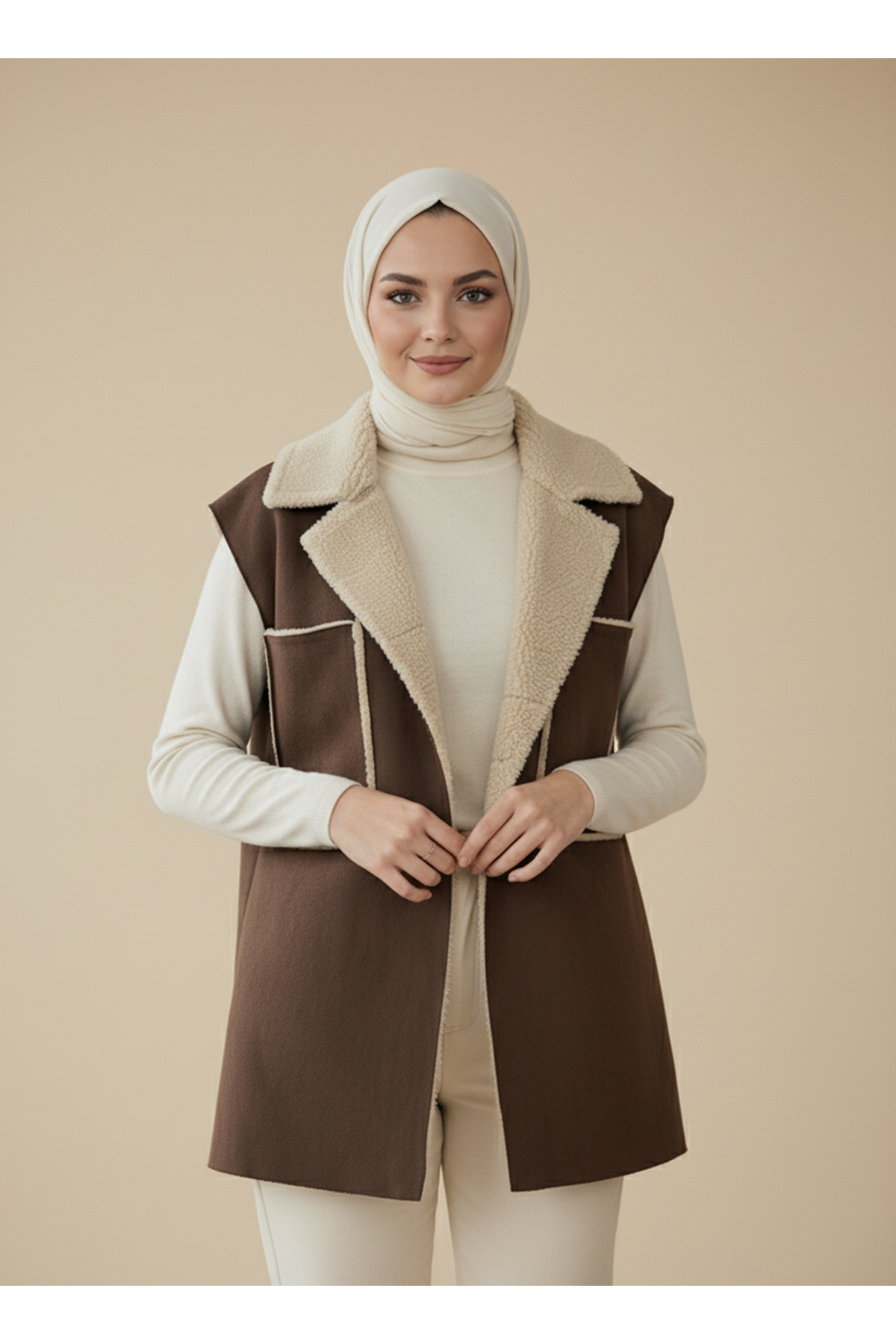 Kürklü Süet Üstten Çift Cepli Yelek-Kahve