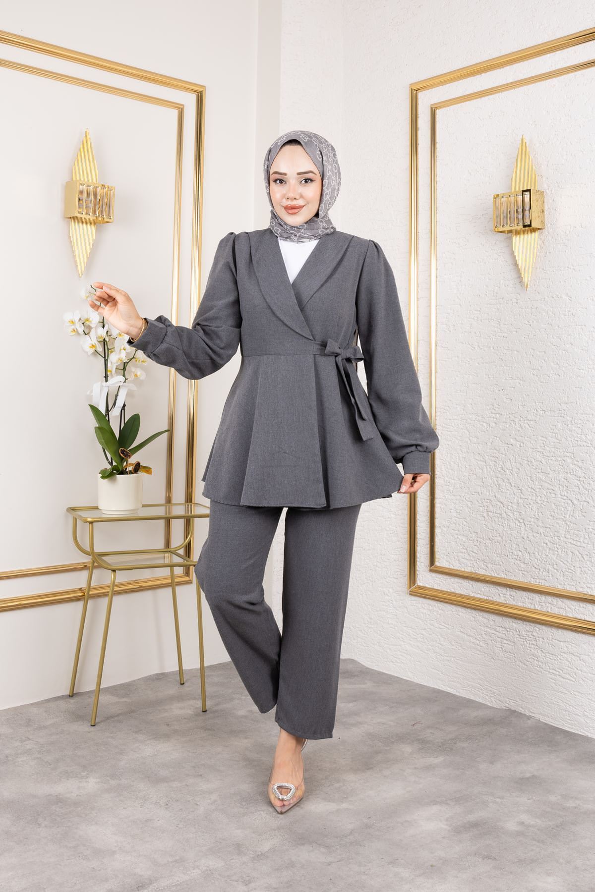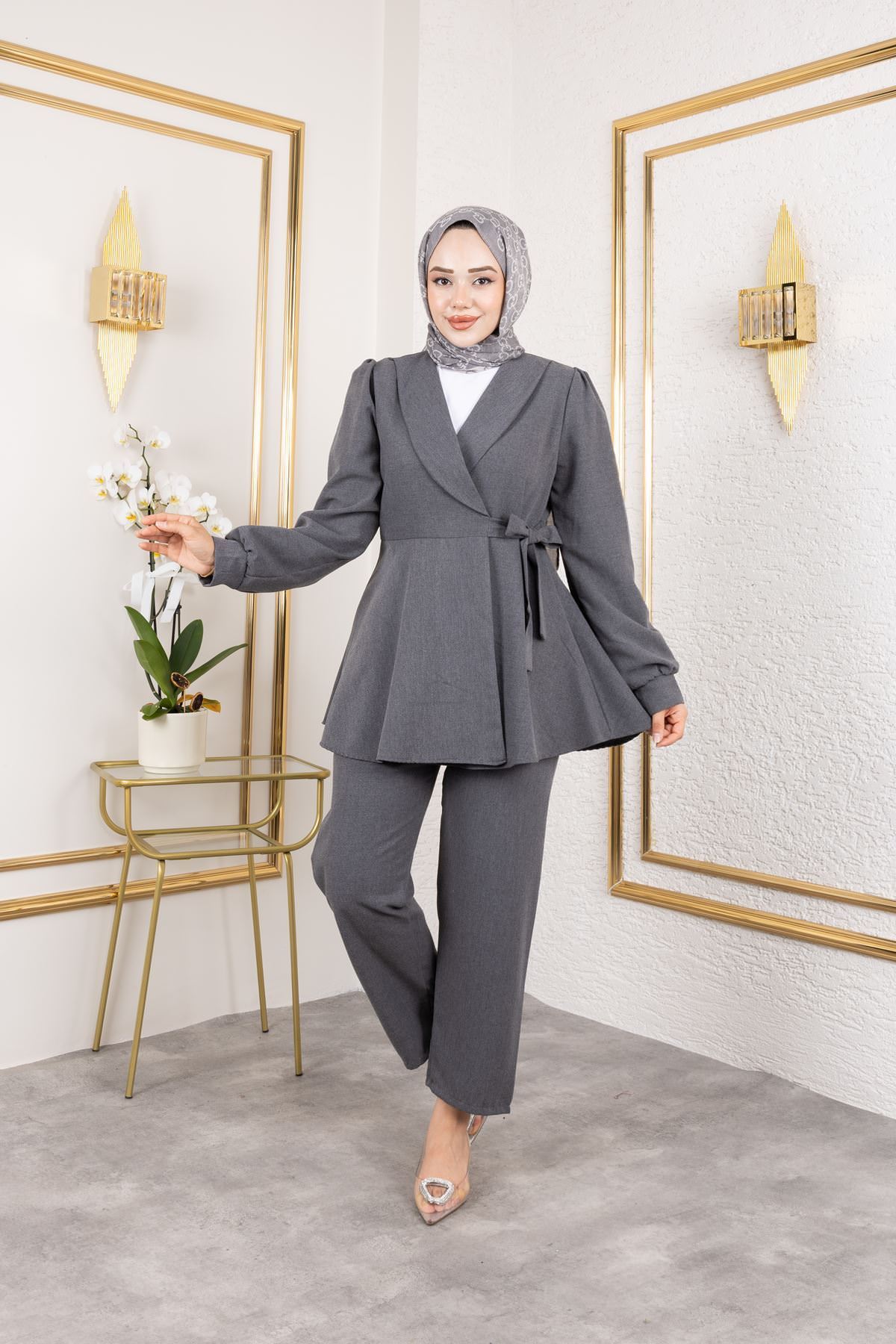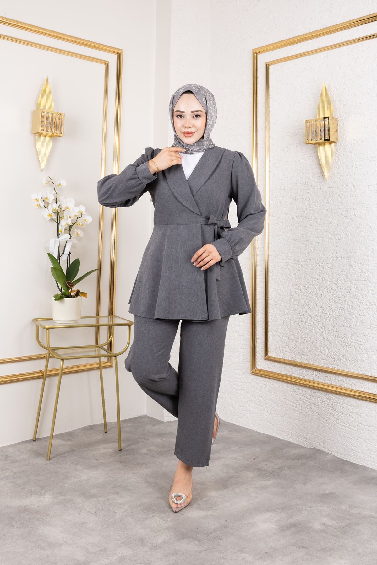 Kuşak Detay Ceketli Poliviskon Takım-Antrasit