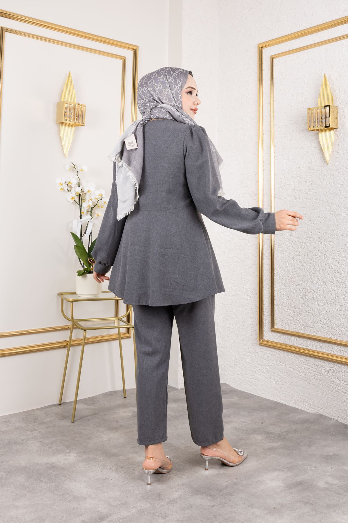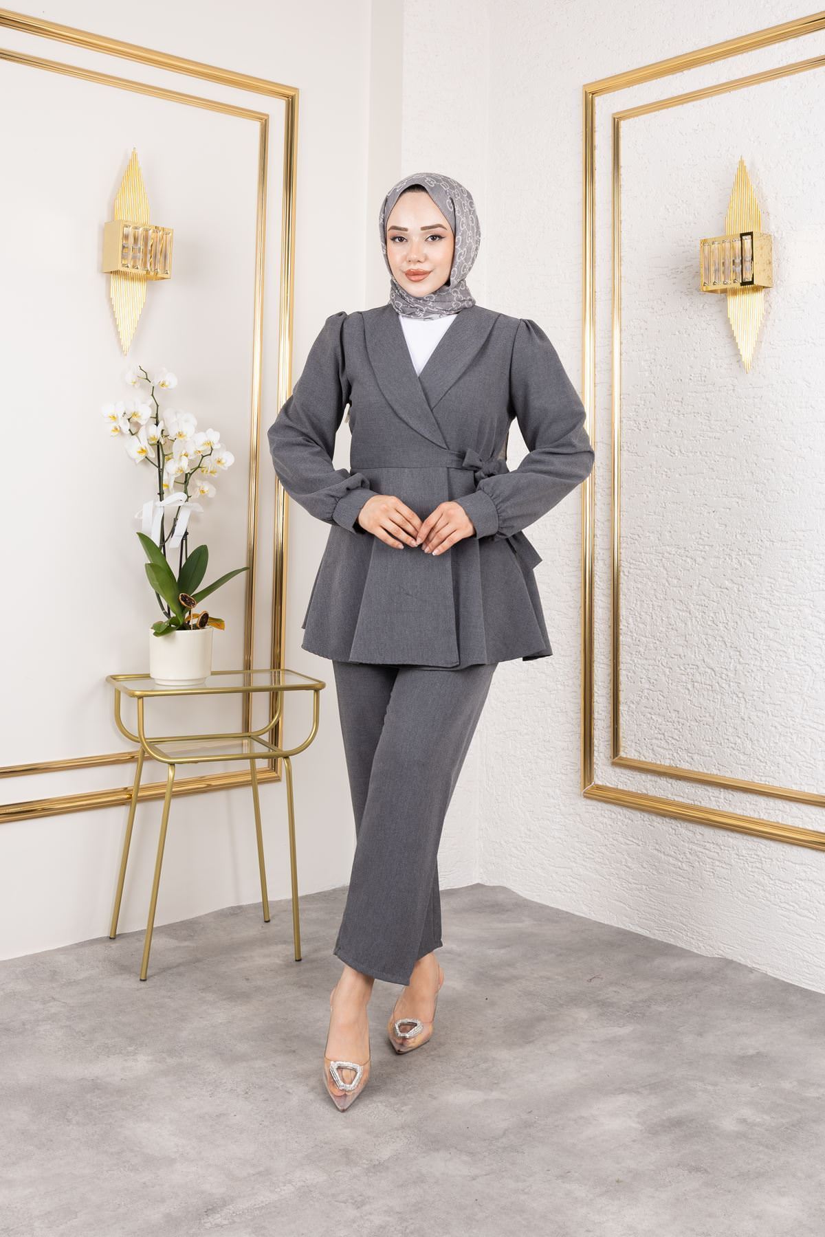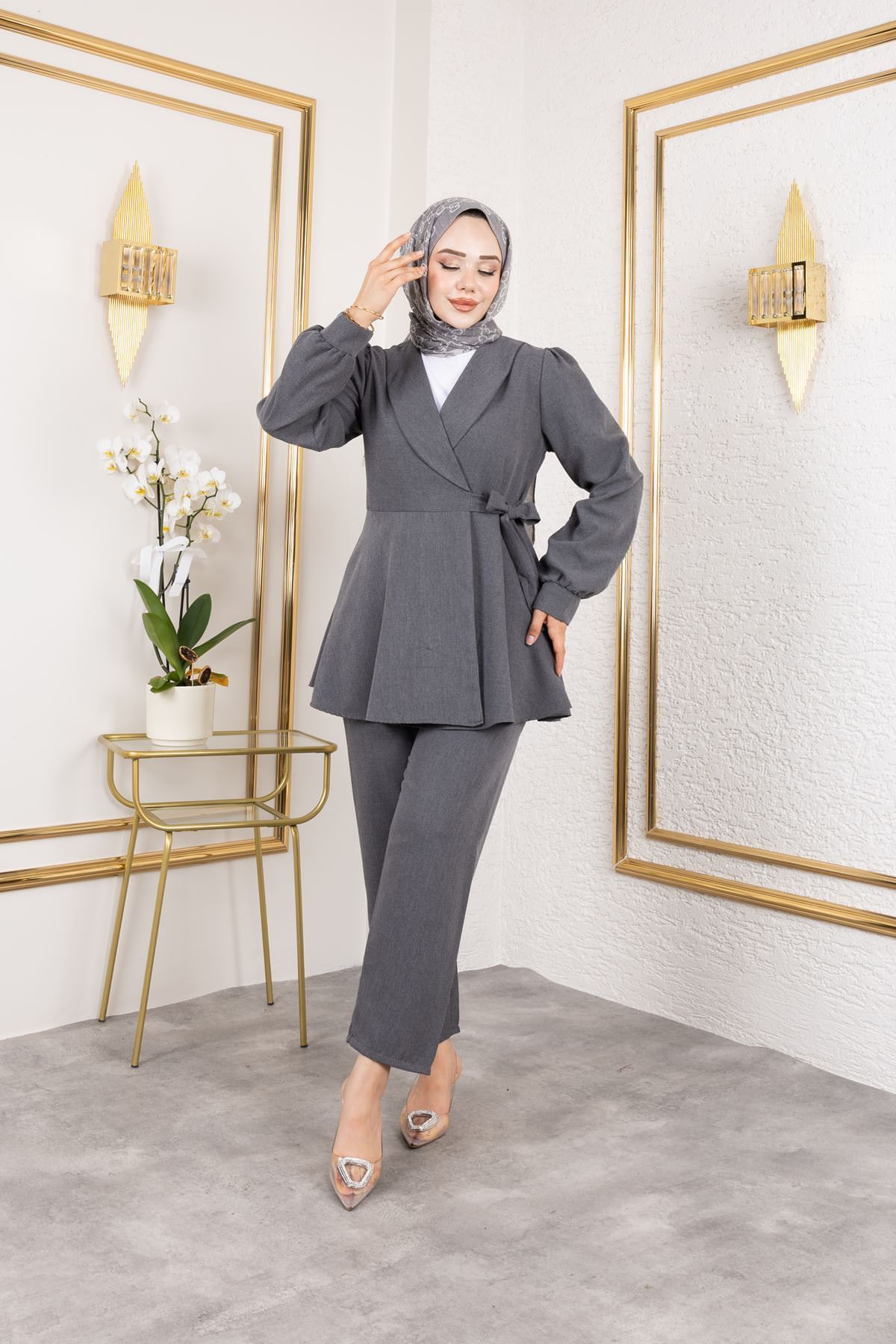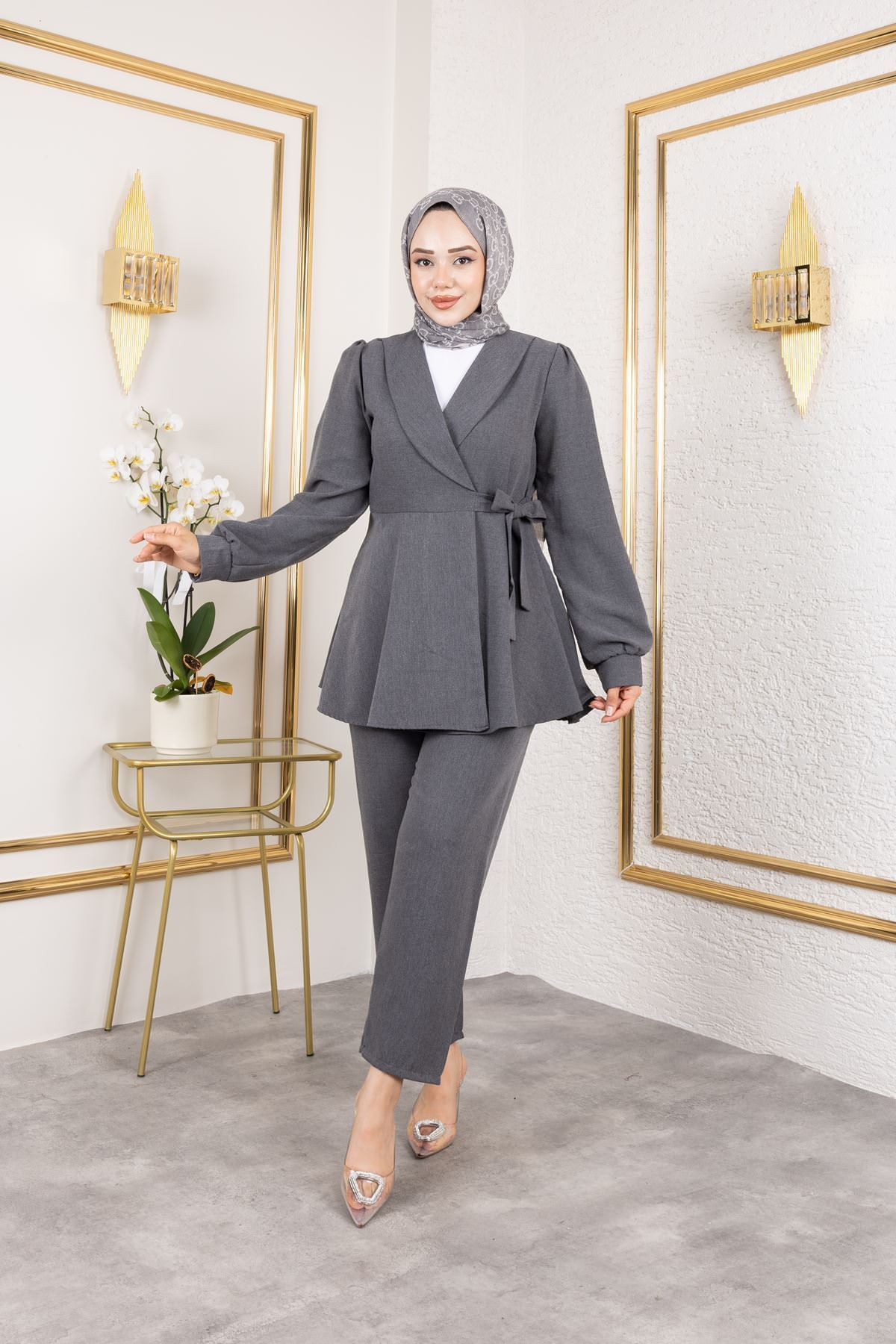 Kuşak Detay Ceketli Poliviskon Takım-Antrasit