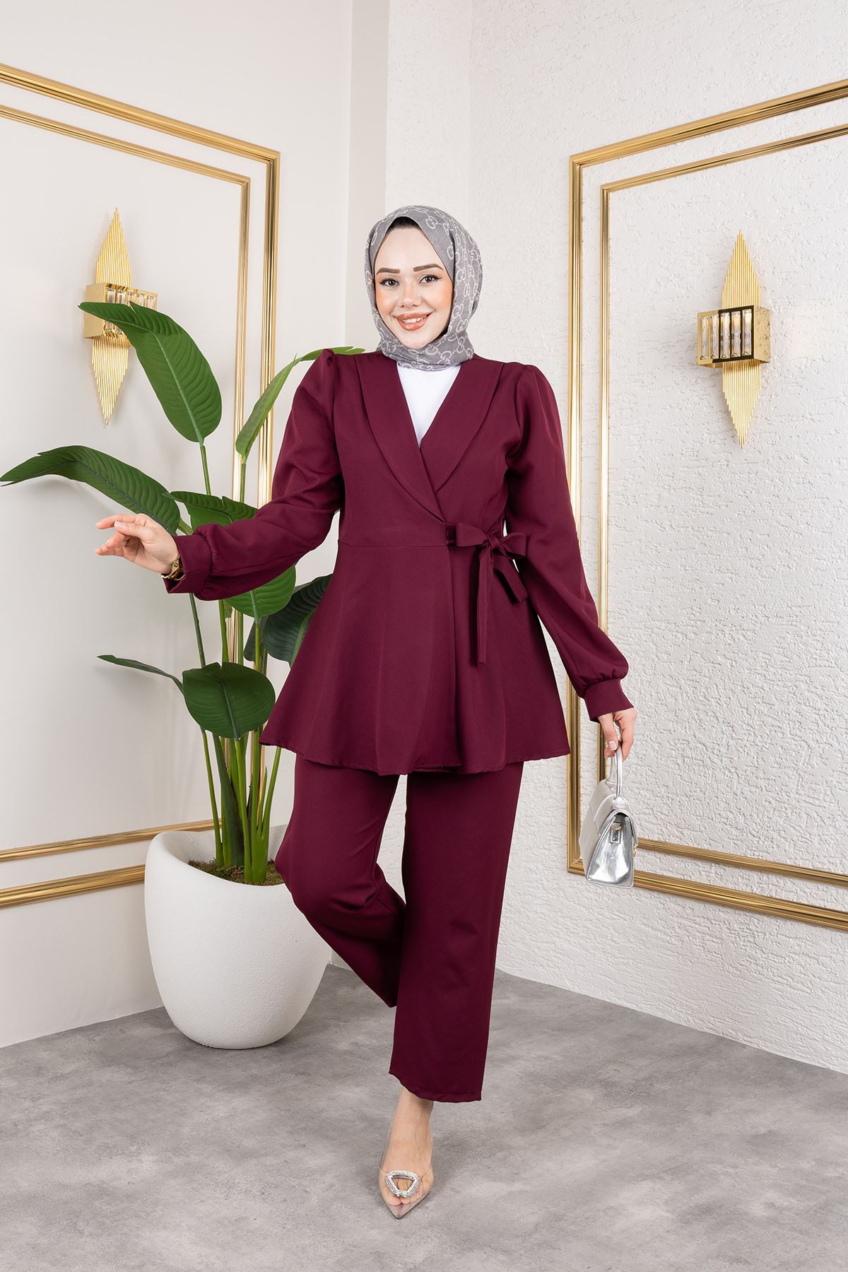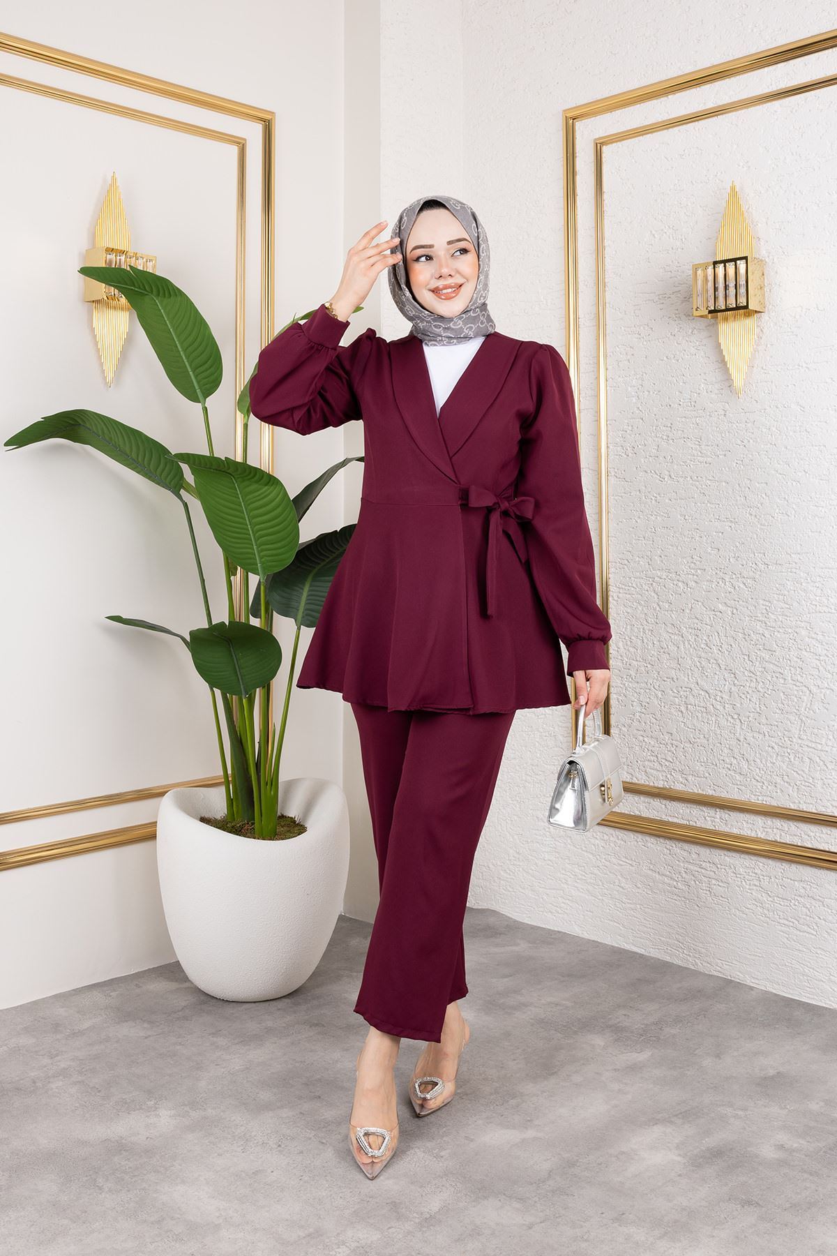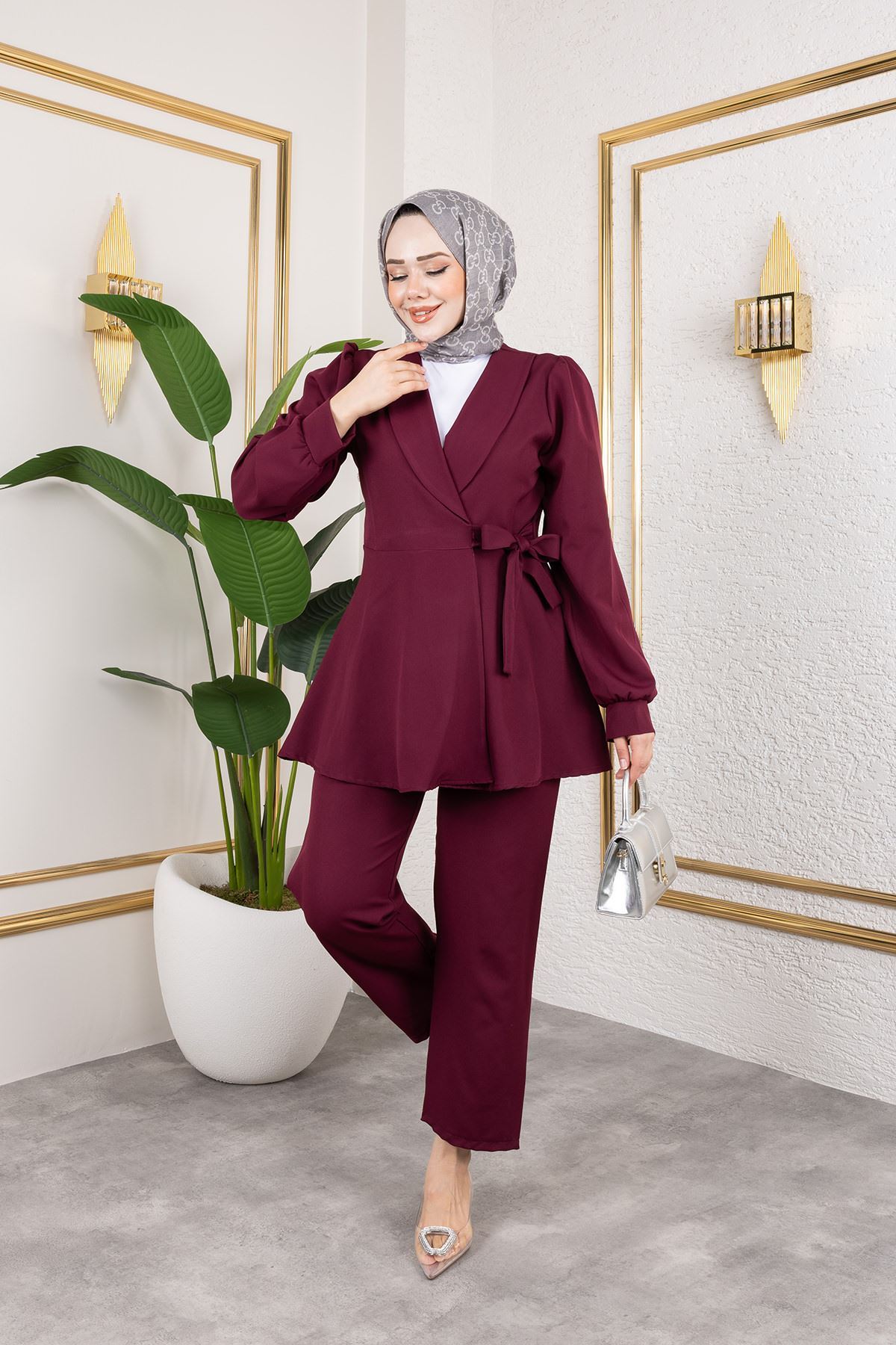 Kuşak Detay Ceketli Takım-Bordo