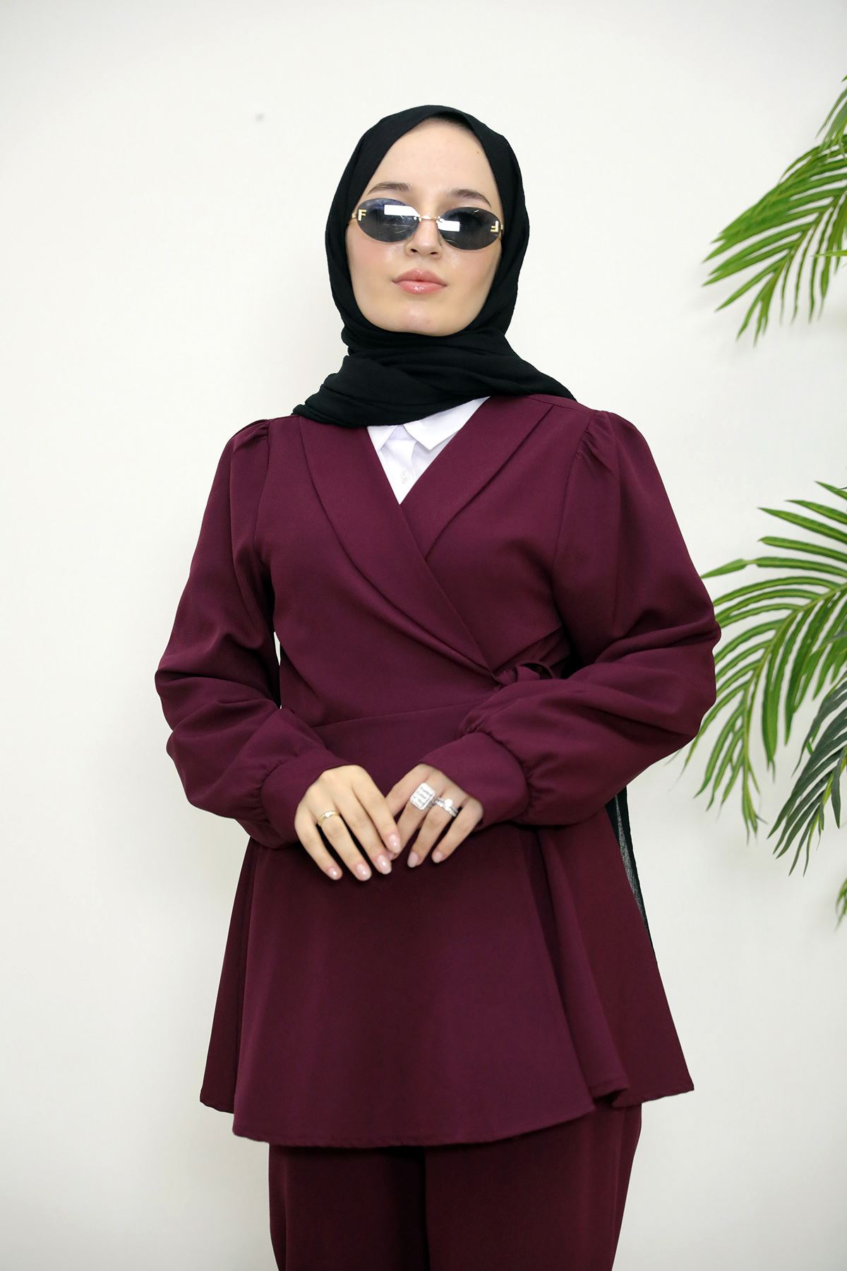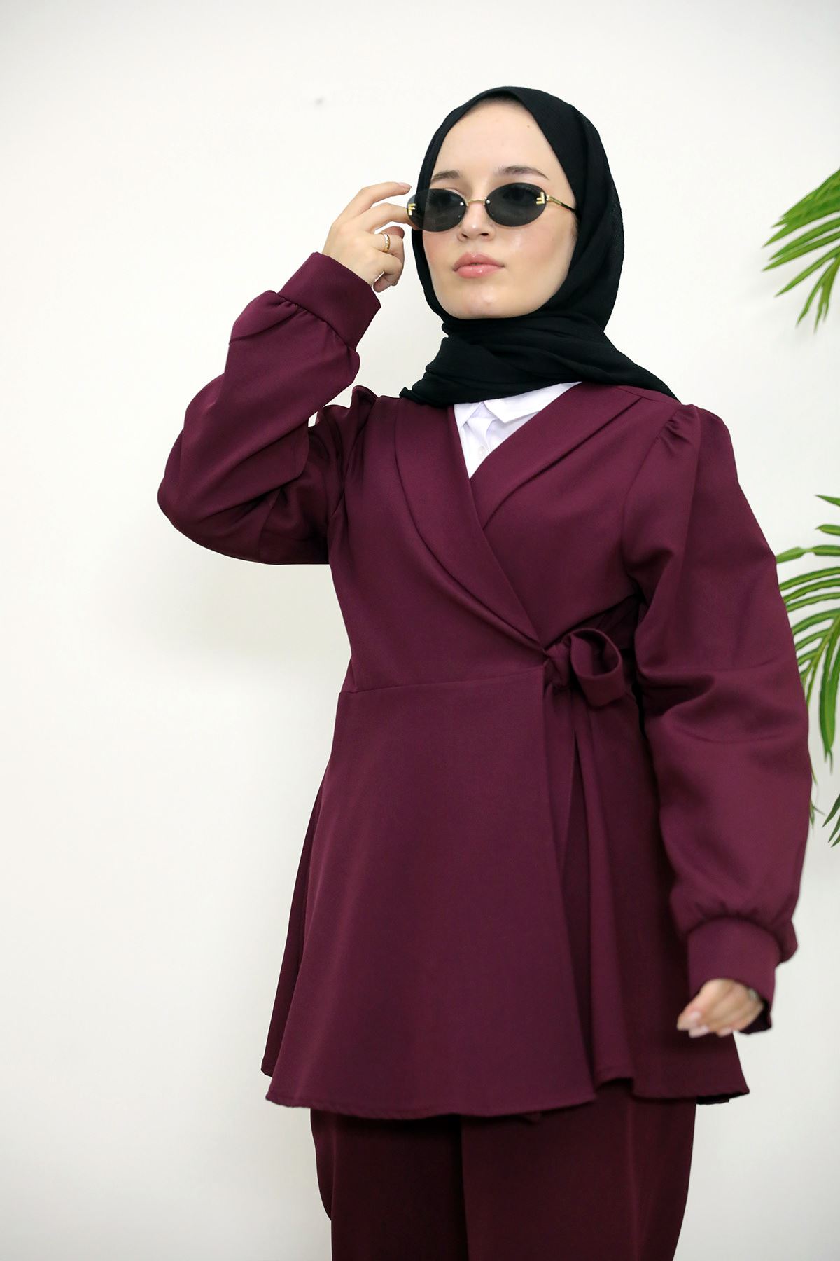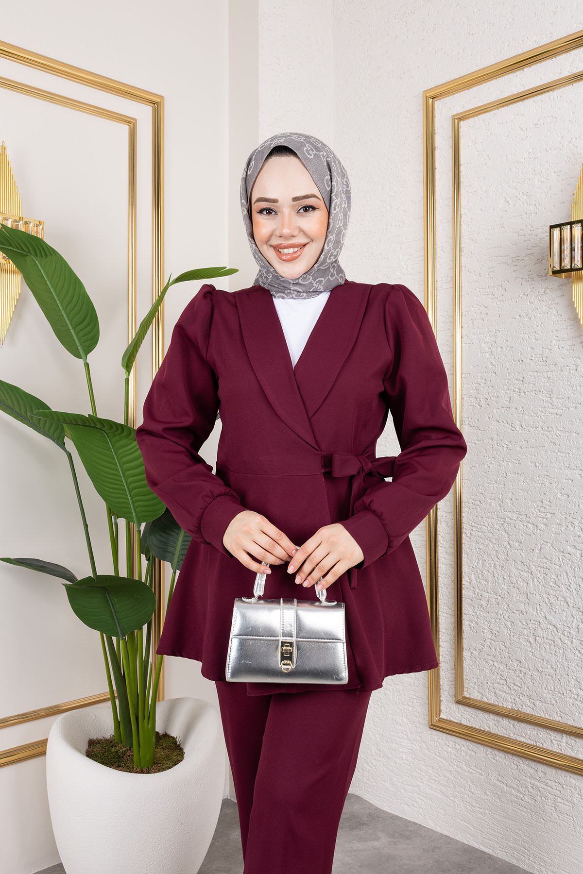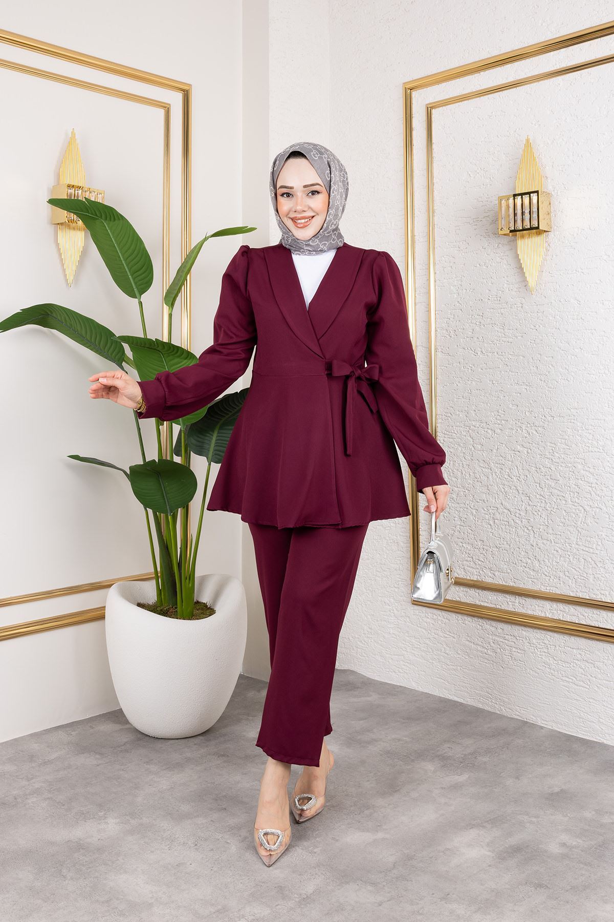 Kuşak Detay Ceketli Takım-Bordo