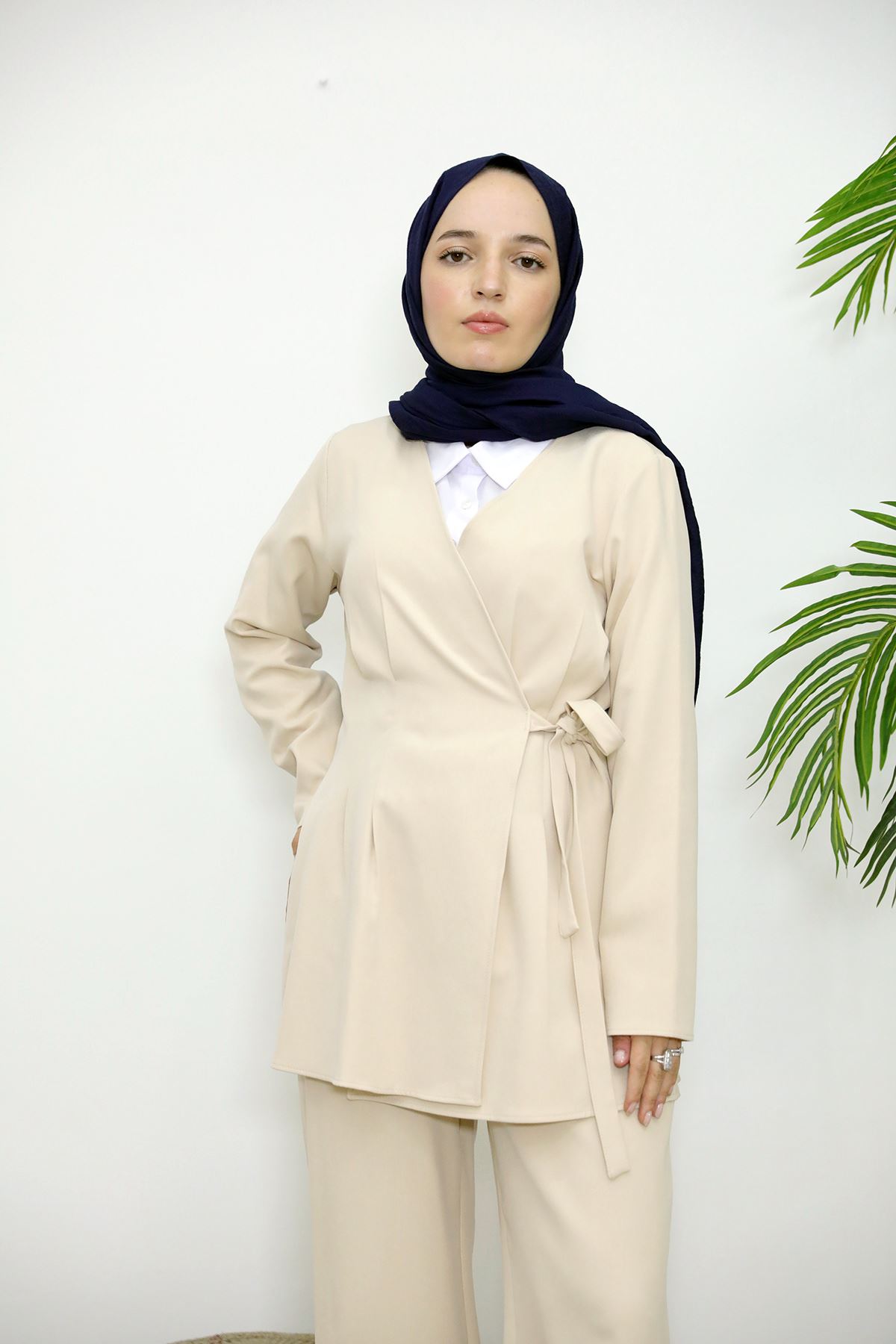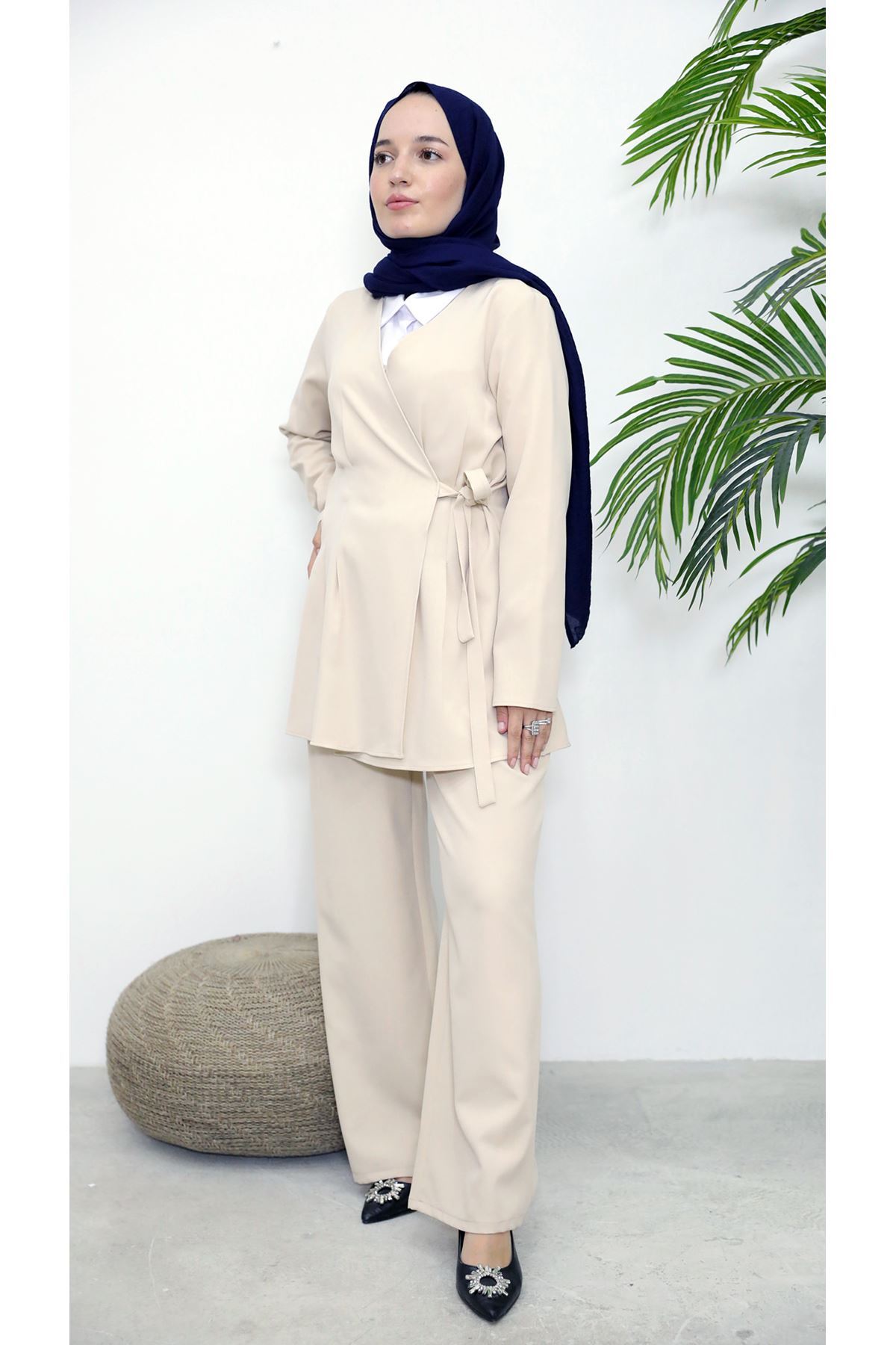 Kuşak Detay Ceketli Takım