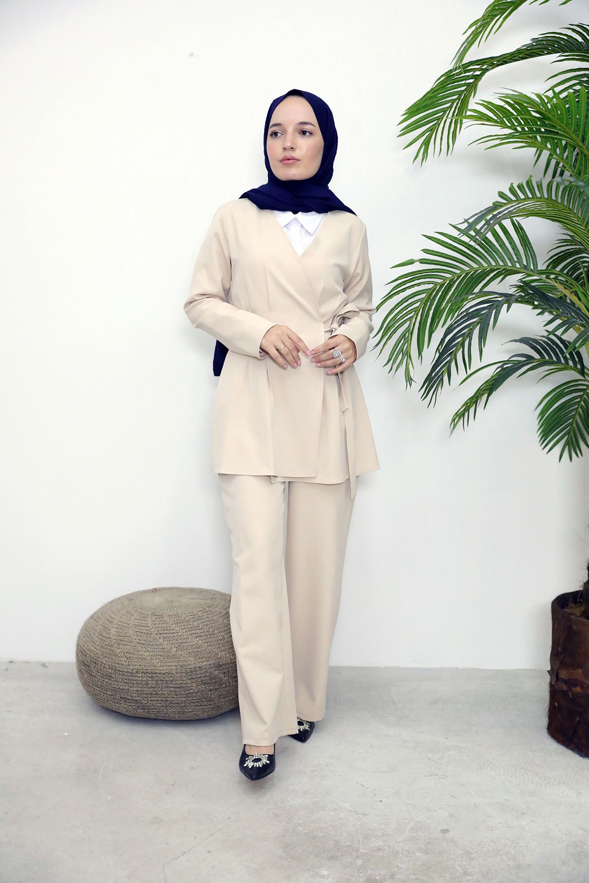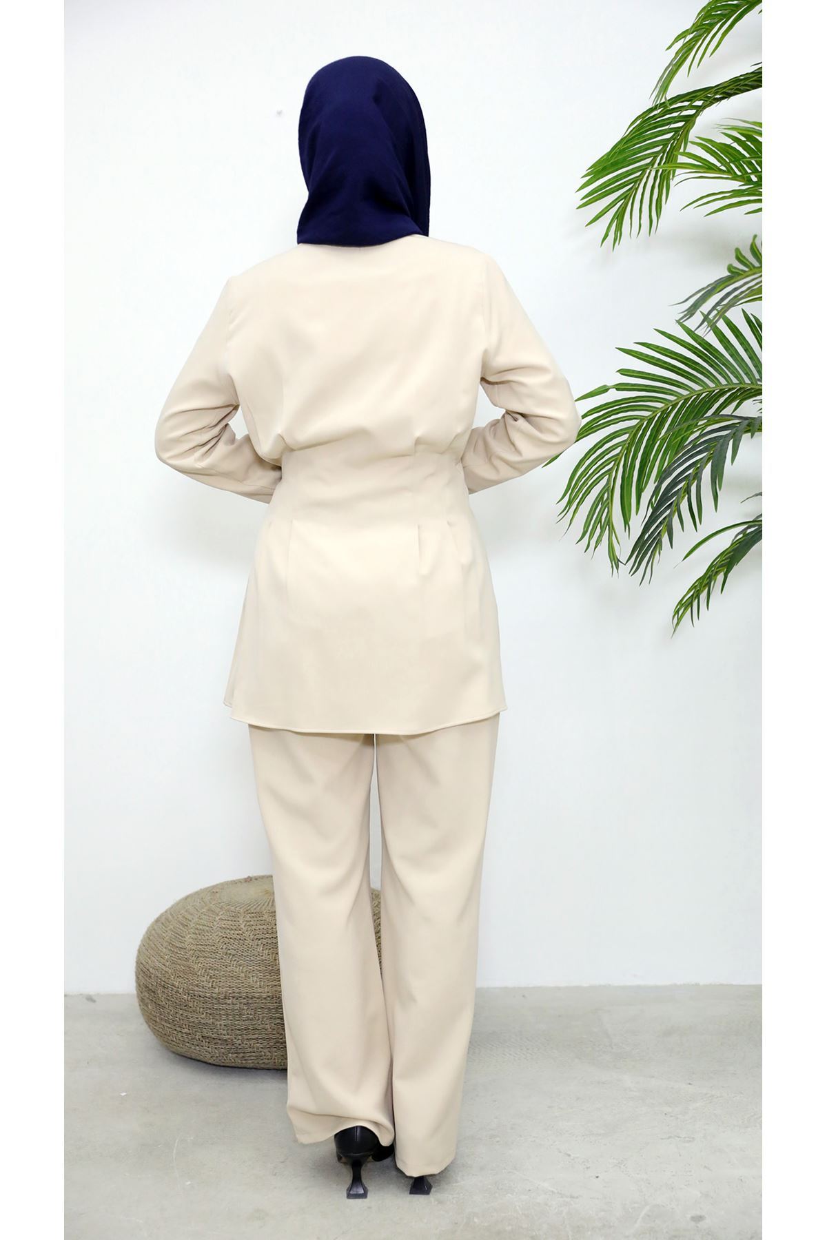 Kuşak Detay Ceketli Takım-Taş