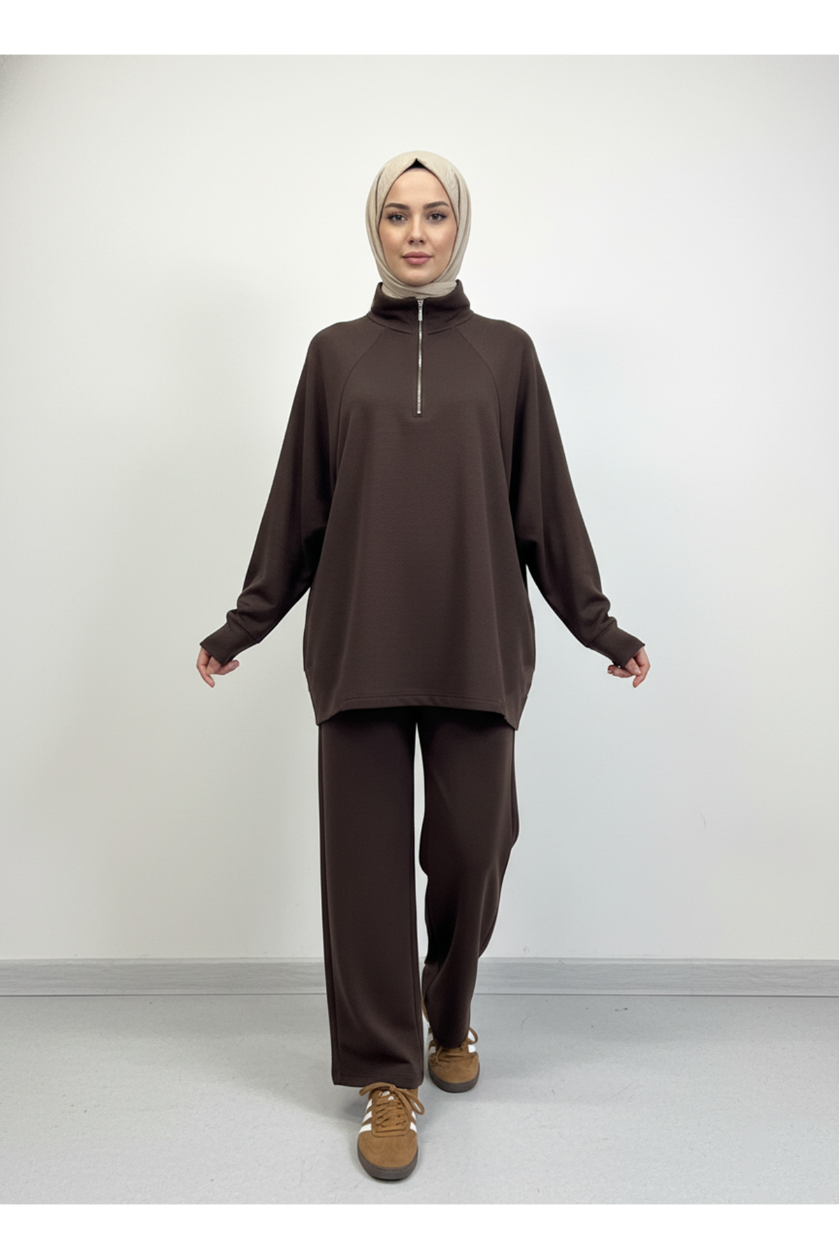 Metal Fermuarlı Pantolonlu Takım-Kahve