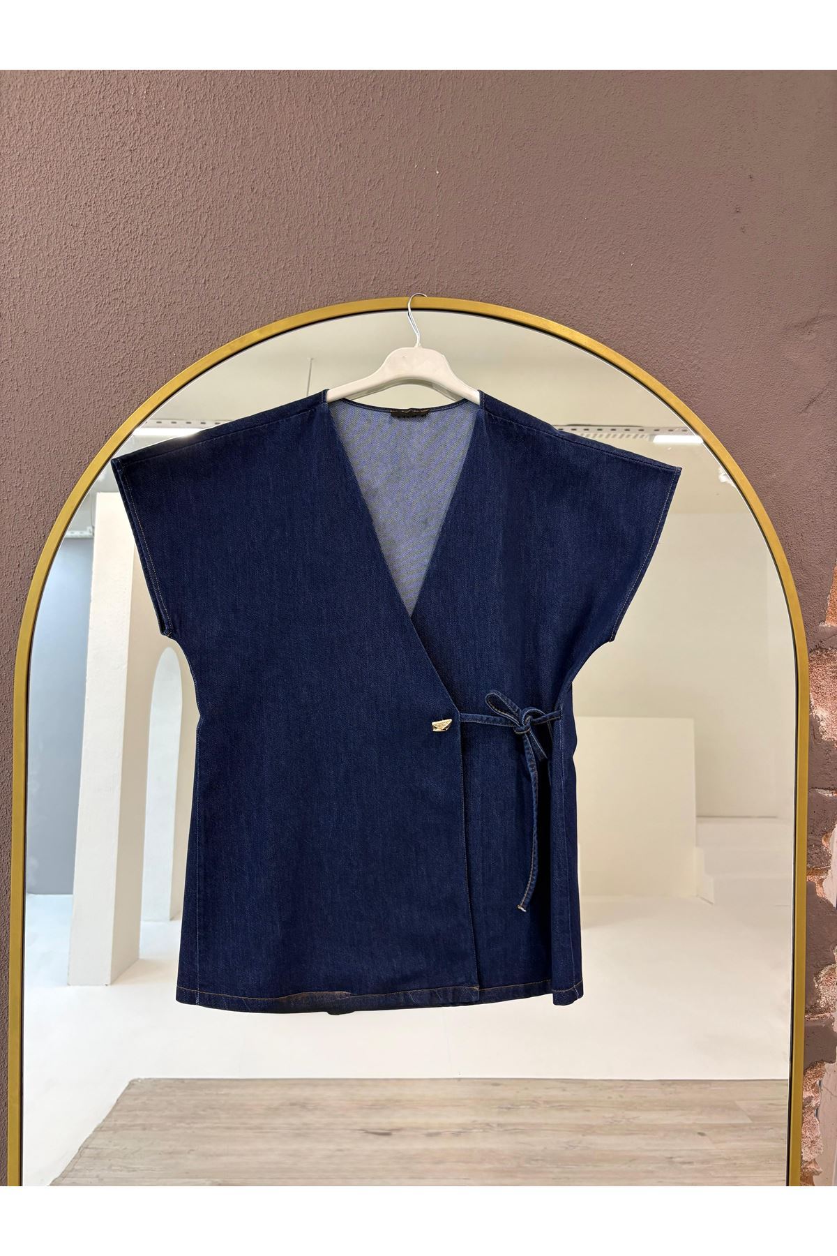 Ön Bağlamalı Düğme Detay Kot Yelek-Kot Rengi