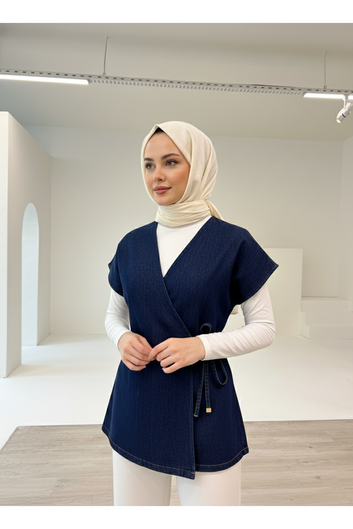 Ön Bağlamalı Düğme Detay Kot Yelek