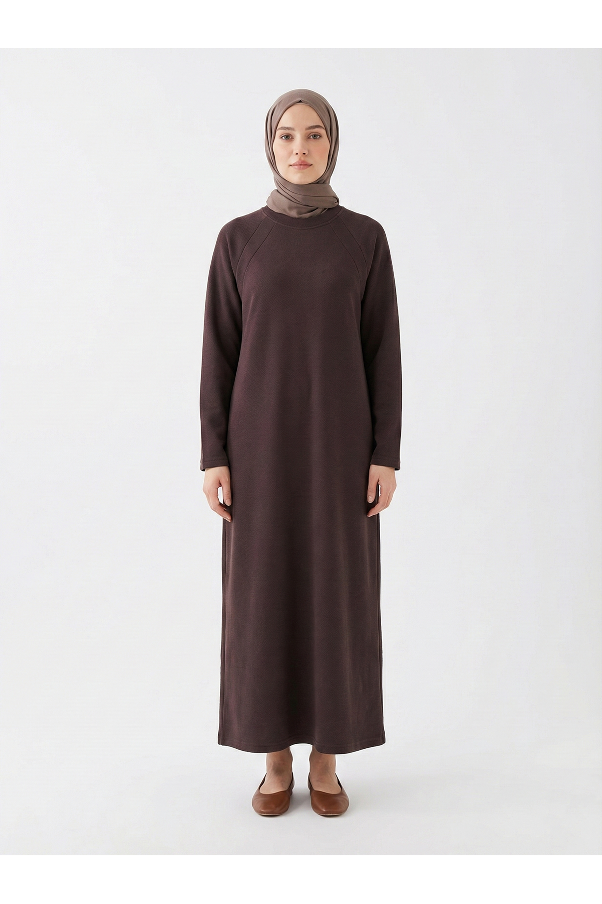 Ön Contalı Reglan Kol Elbise-Kahve