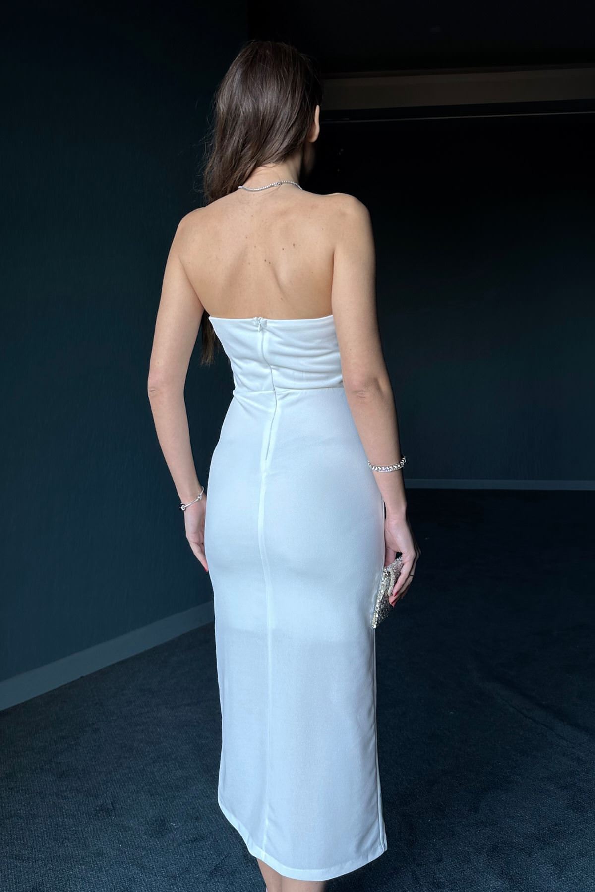 Ön Detay Yırtmaçlı Elbise-Ekru