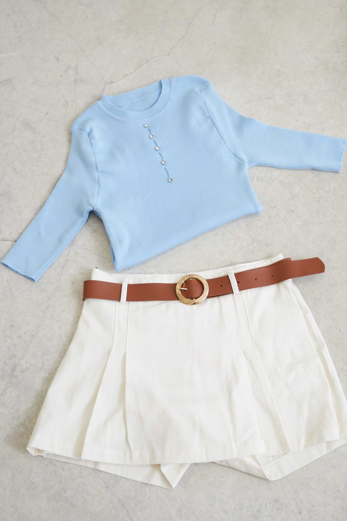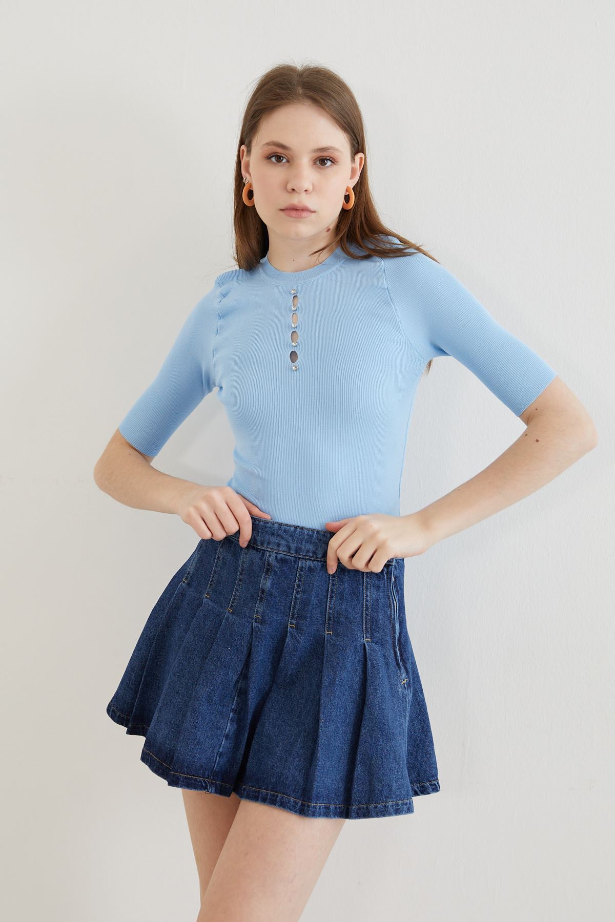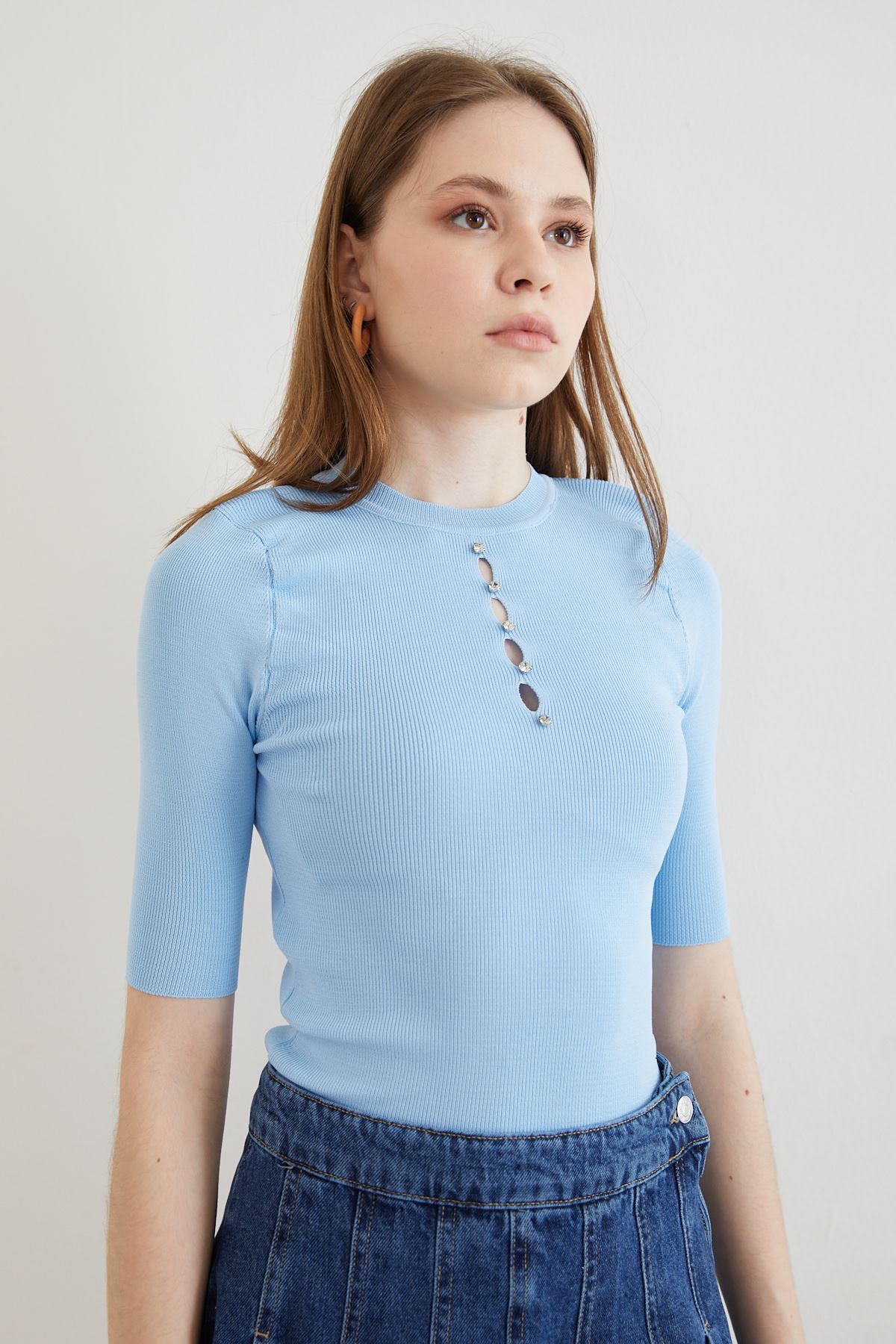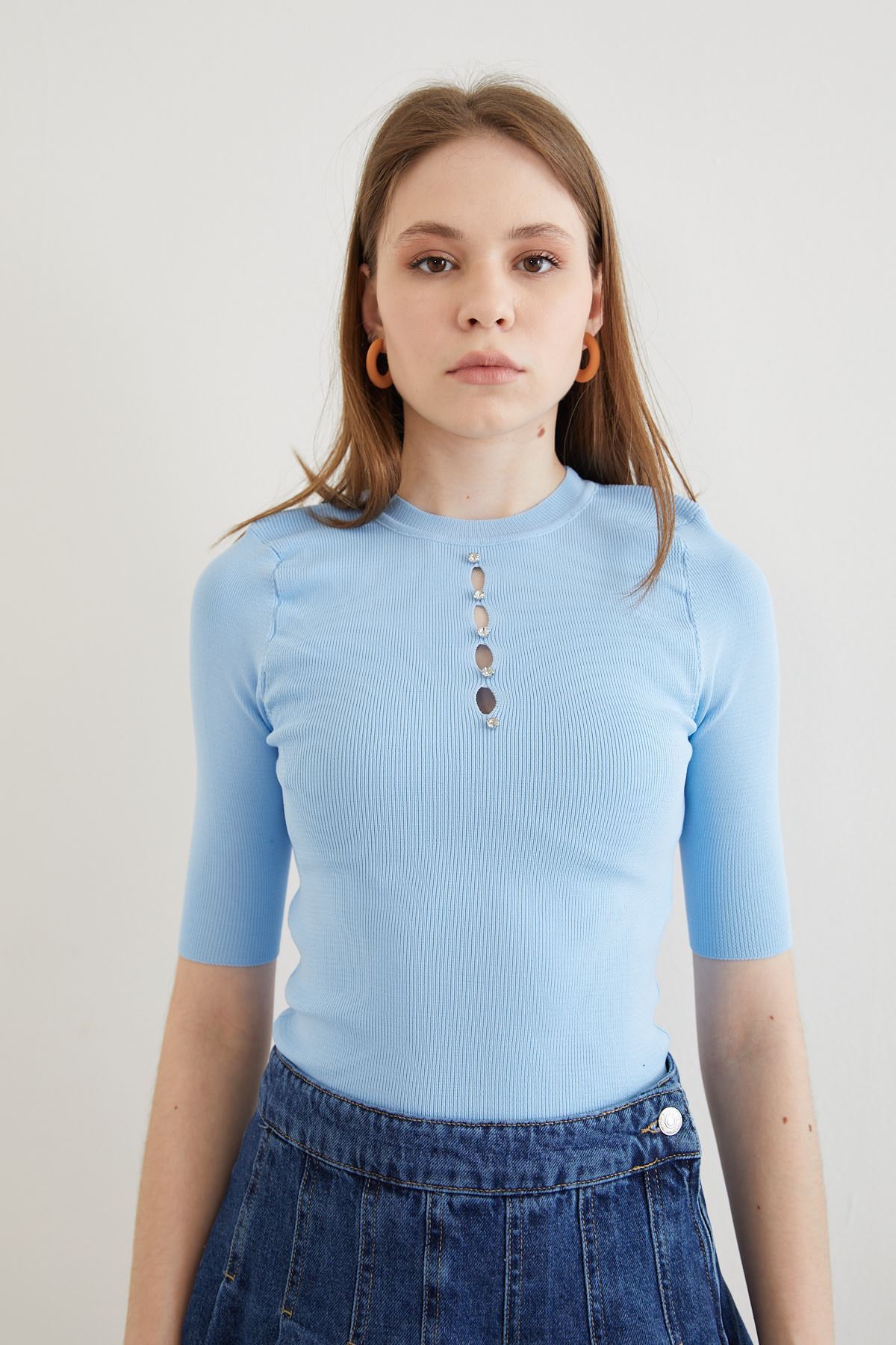 Önü Taşlı Bluz-Mavi