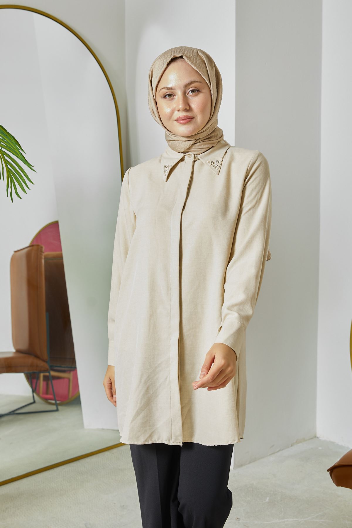 Sivri Yaka Keten Tunik-Taş