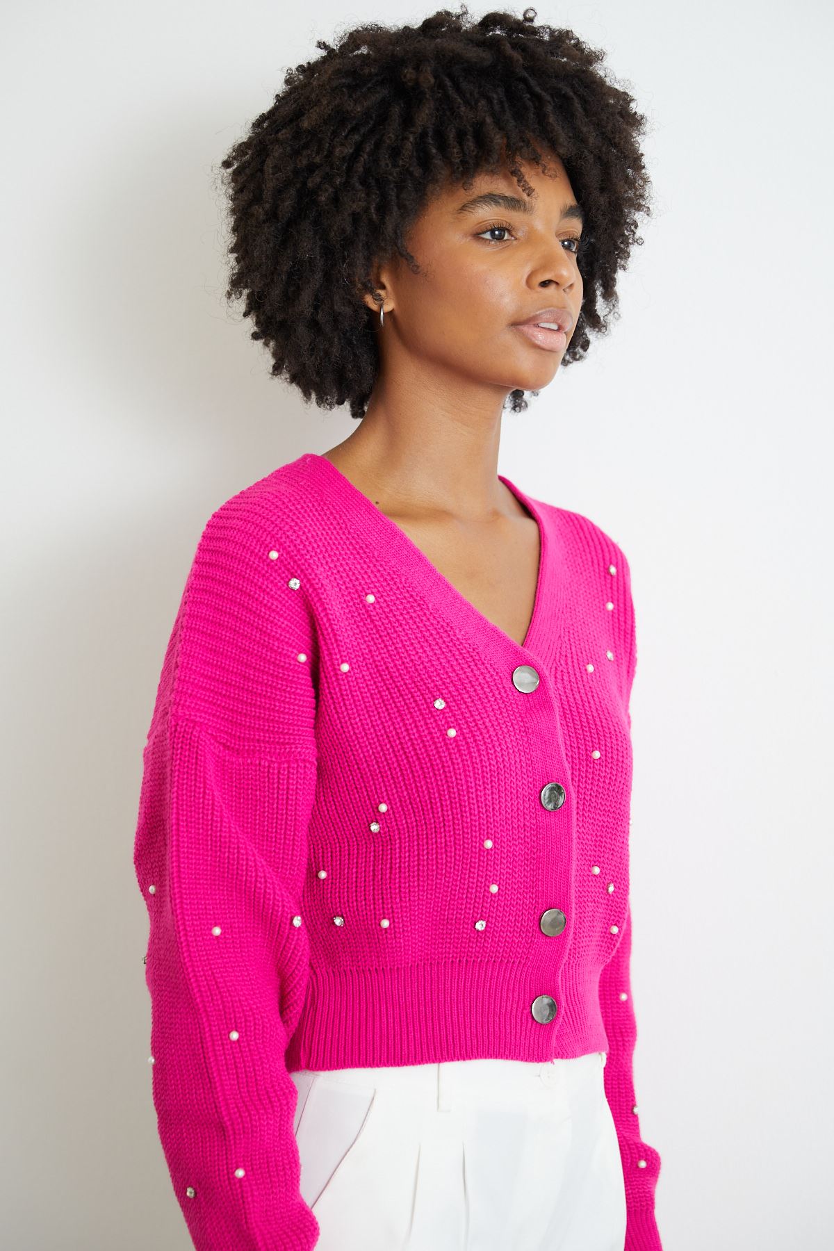 Taşlı Crop Hırka-Fuşya