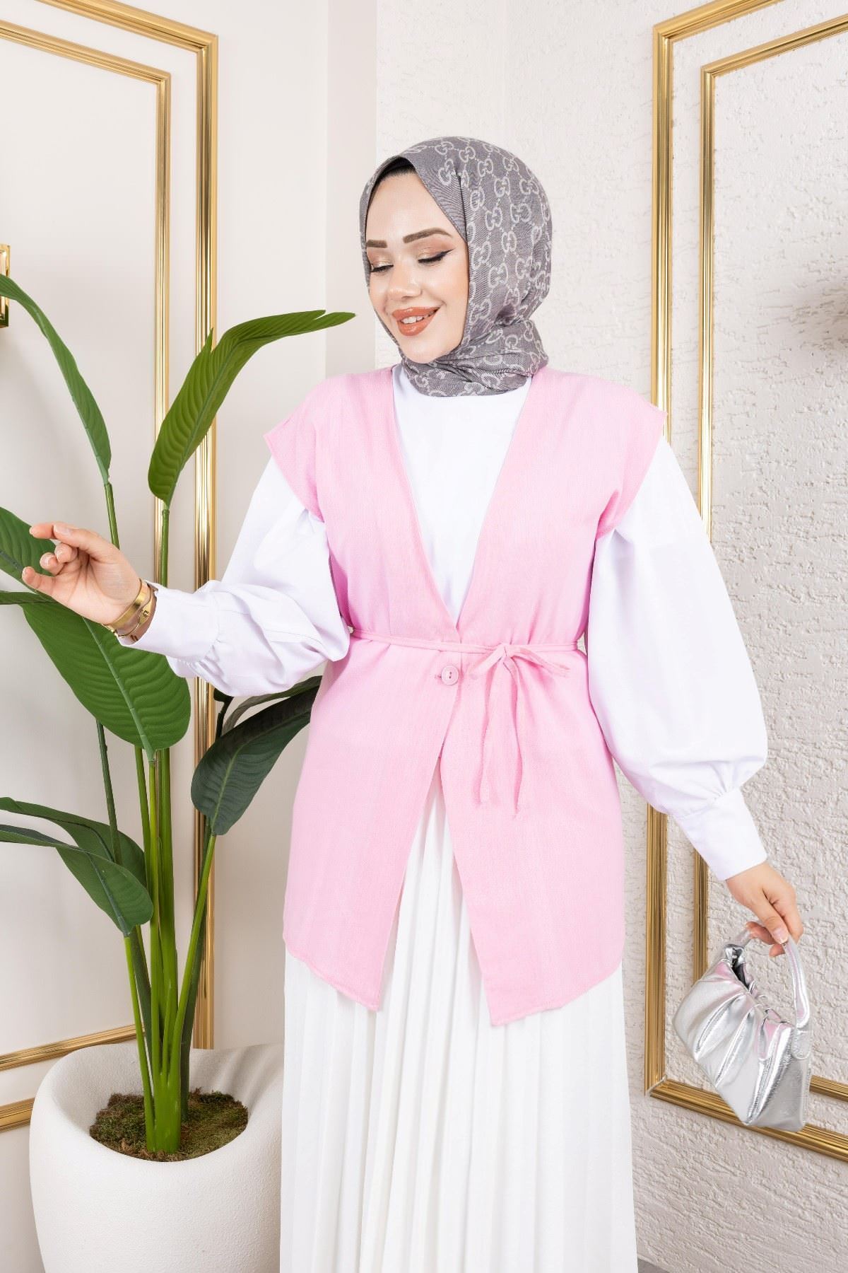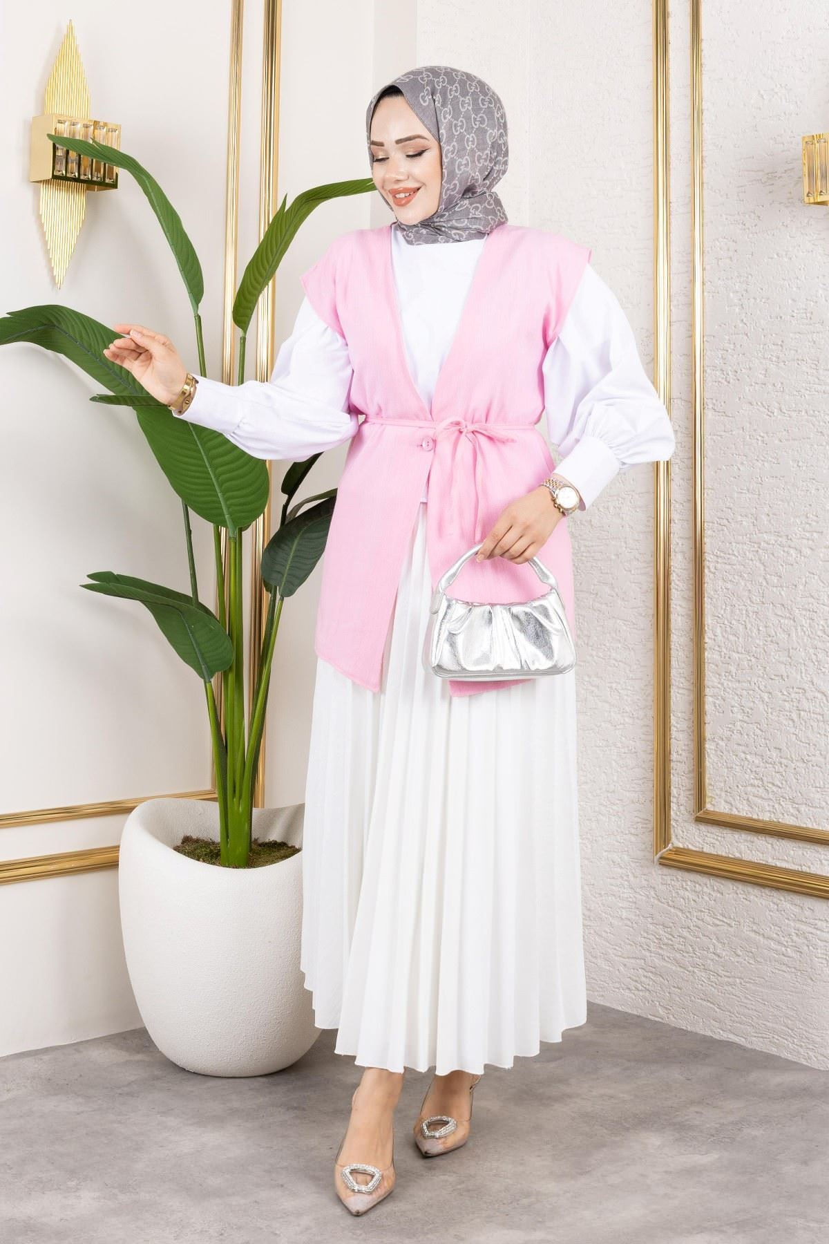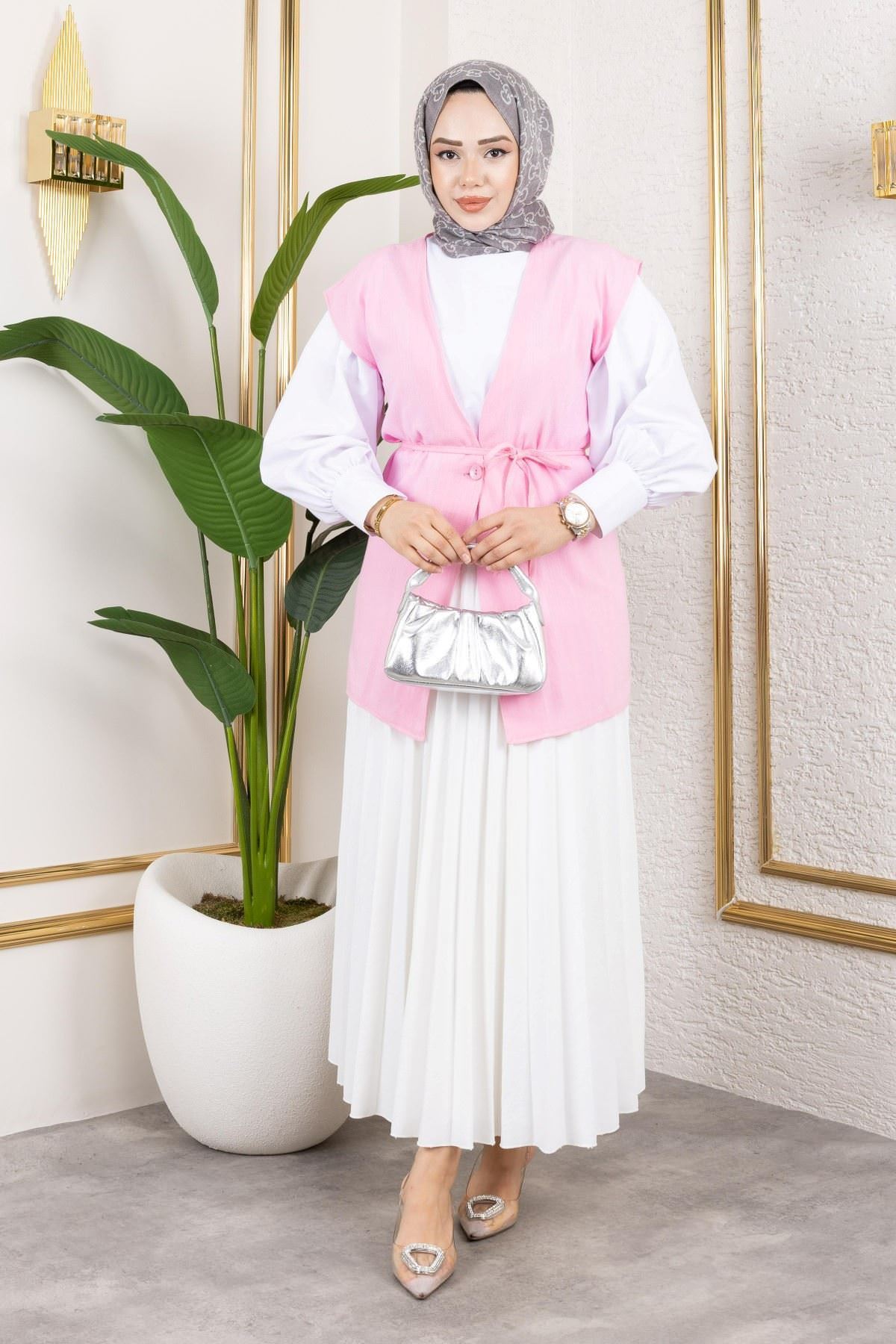 Tek Düğme Keten Yelek-Taş
