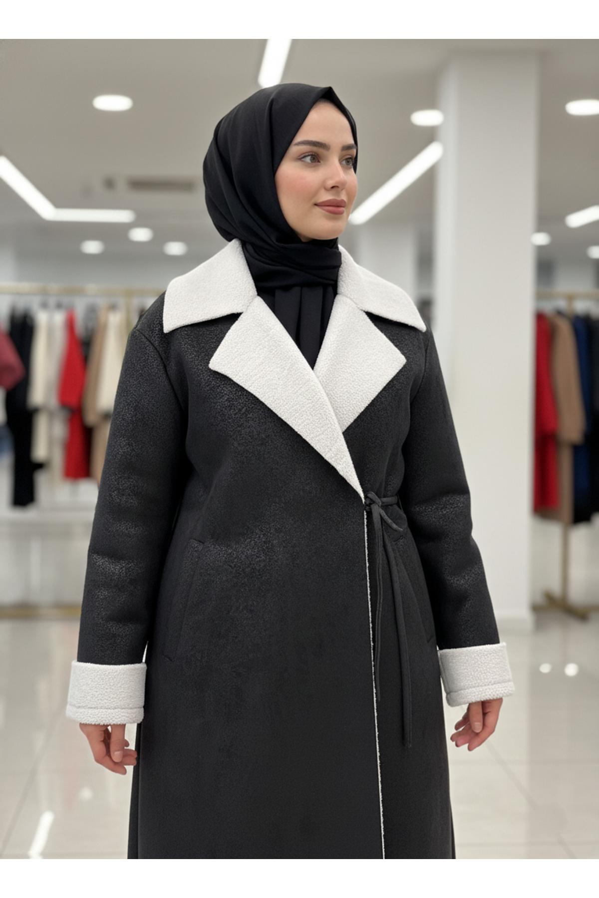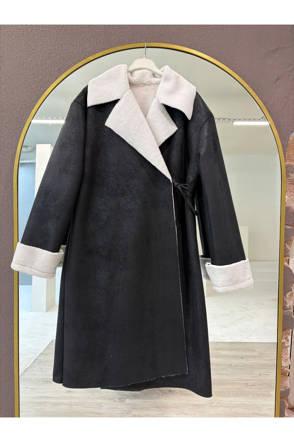 Uzun Boy Yan Bağlamalı Manşet Detaylı Kaban-Siyah