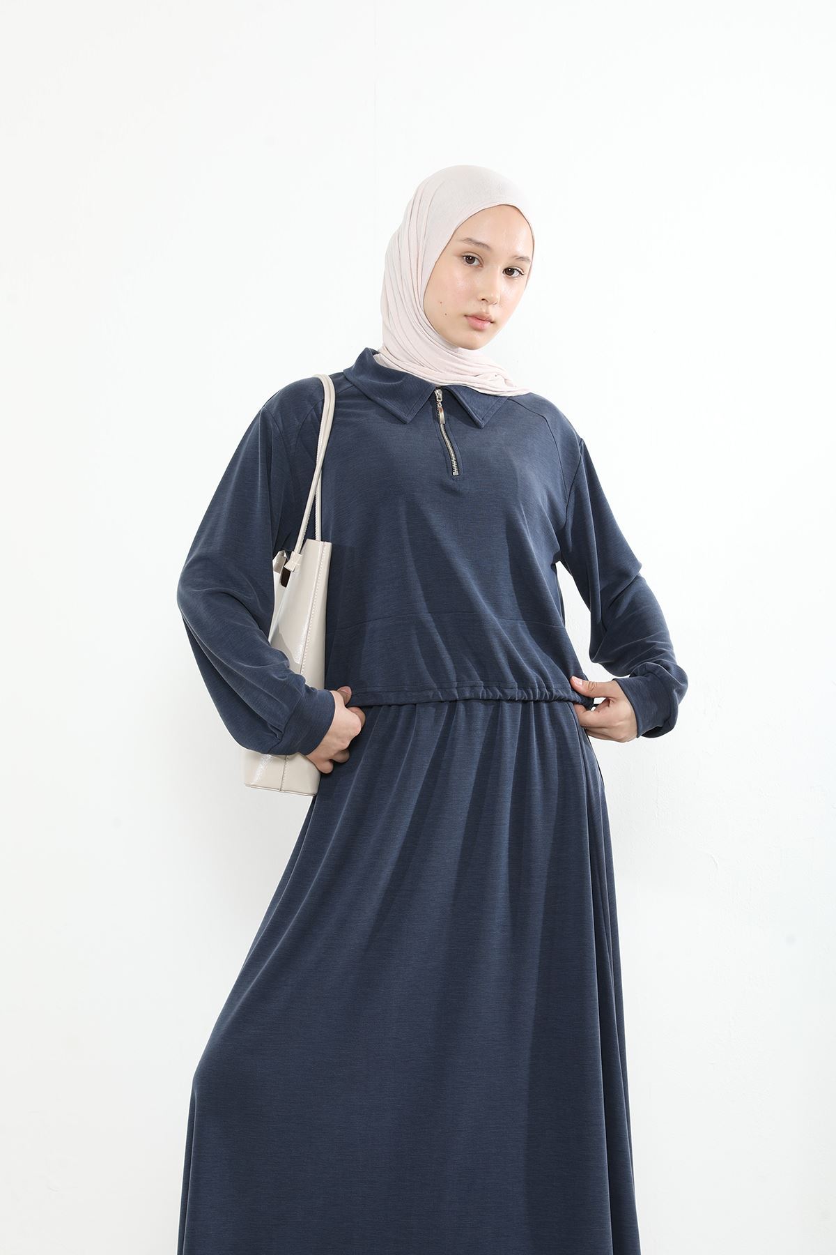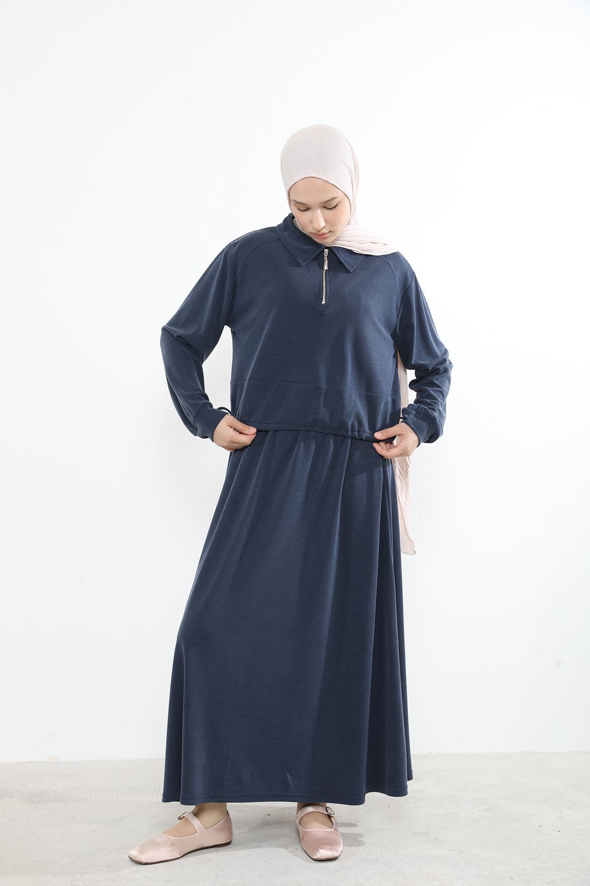 Yakalı Fermuar Detay Etekli Takım-Lacivert