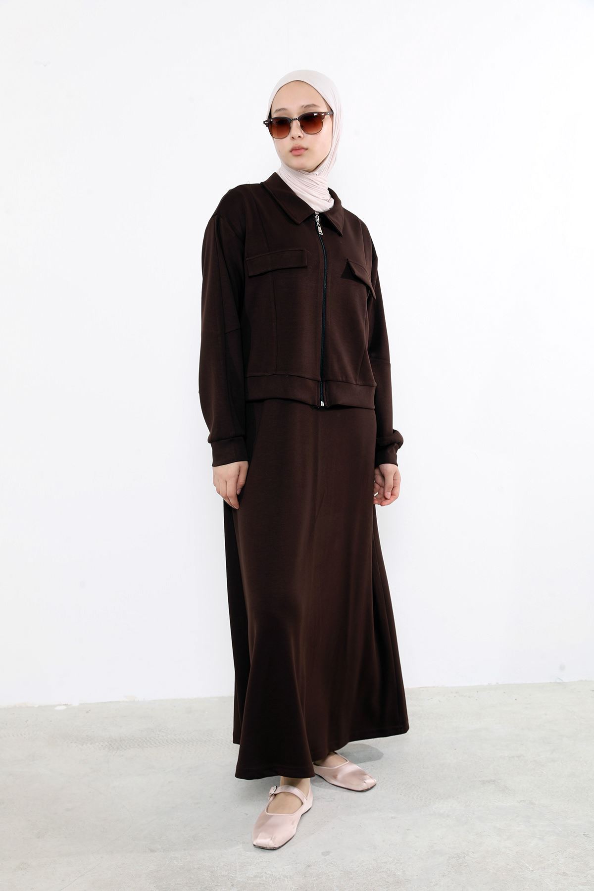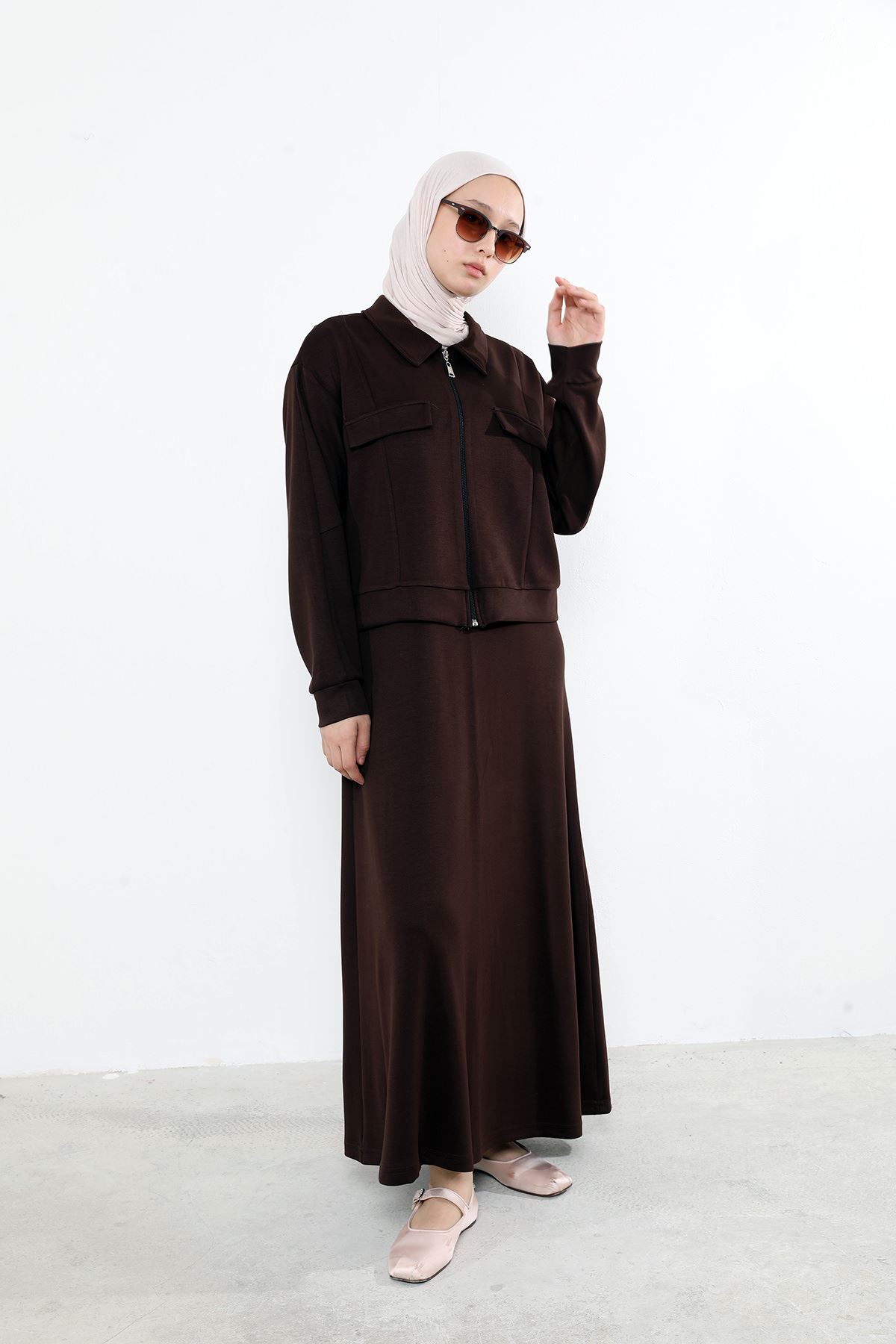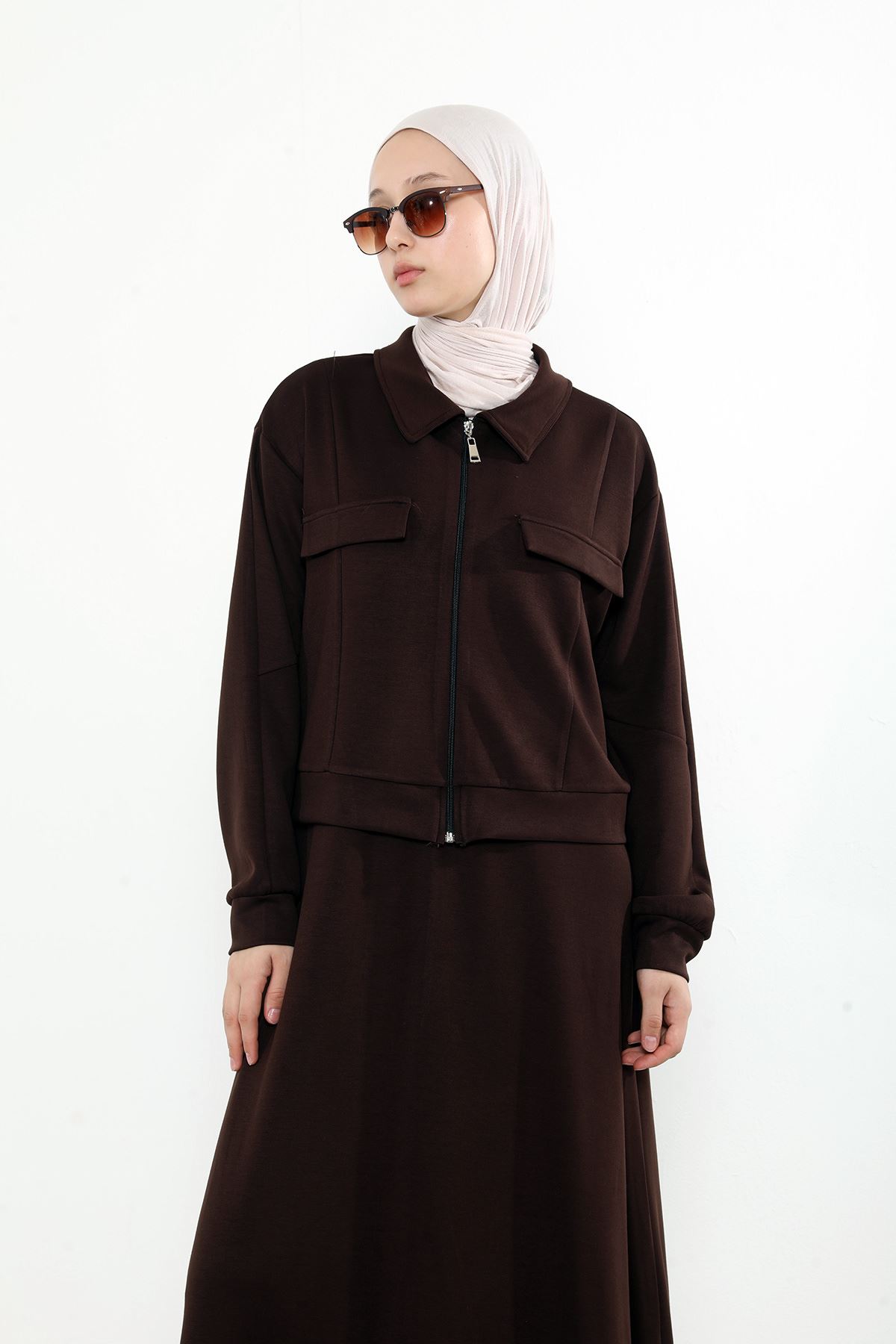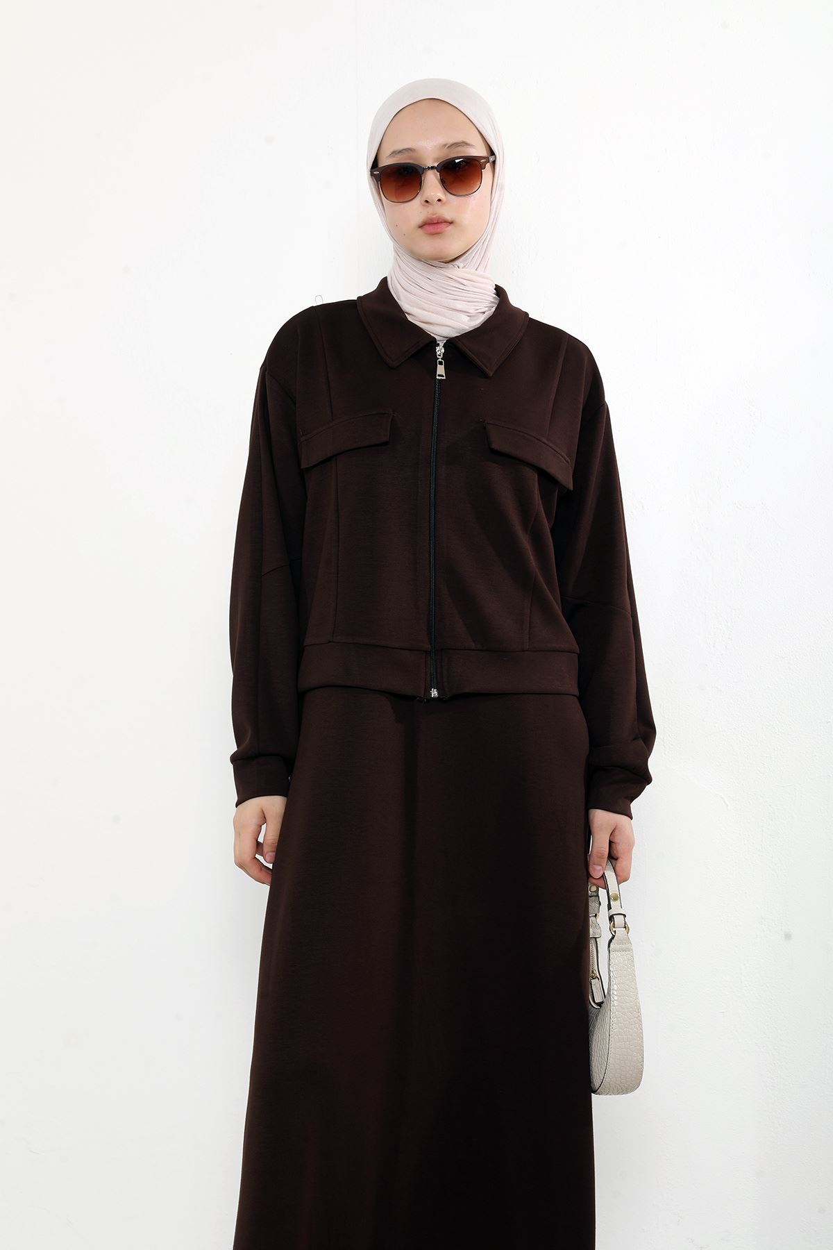Yakalı Fermuar Detay Jileli Takım-Kahve