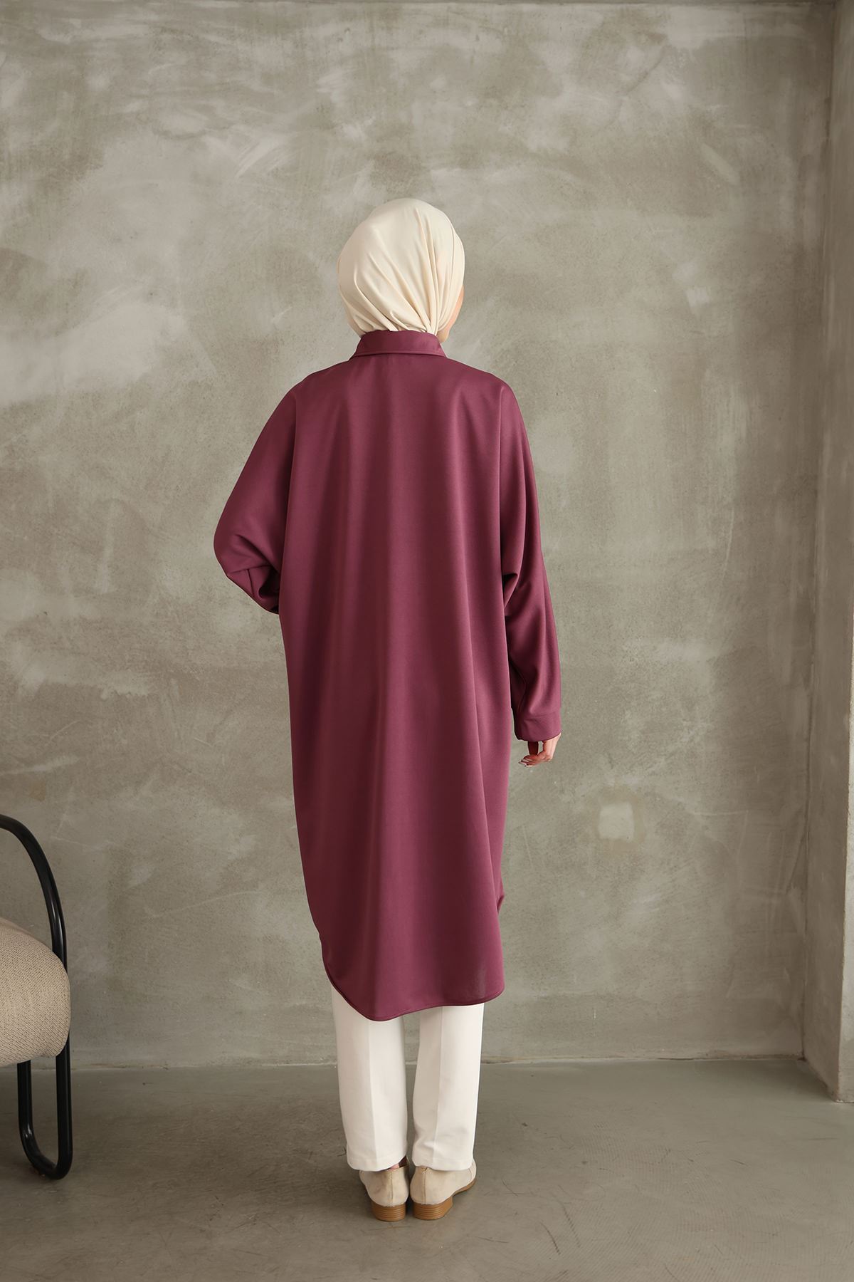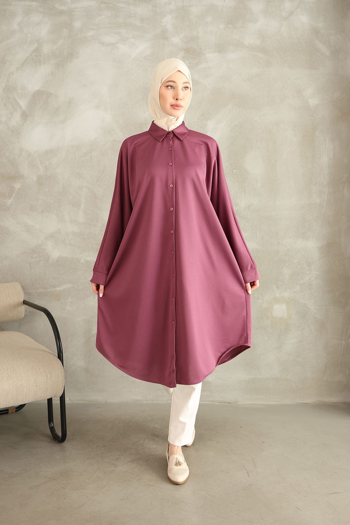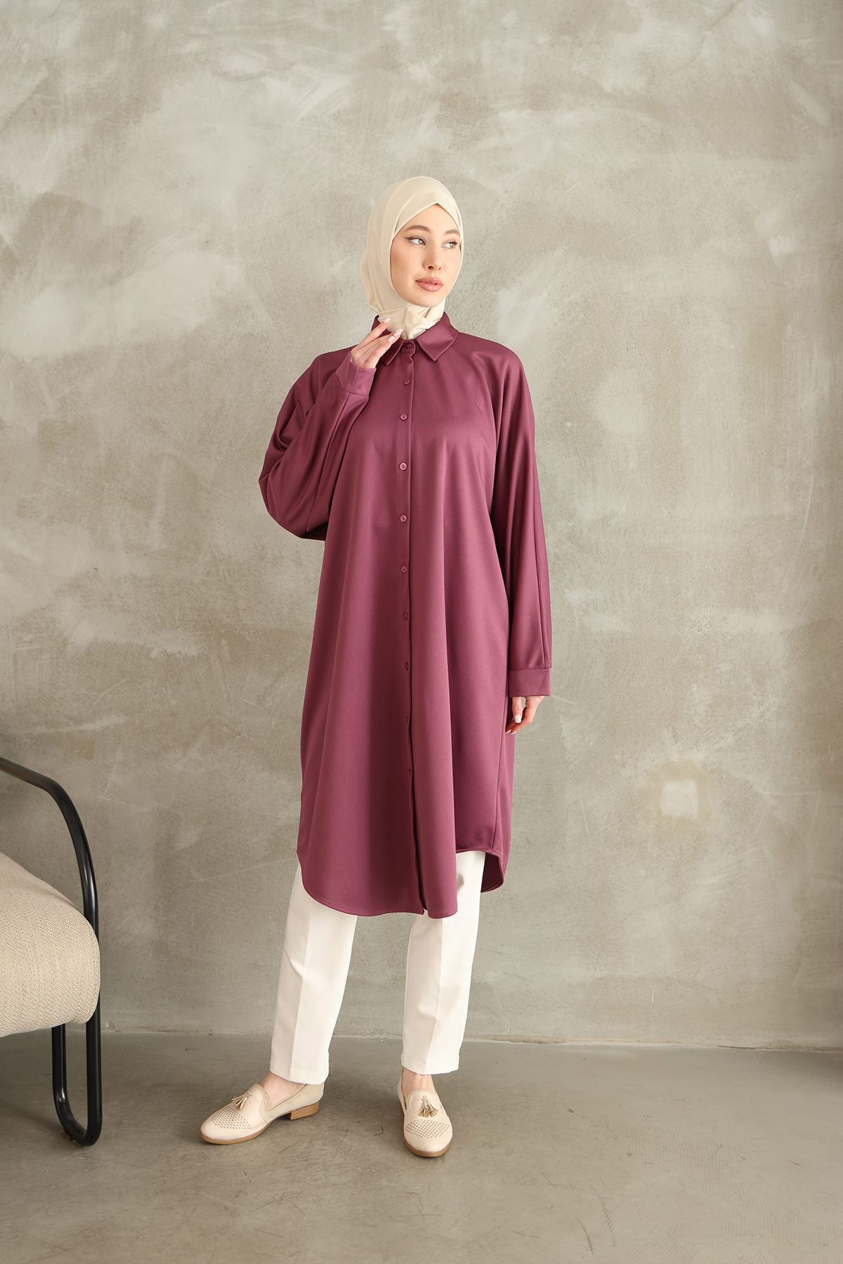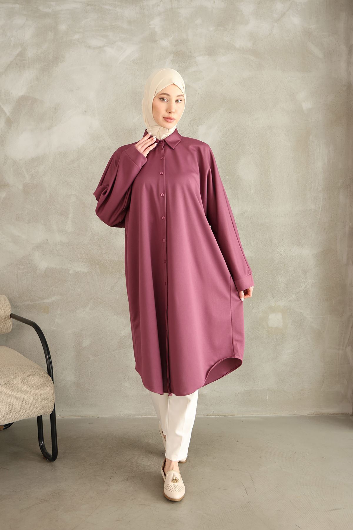 Kadın Oval Kesim Rahat Kalıp Boydan Düğmeli Yarasa Kol Detaylı Uzun Tesettür Tunik-Mor