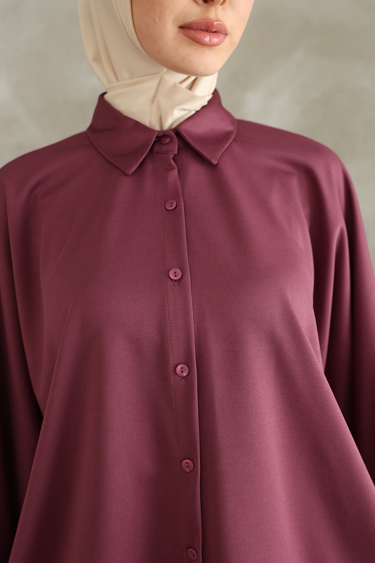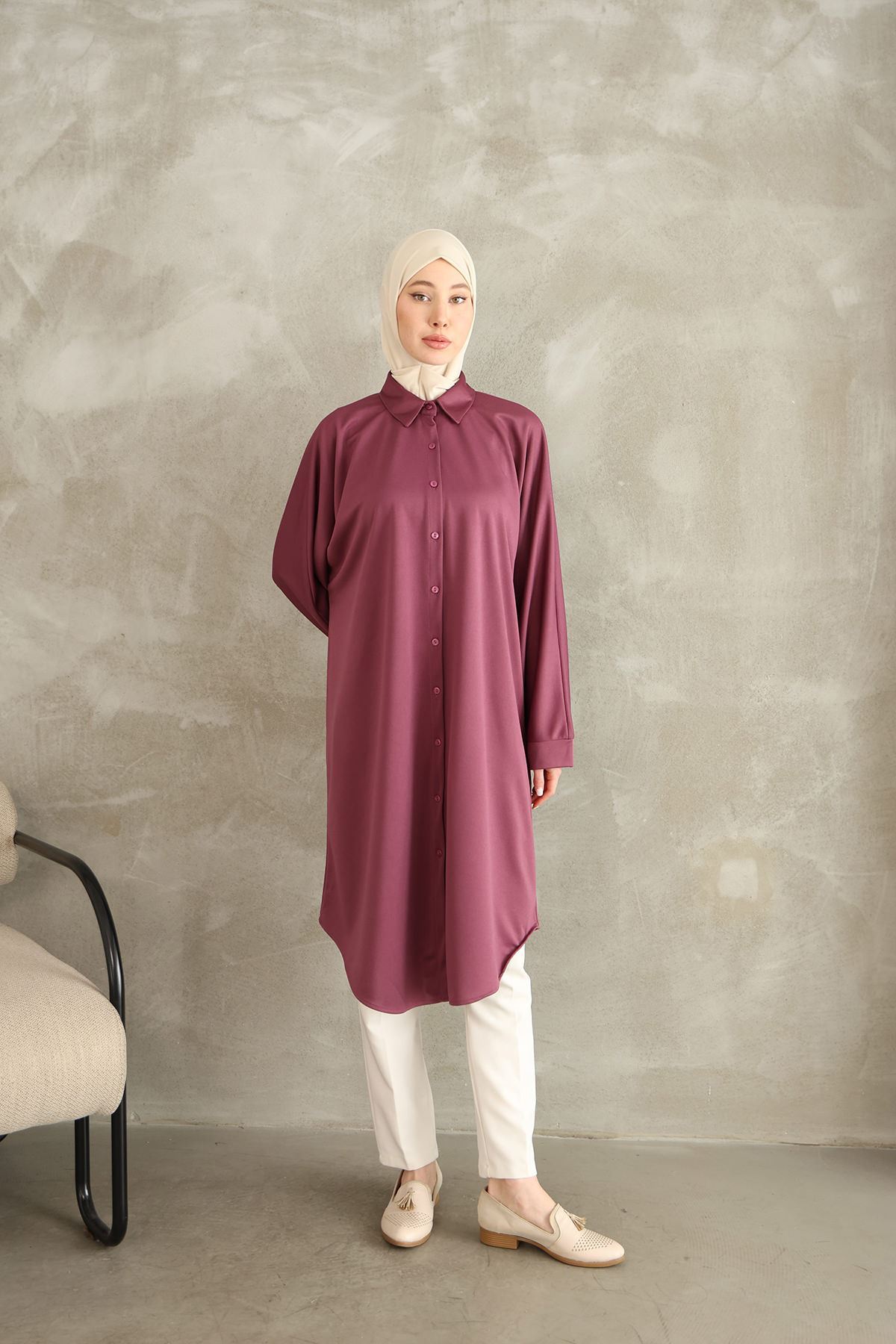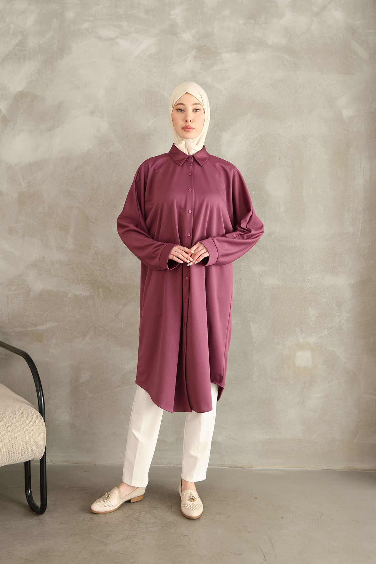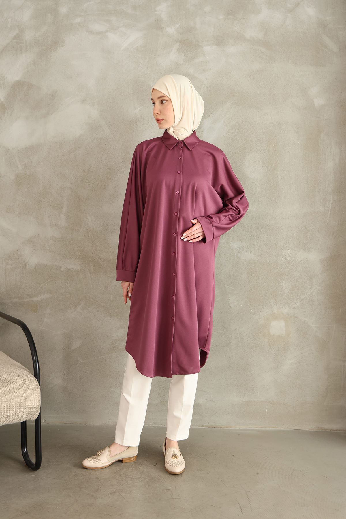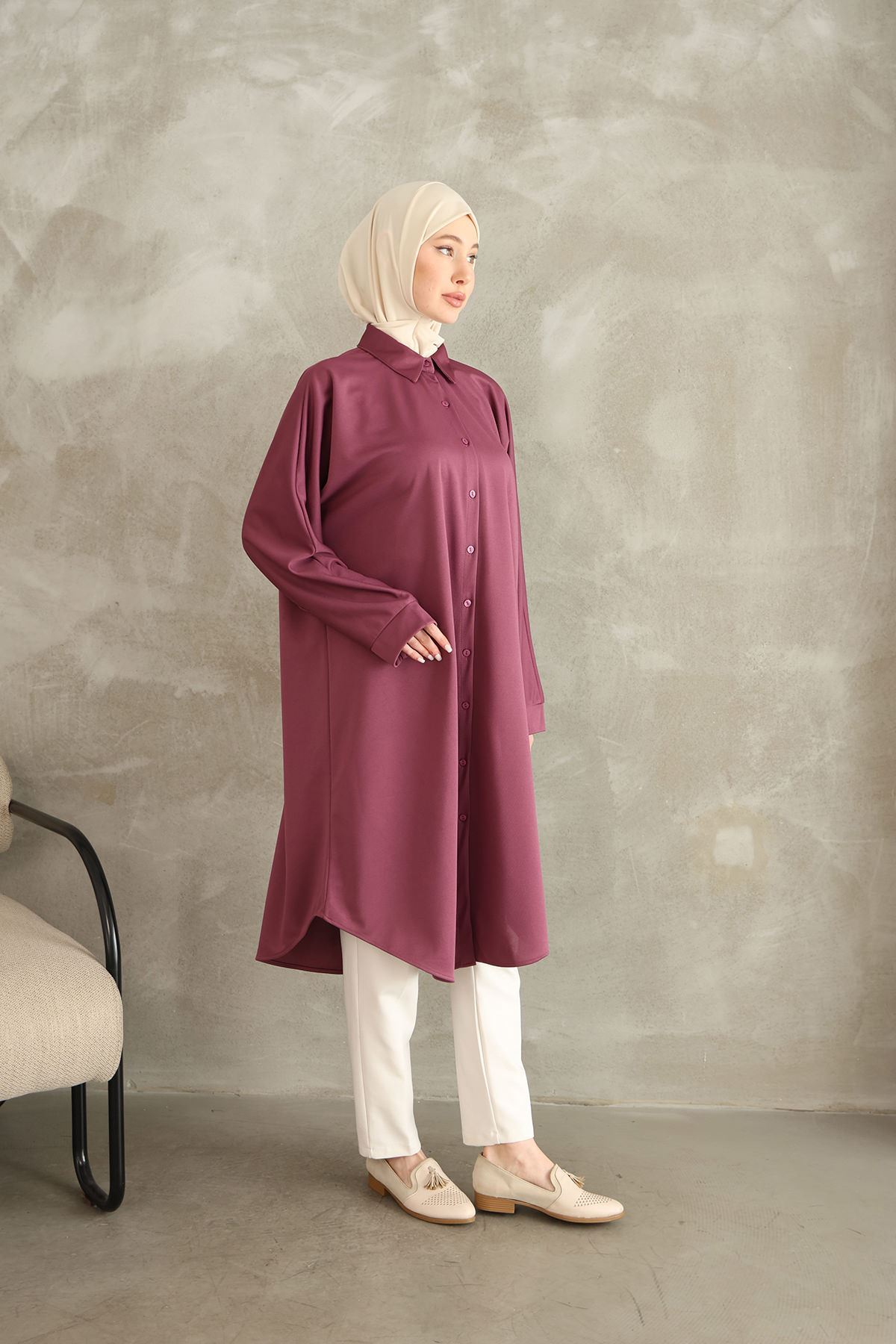 Kadın Oval Kesim Rahat Kalıp Boydan Düğmeli Yarasa Kol Detaylı Uzun Tesettür Tunik-Mor