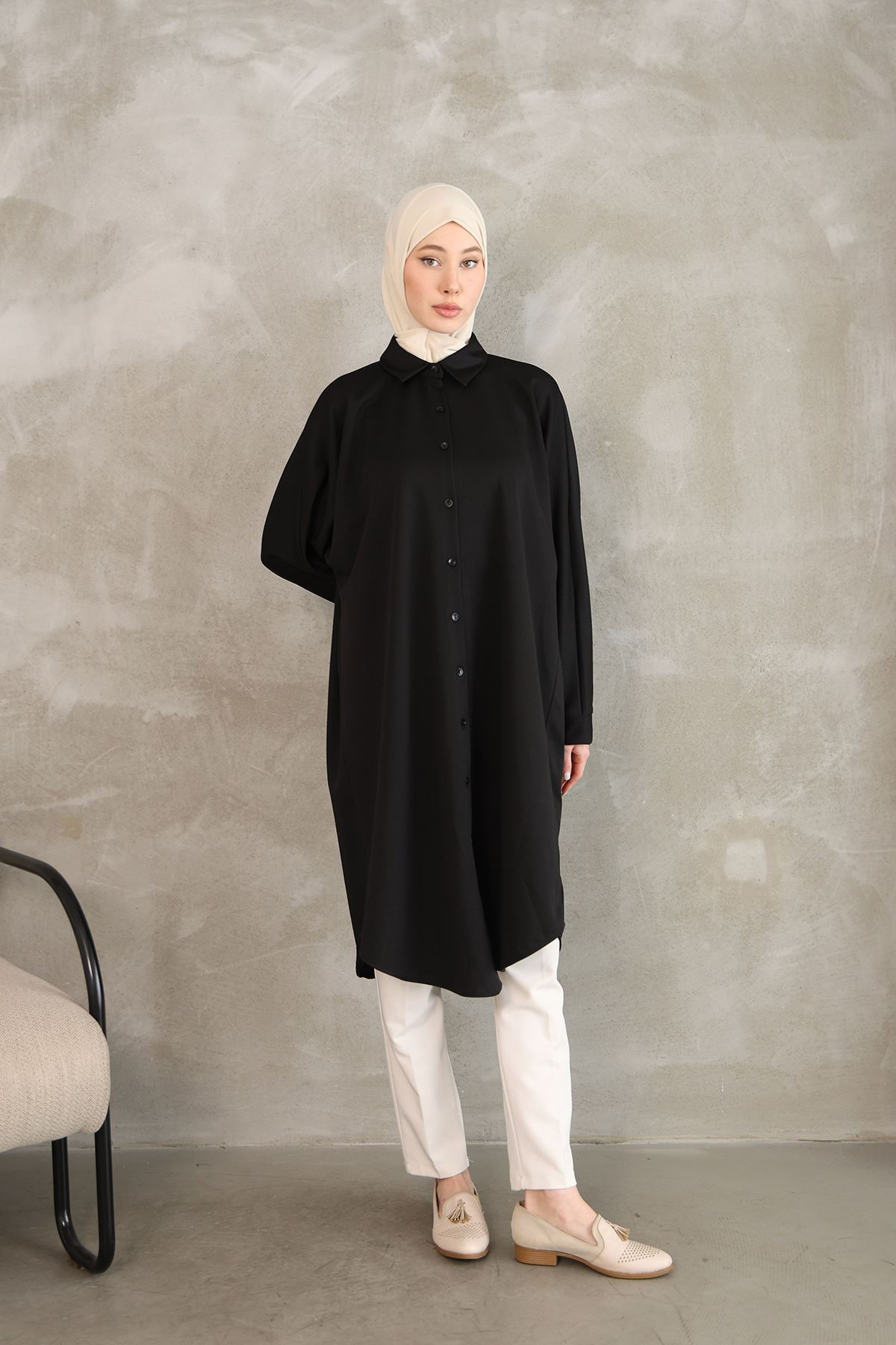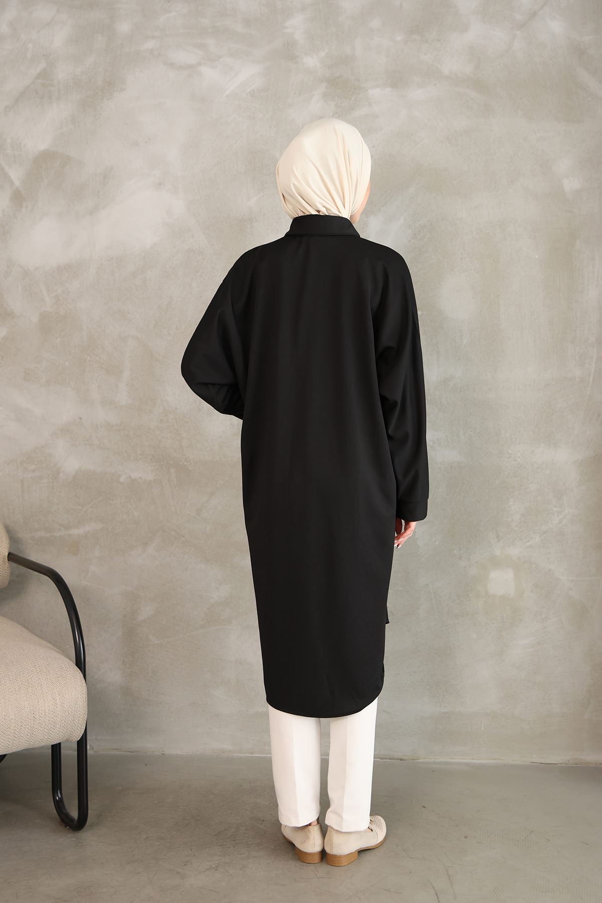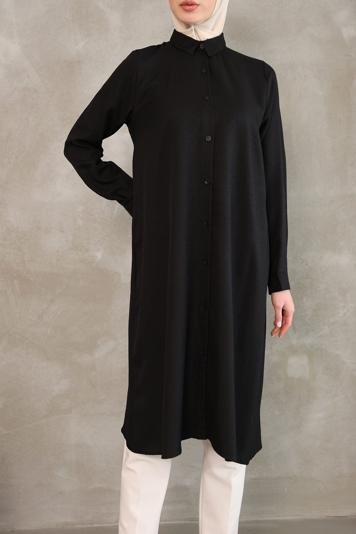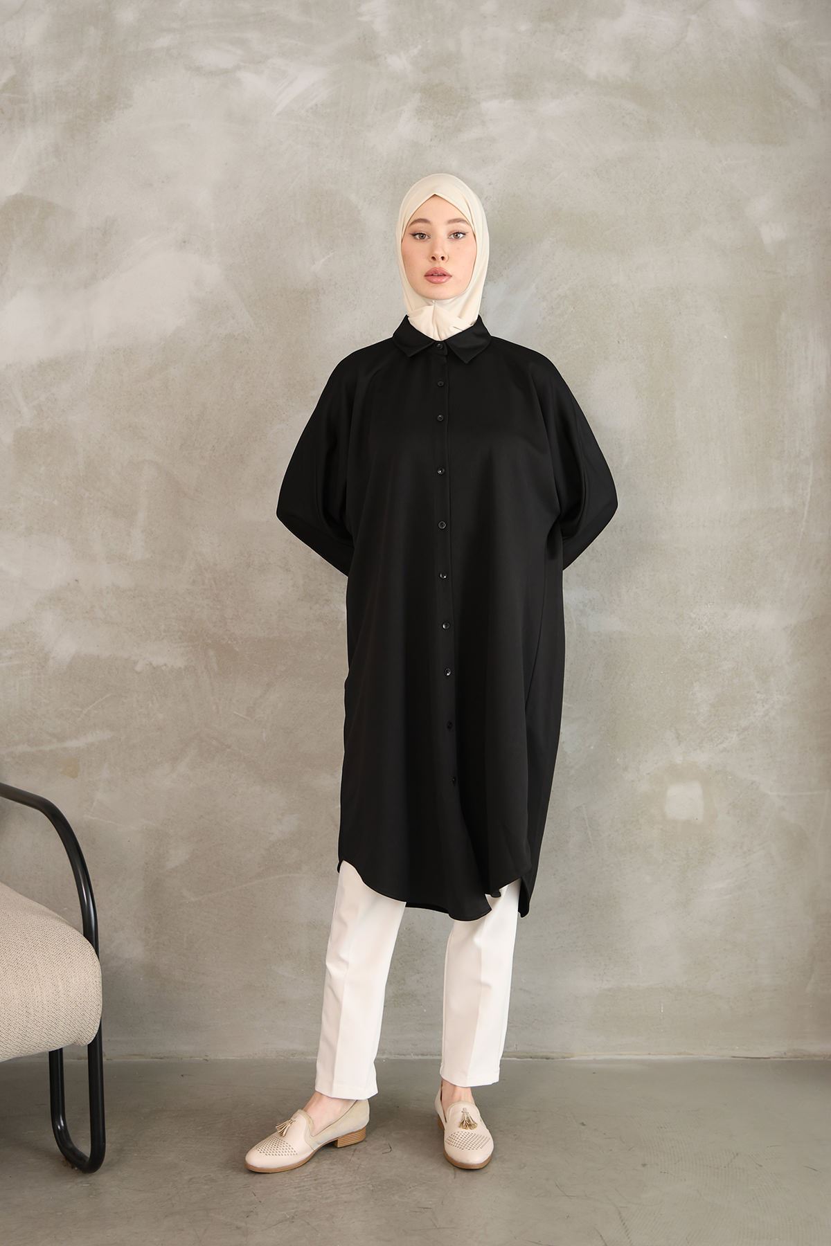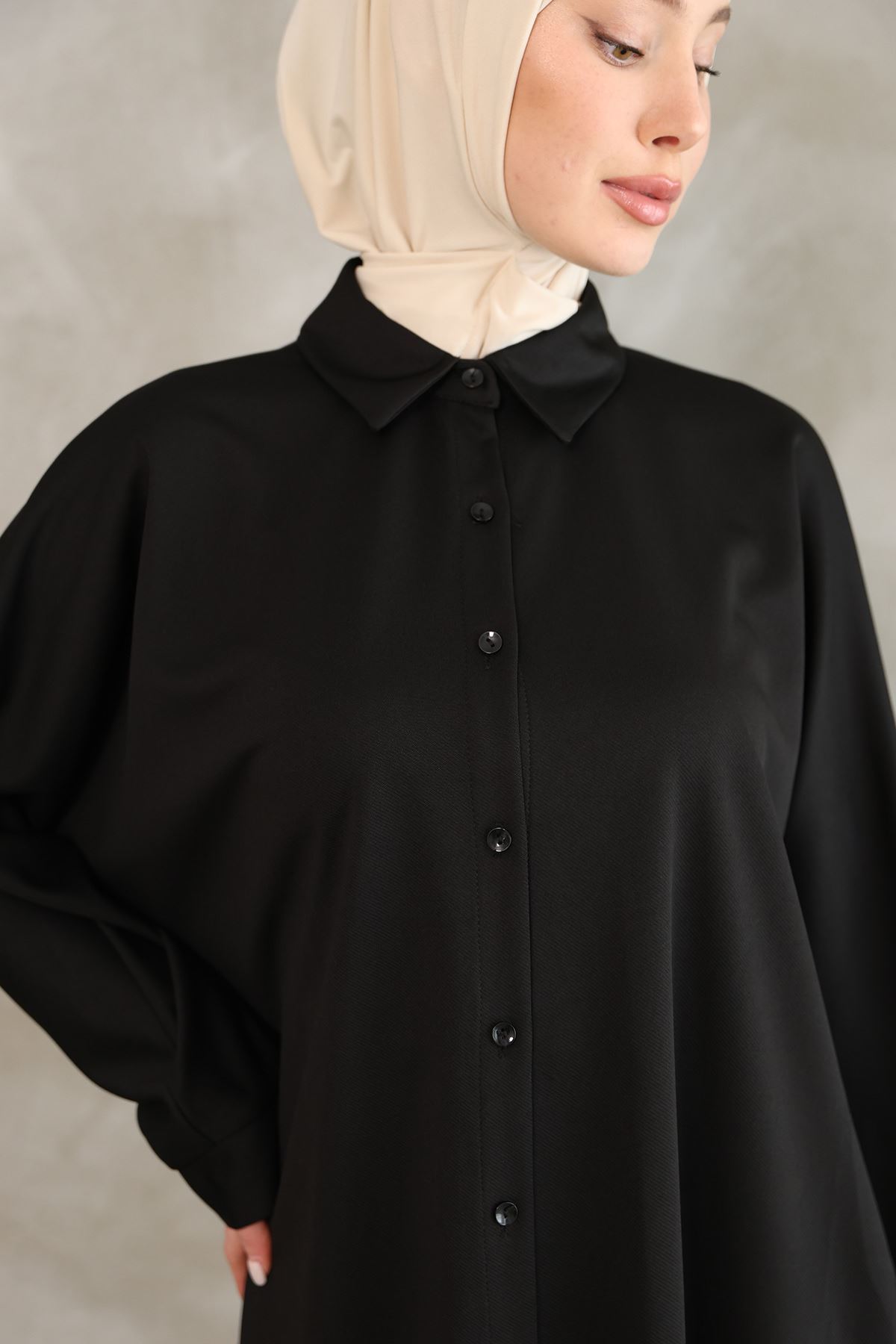 Kadın Oval Kesim Rahat Kalıp Boydan Düğmeli Yarasa Kol Detaylı Uzun Tesettür Tunik-Siyah