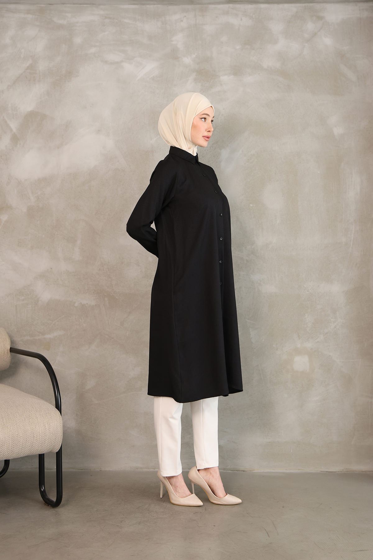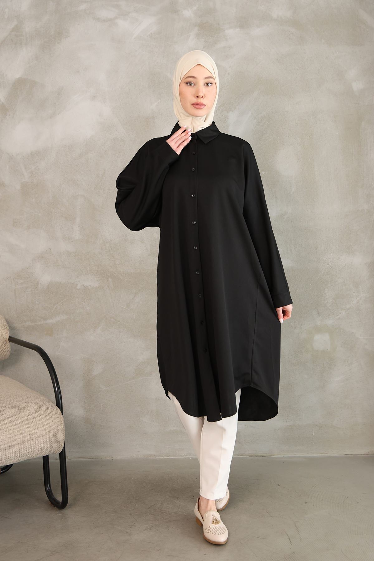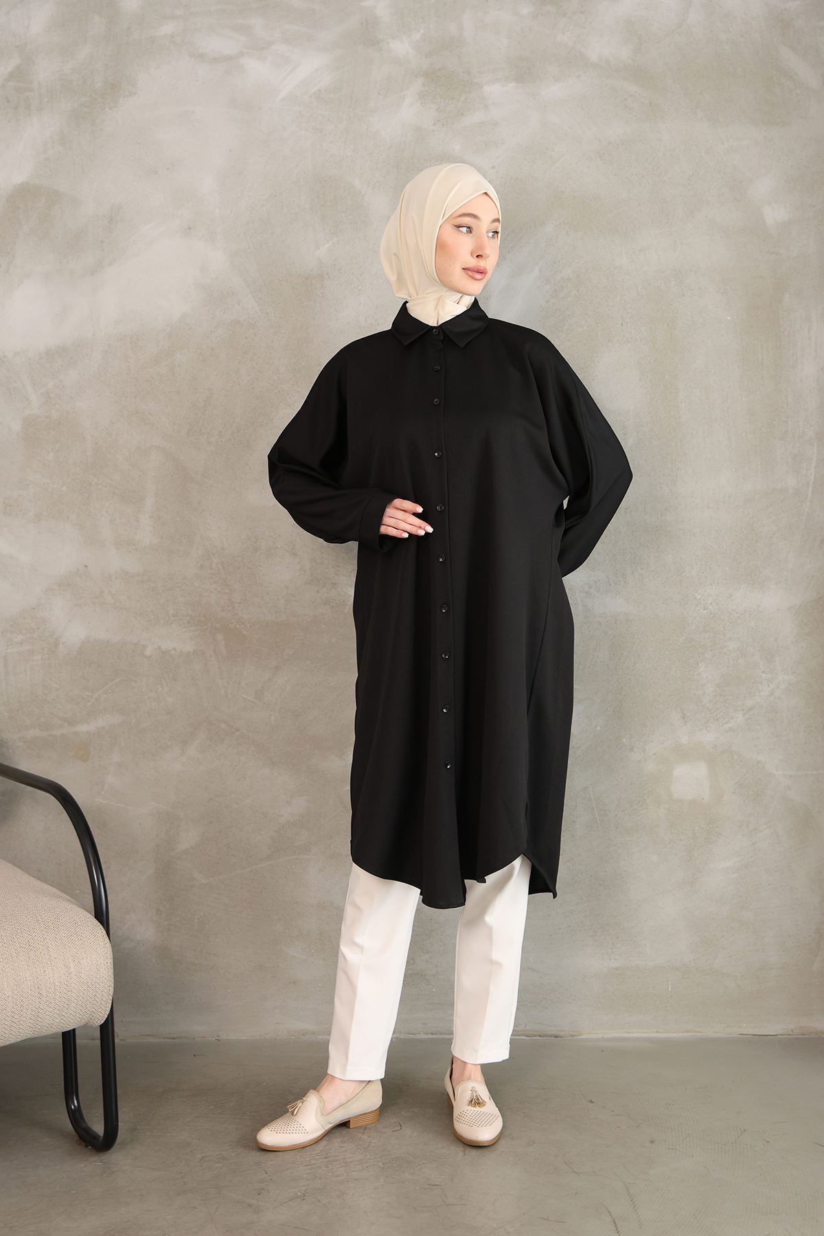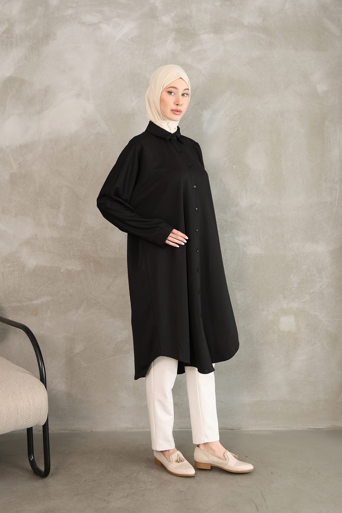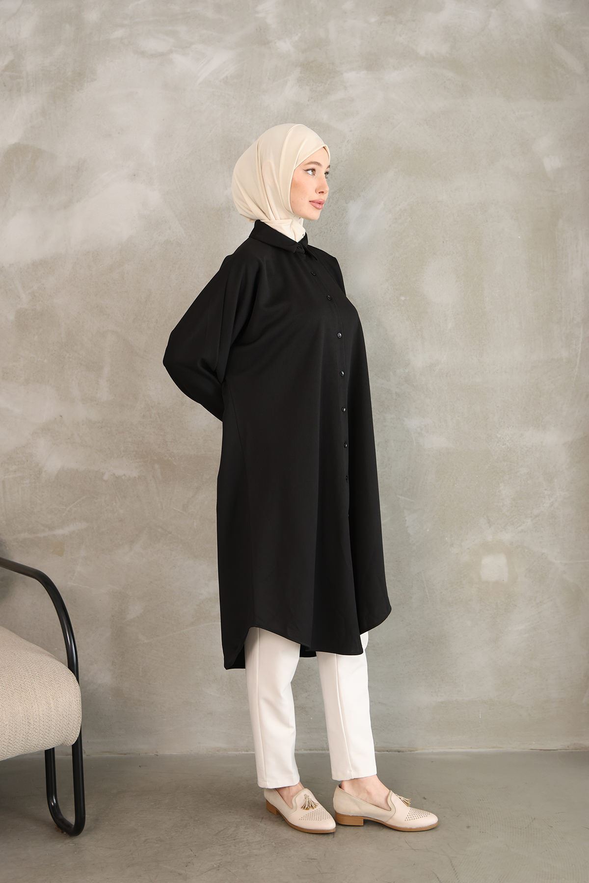 Kadın Oval Kesim Rahat Kalıp Boydan Düğmeli Yarasa Kol Detaylı Uzun Tesettür Tunik-Siyah