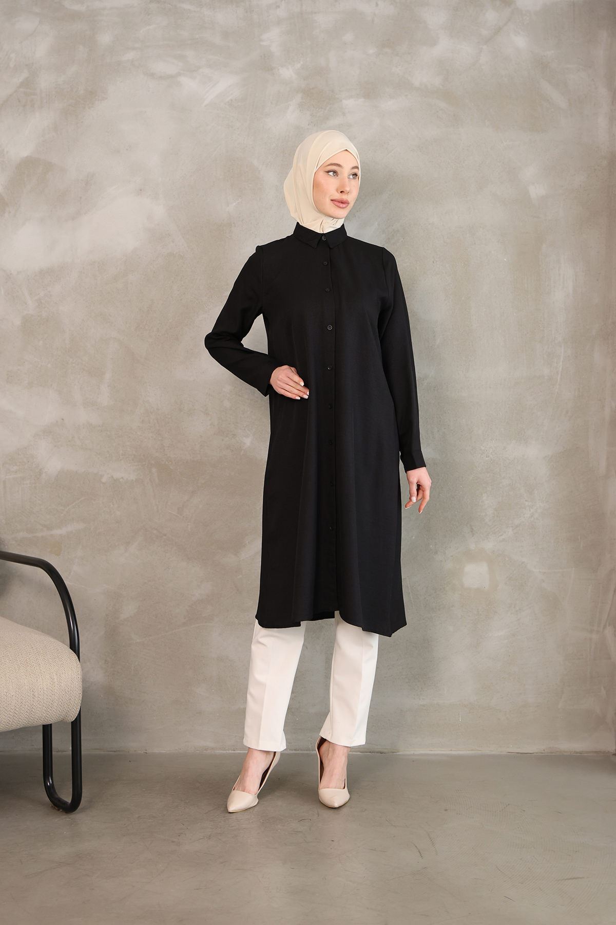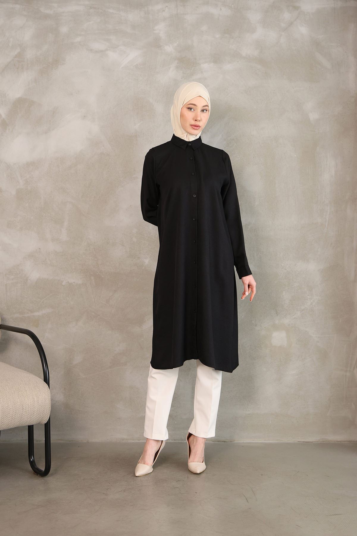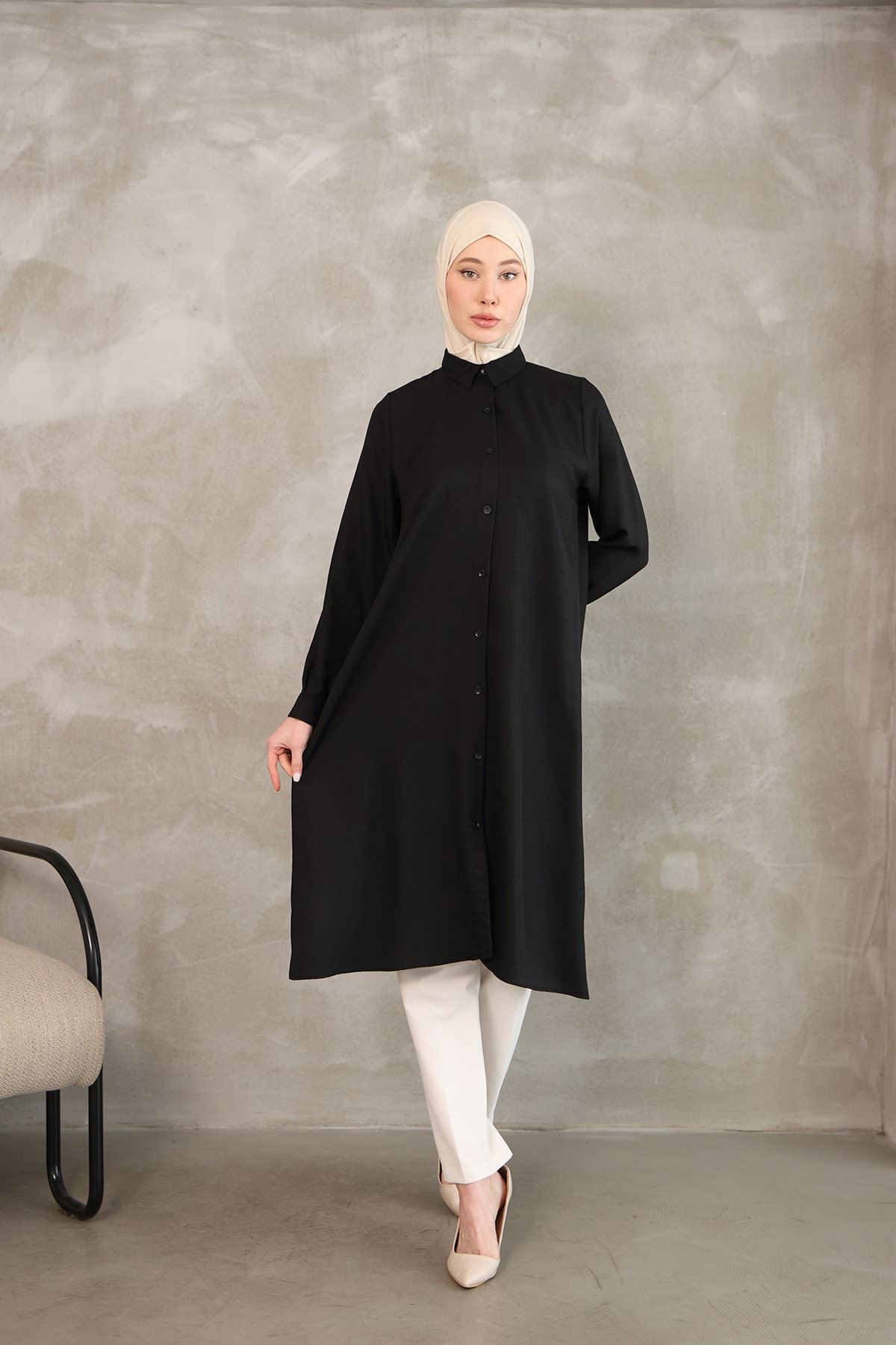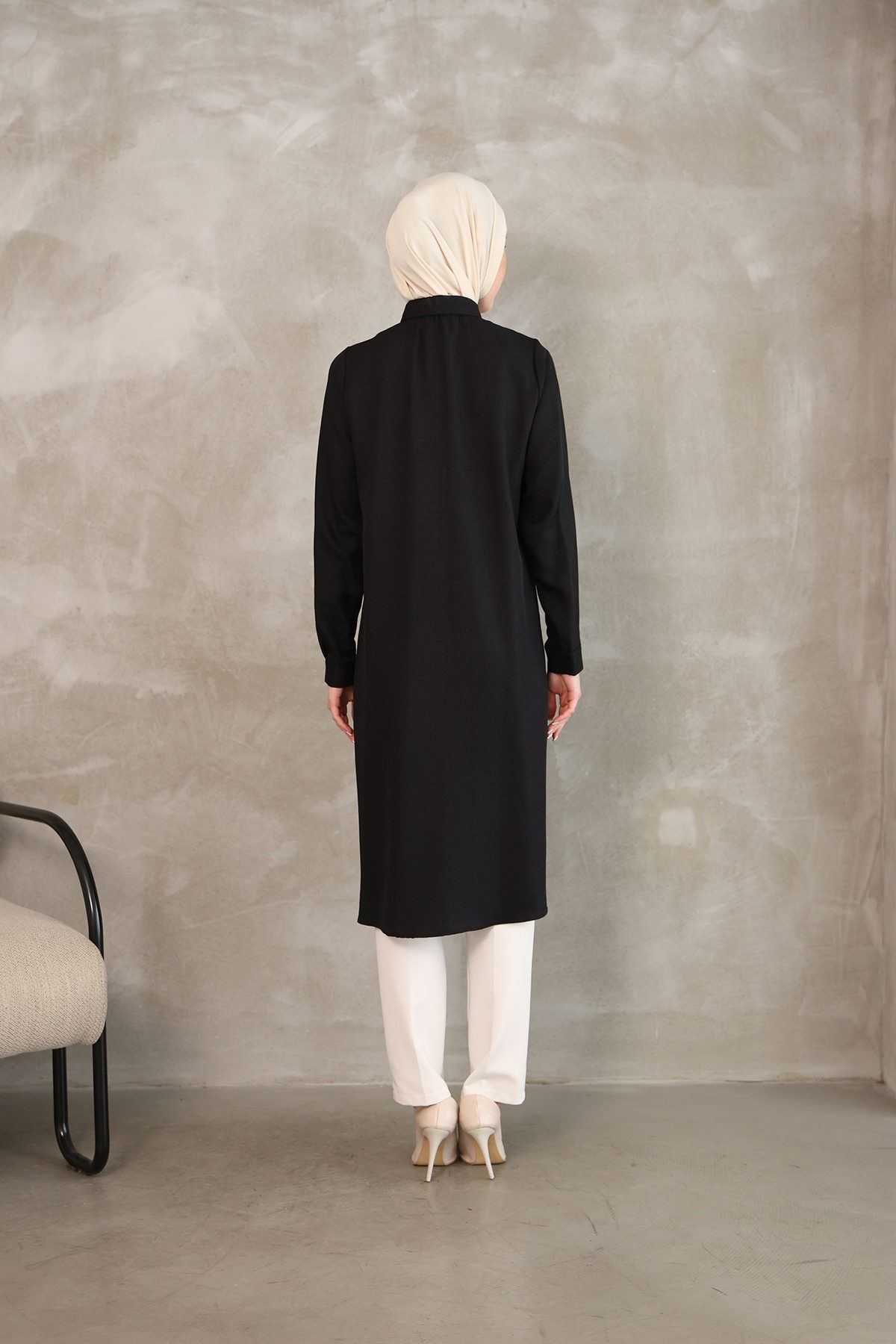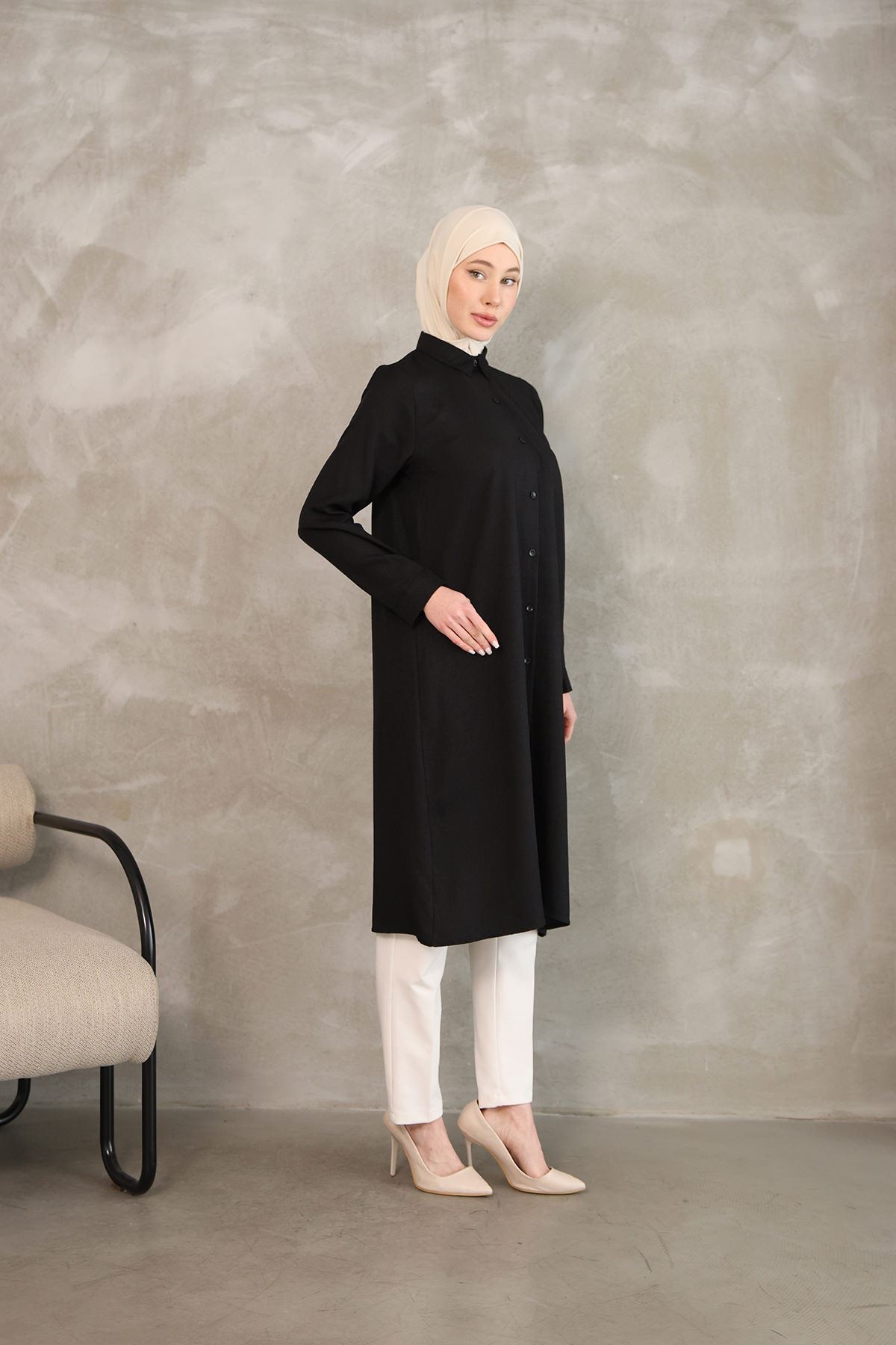 Kadın Oval Kesim Rahat Kalıp Boydan Düğmeli Yarasa Kol Detaylı Uzun Tesettür Tunik-Siyah