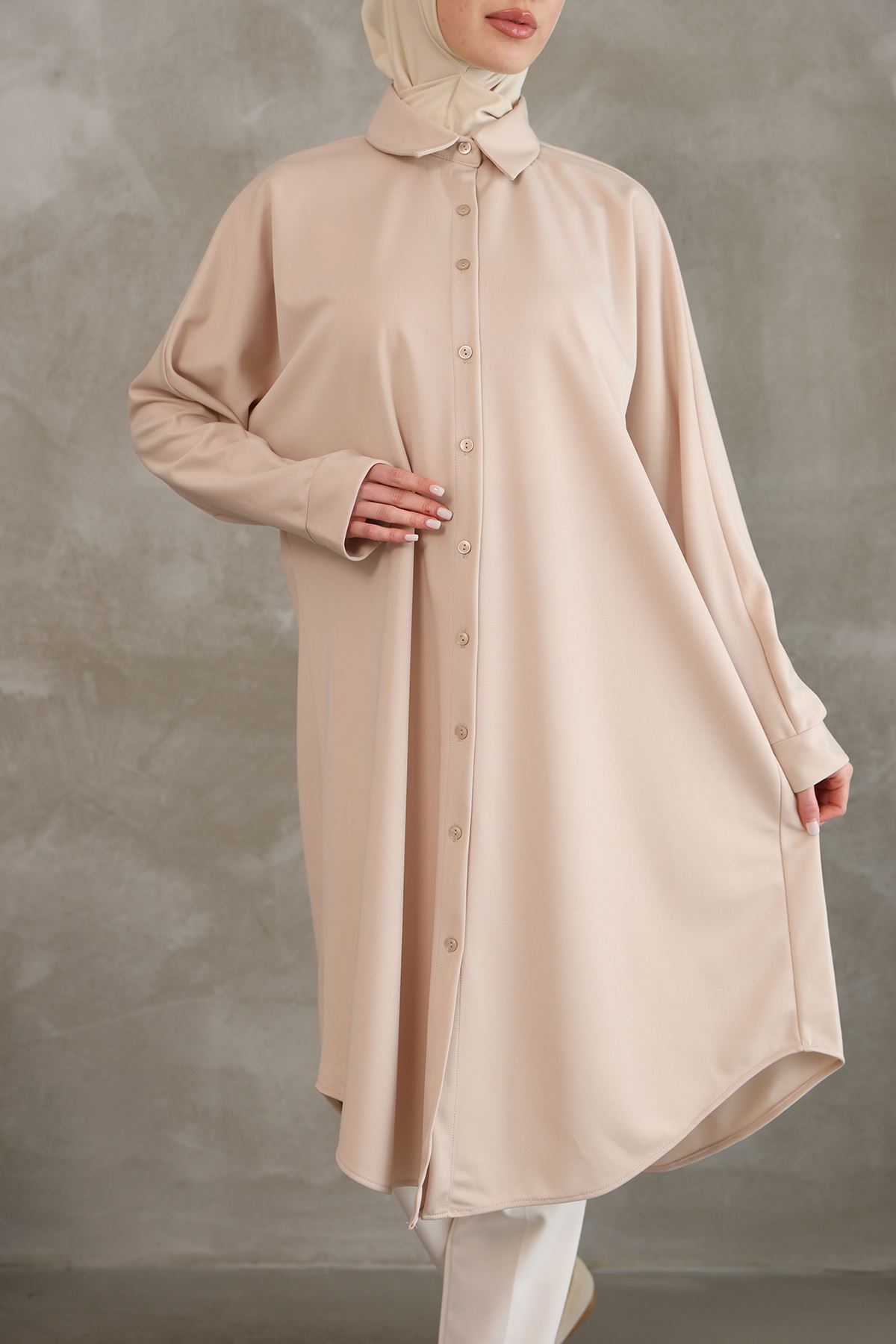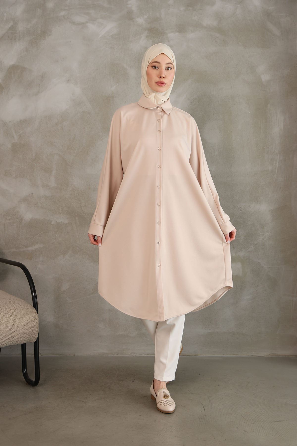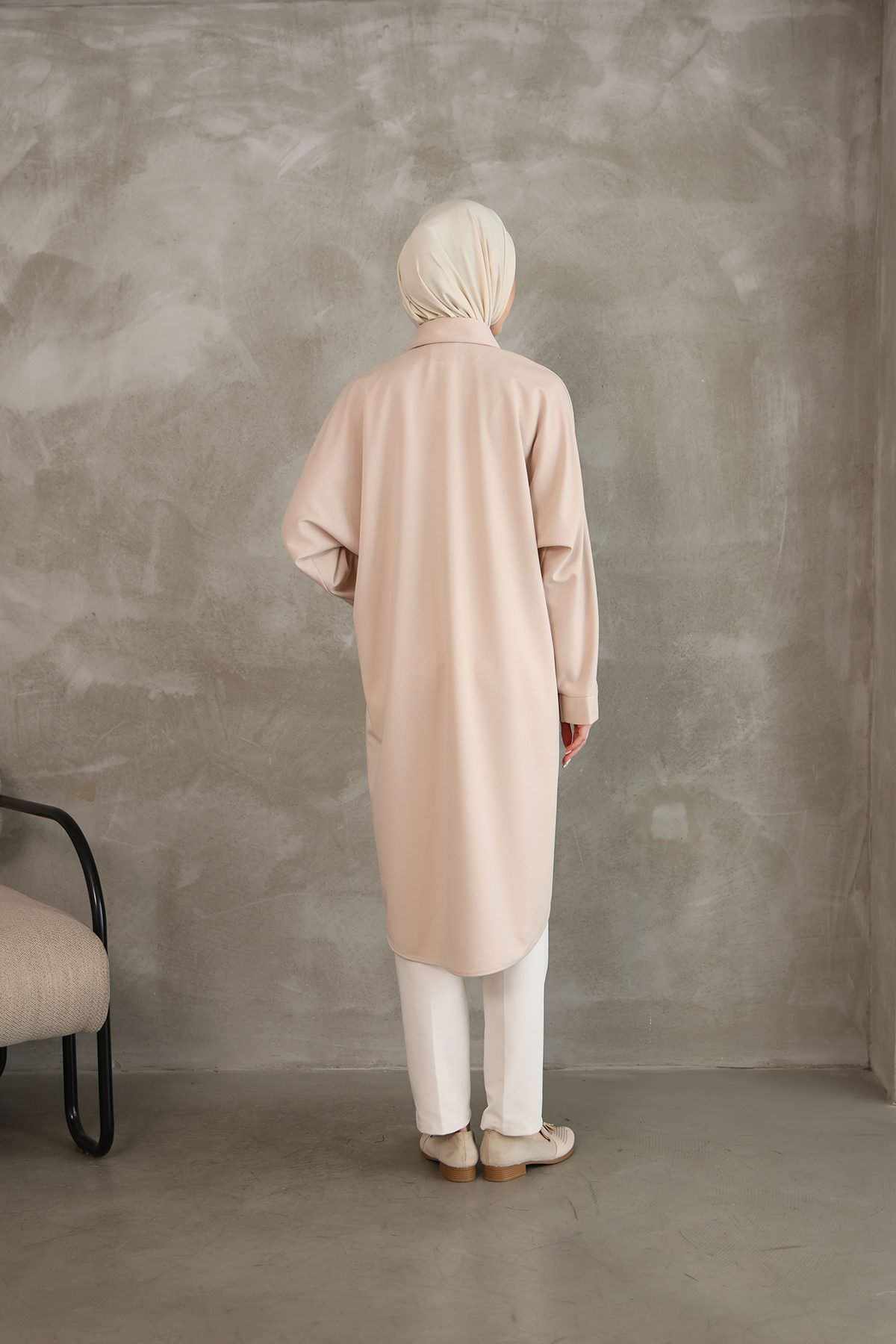 Kadın Oval Kesim Rahat Kalıp Boydan Düğmeli Yarasa Kol Detaylı Uzun Tesettür Tunik-Taş