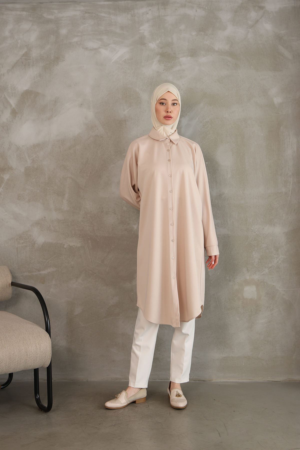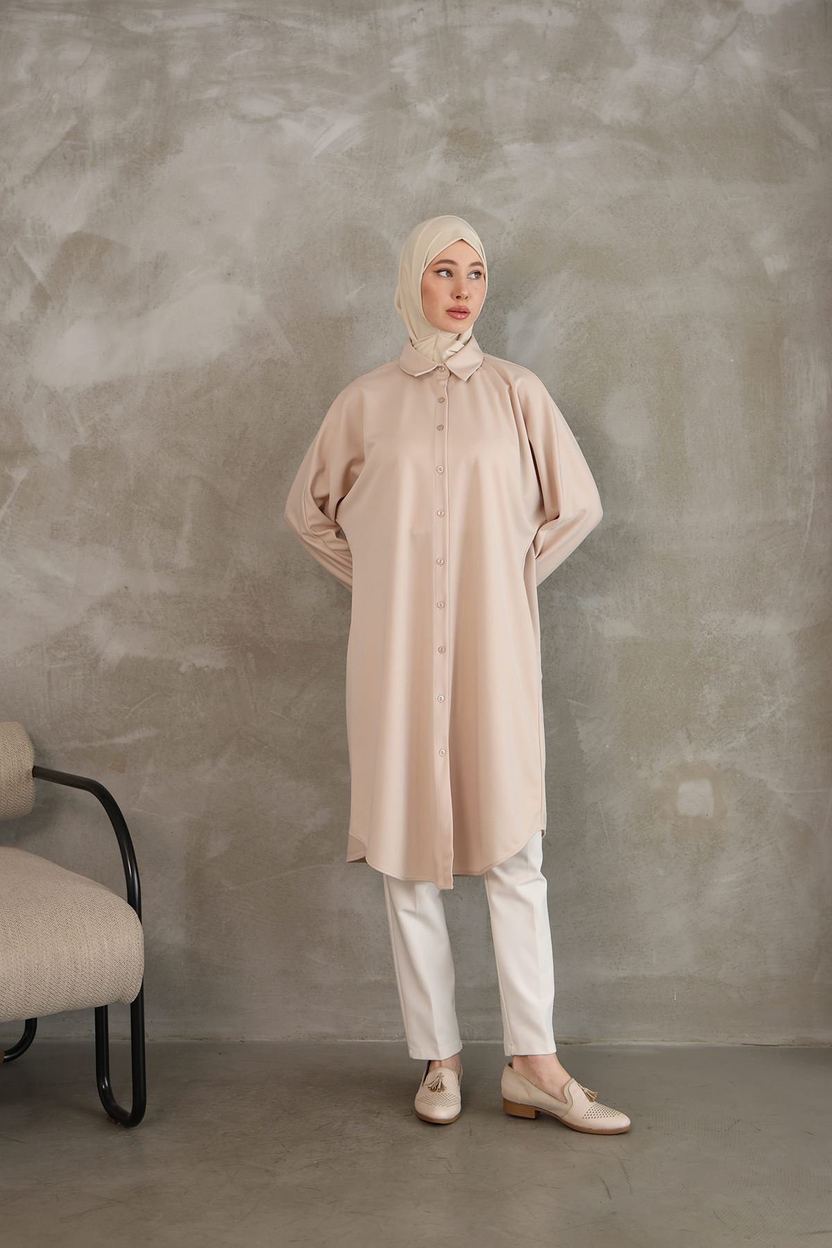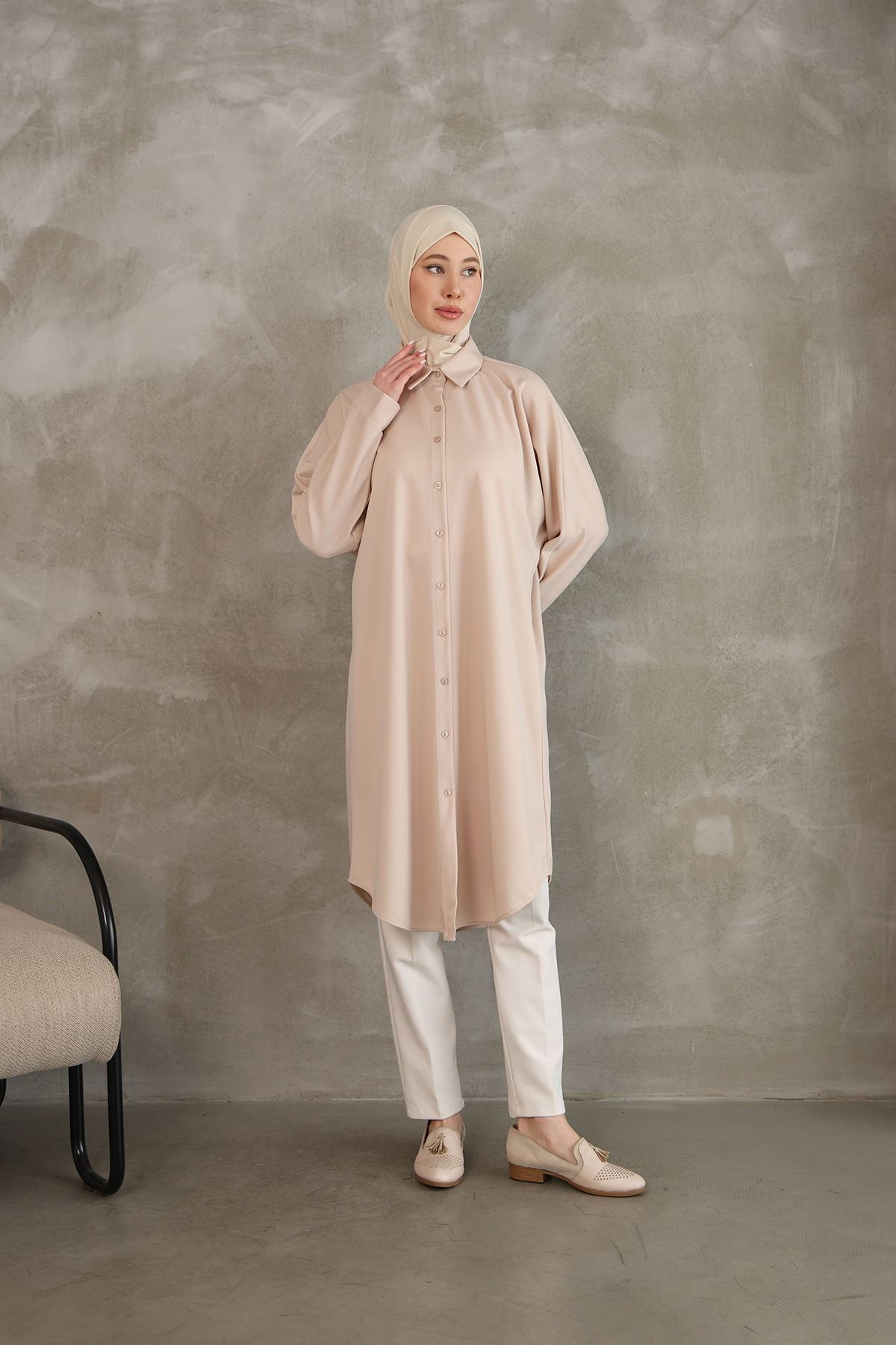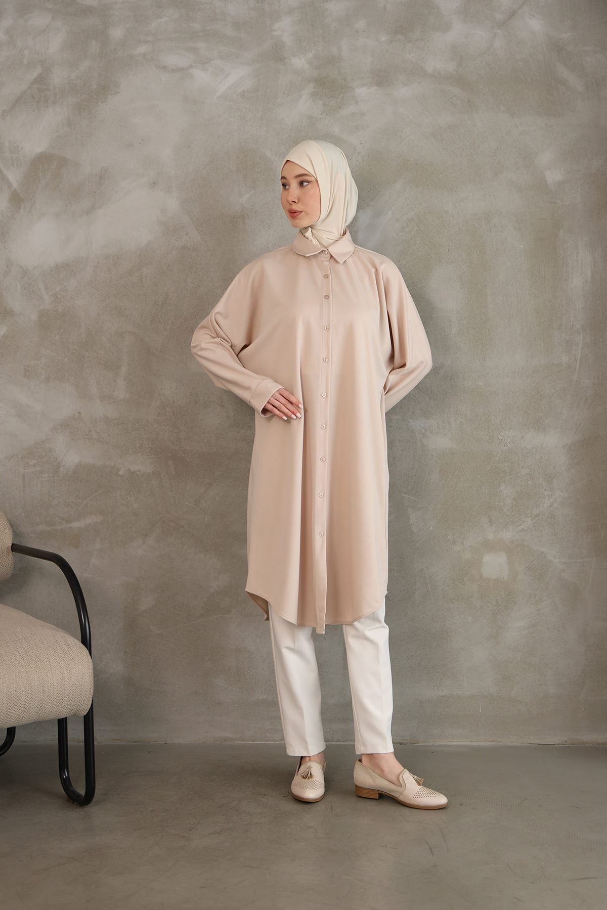 Kadın Oval Kesim Rahat Kalıp Boydan Düğmeli Yarasa Kol Detaylı Uzun Tesettür Tunik-Taş