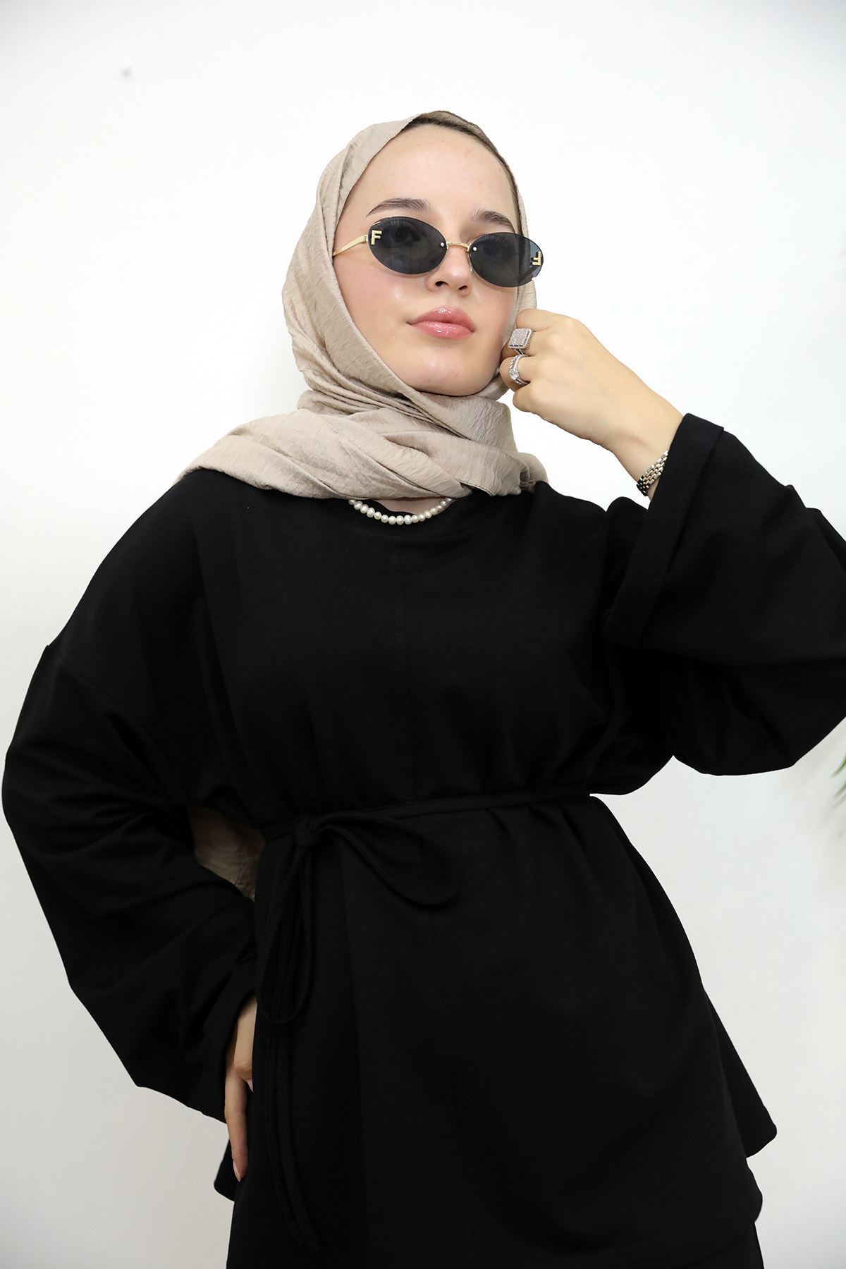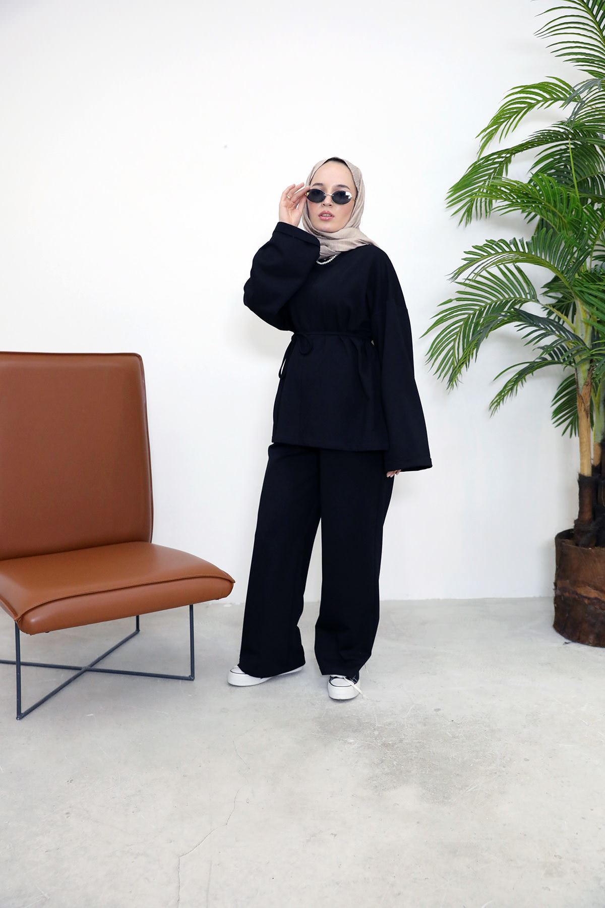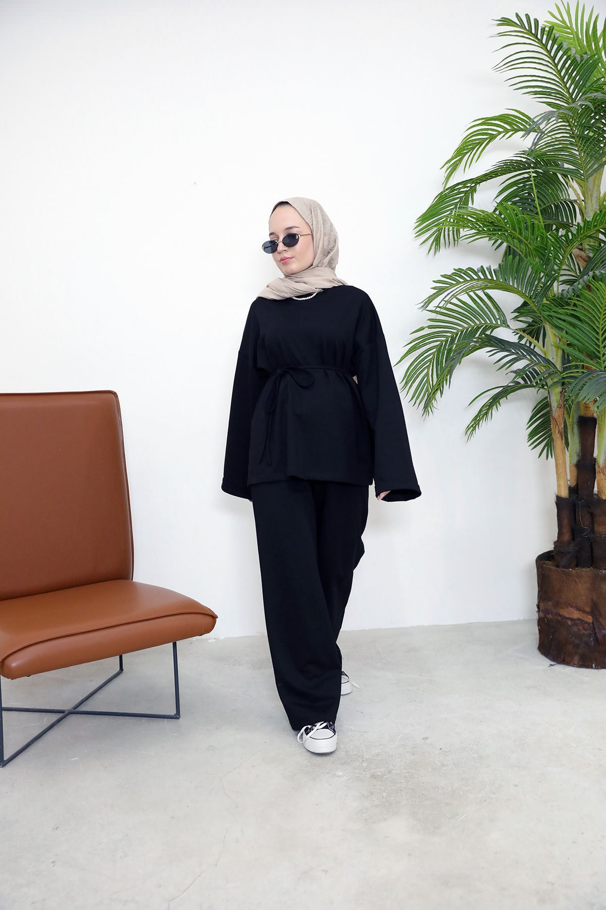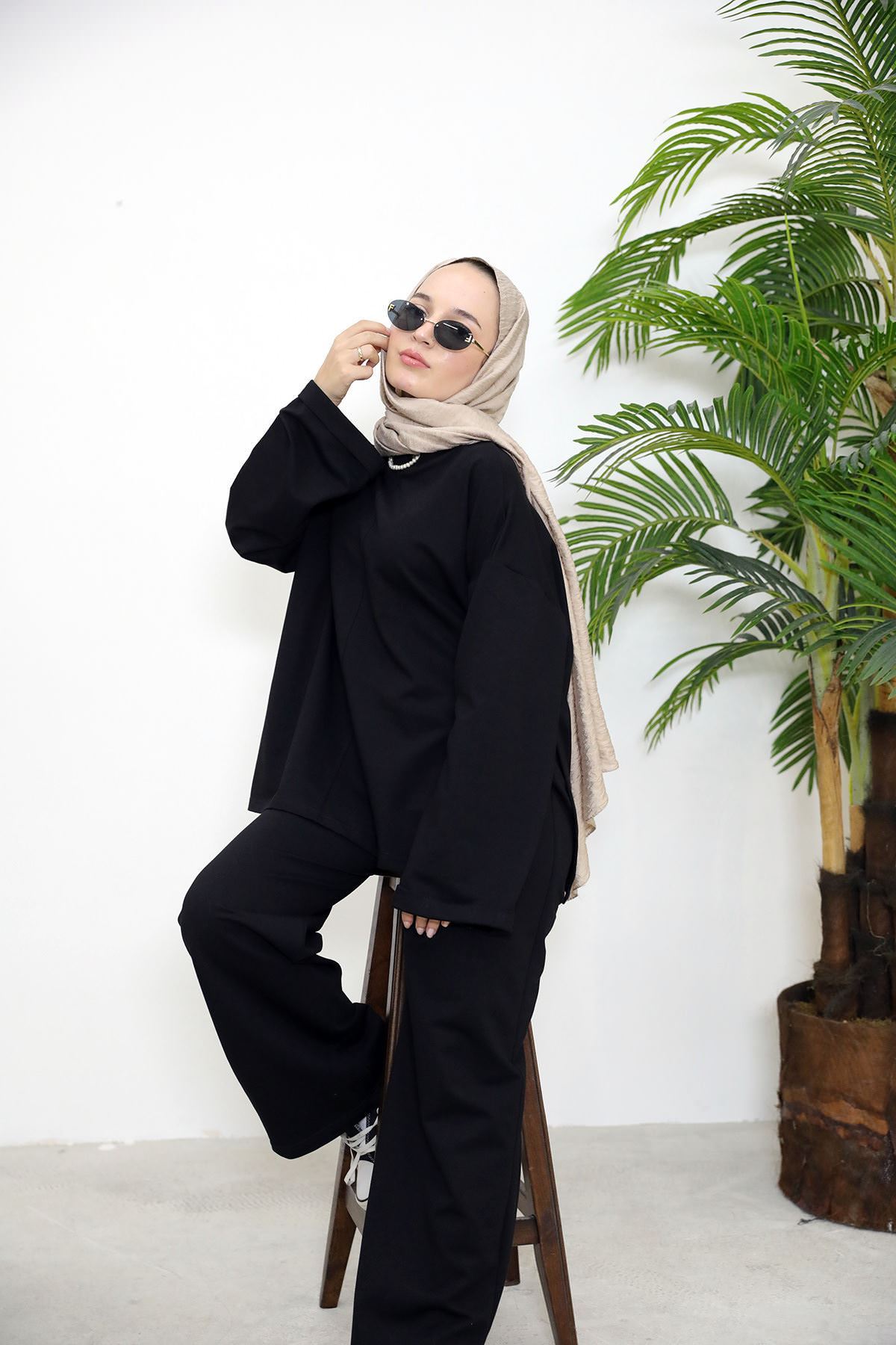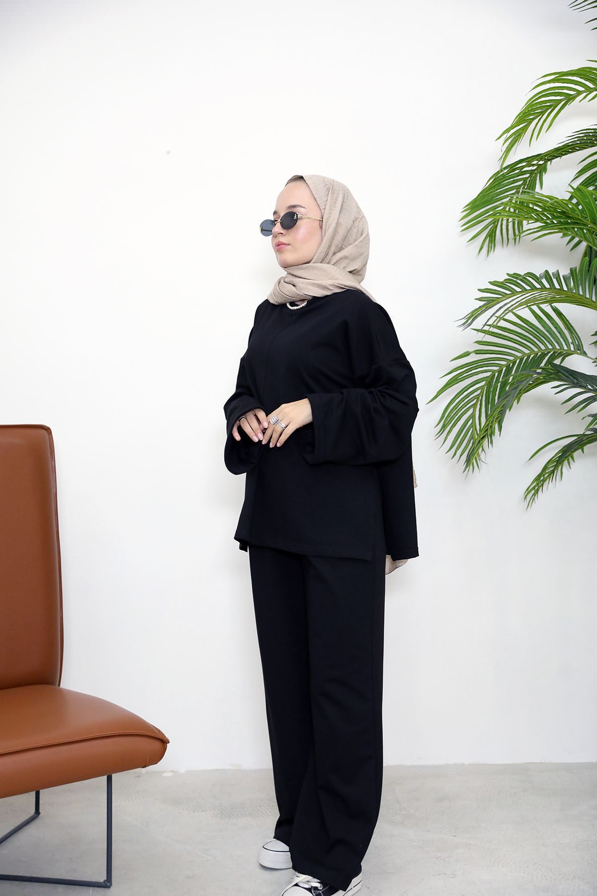 Yırtmaçlı İki İplik Pantolonlu Takım-Siyah